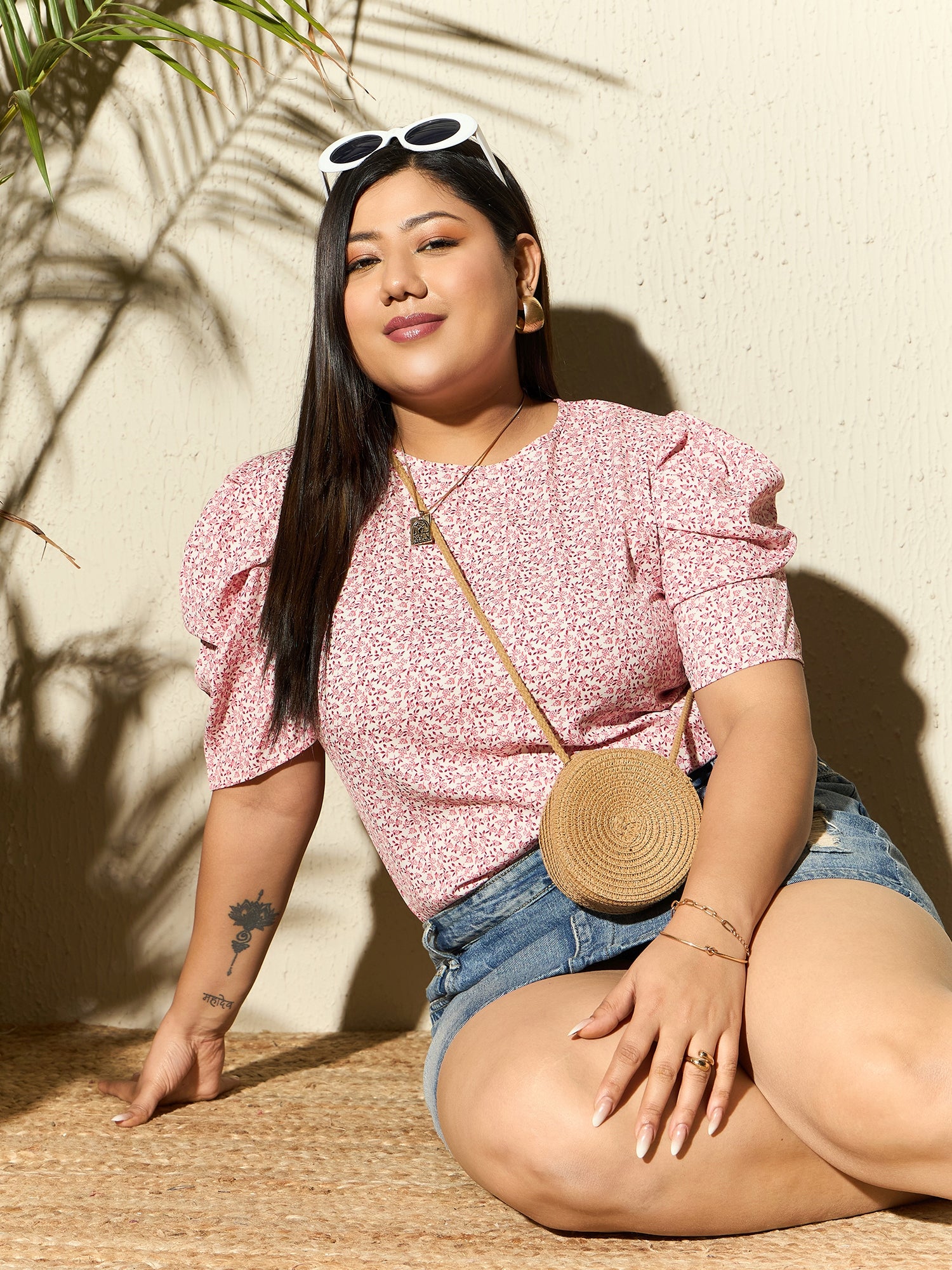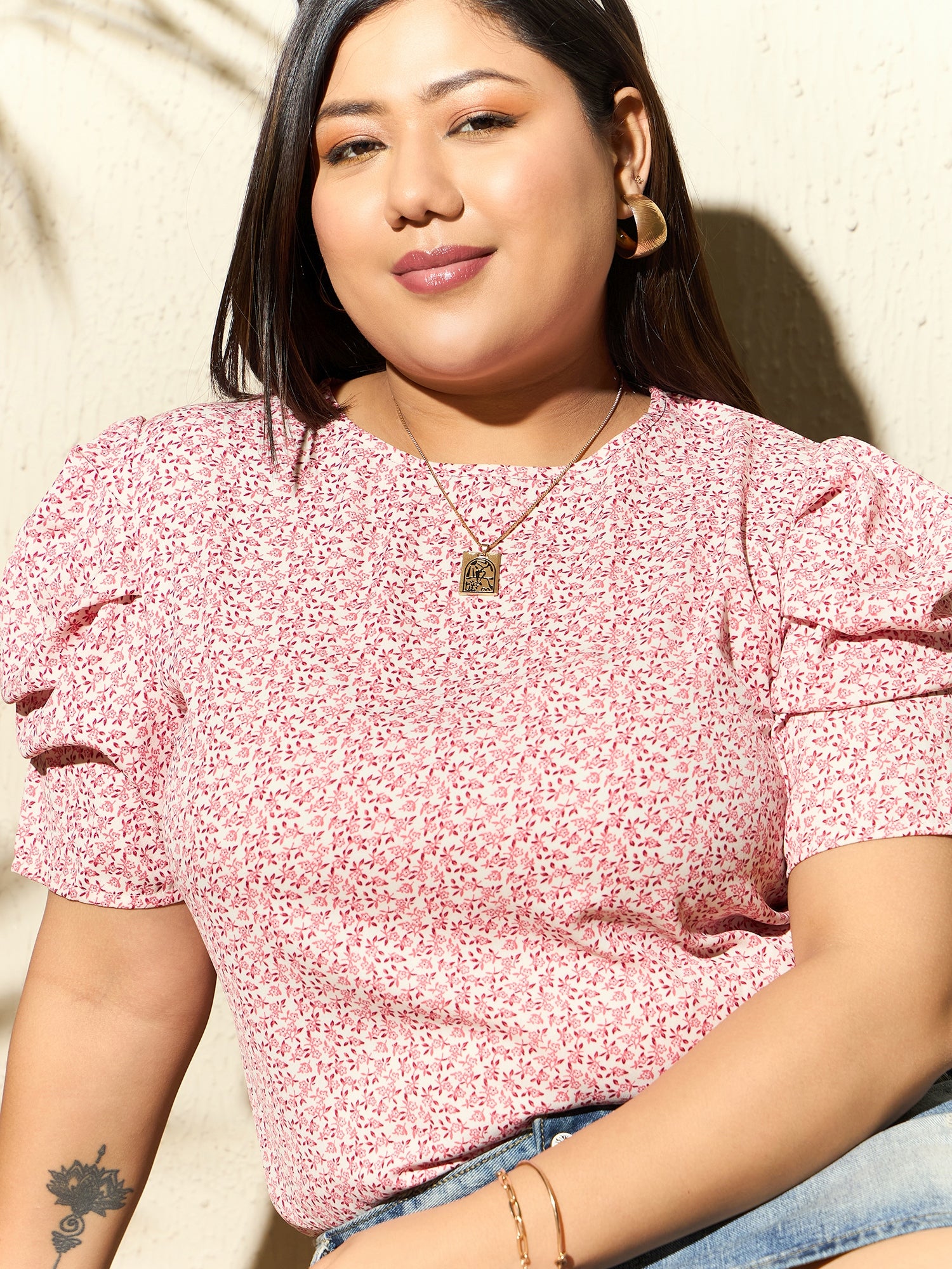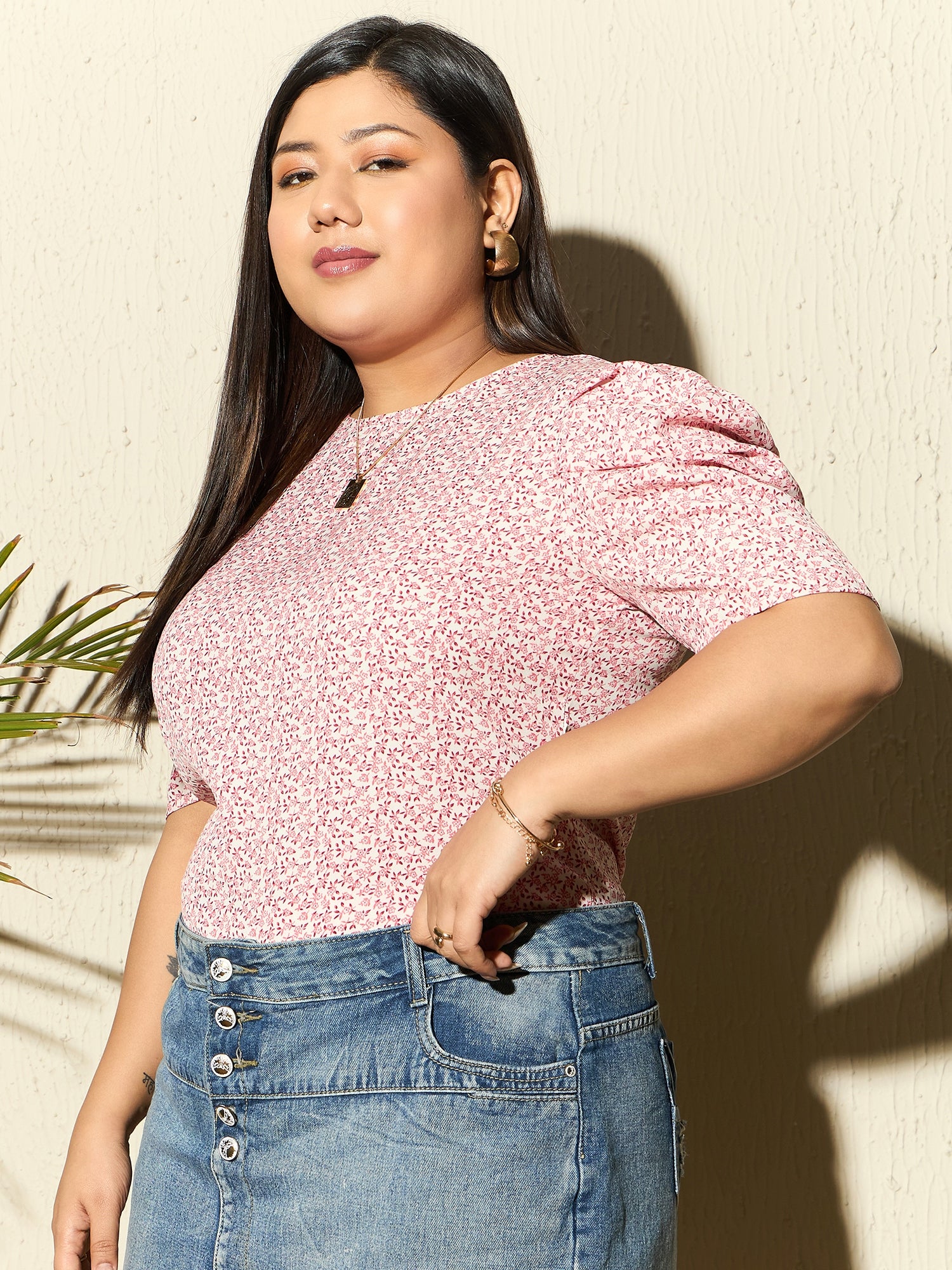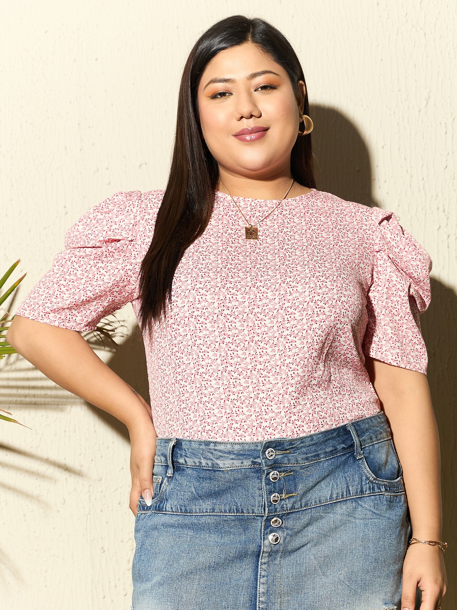 Introducing the charming White & Pink Ditsy Floral Printed Blouse from Berrylush Curve, perfect for infusing a touch of romance into your casual wardrobe. Crafted in soft, breathable polyester with a delicate woven texture, this blouse features playful puff sleeves and an alluring round neckline. The enchanting floral print spreads across a crisp white backdrop with pops of pink accents to complement its refreshing vibe. A quaint back keyhole detail secured by a button closure adds just the right amount of whimsical sophistication to your look. Ideal for daytime outings or relaxed afternoons, it keeps style and comfort in perfect harmony.