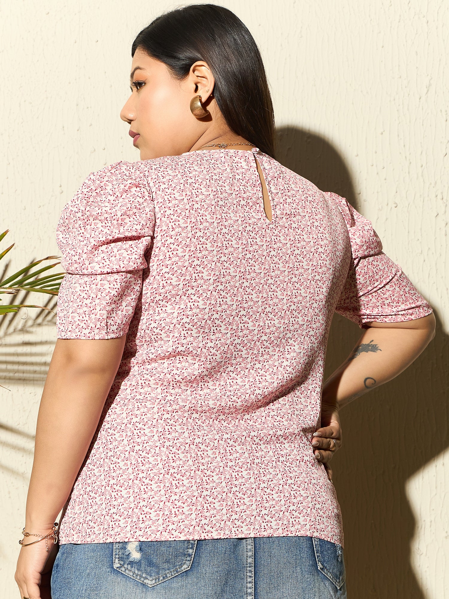 Berrylush Curve Women White & Pink Ditsy Floral Printed Round Neck Puff Sleeves Back Keyhole Regular Blouse