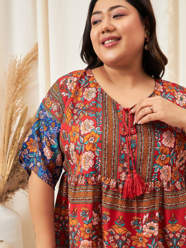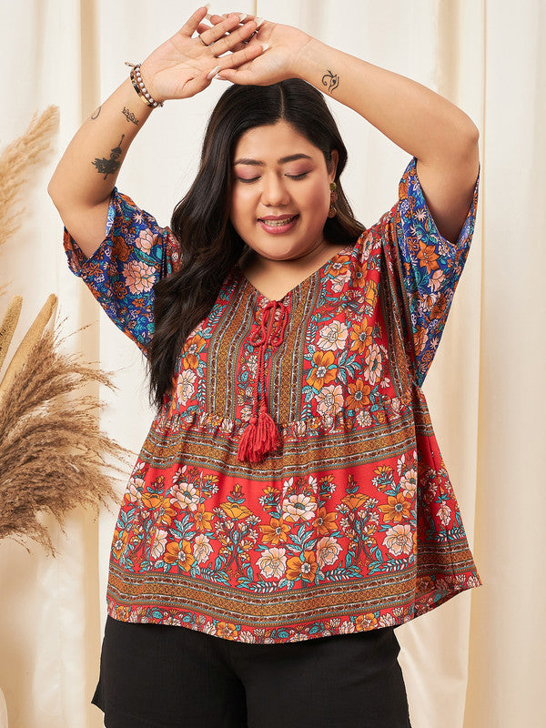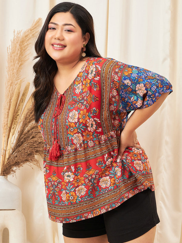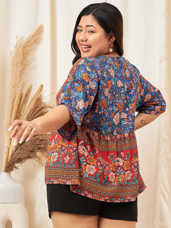 Berrylush Curve Women Blue & Orange Floral Printed V-Neck Short Sleeves Front Tie-Up Regular Top