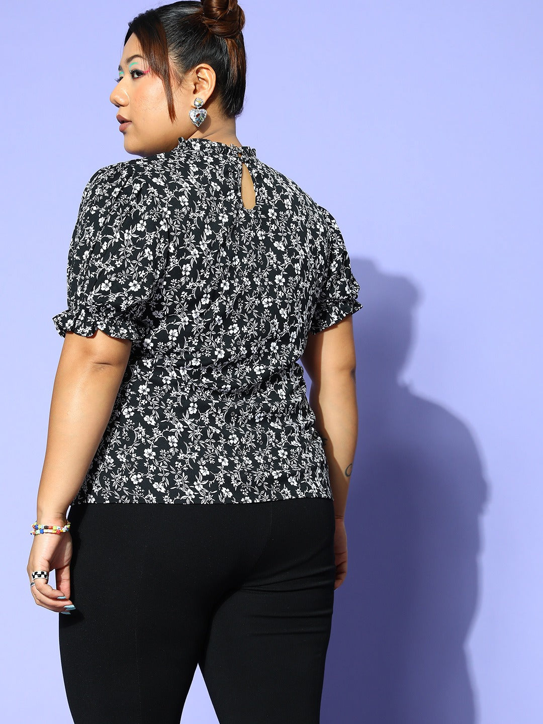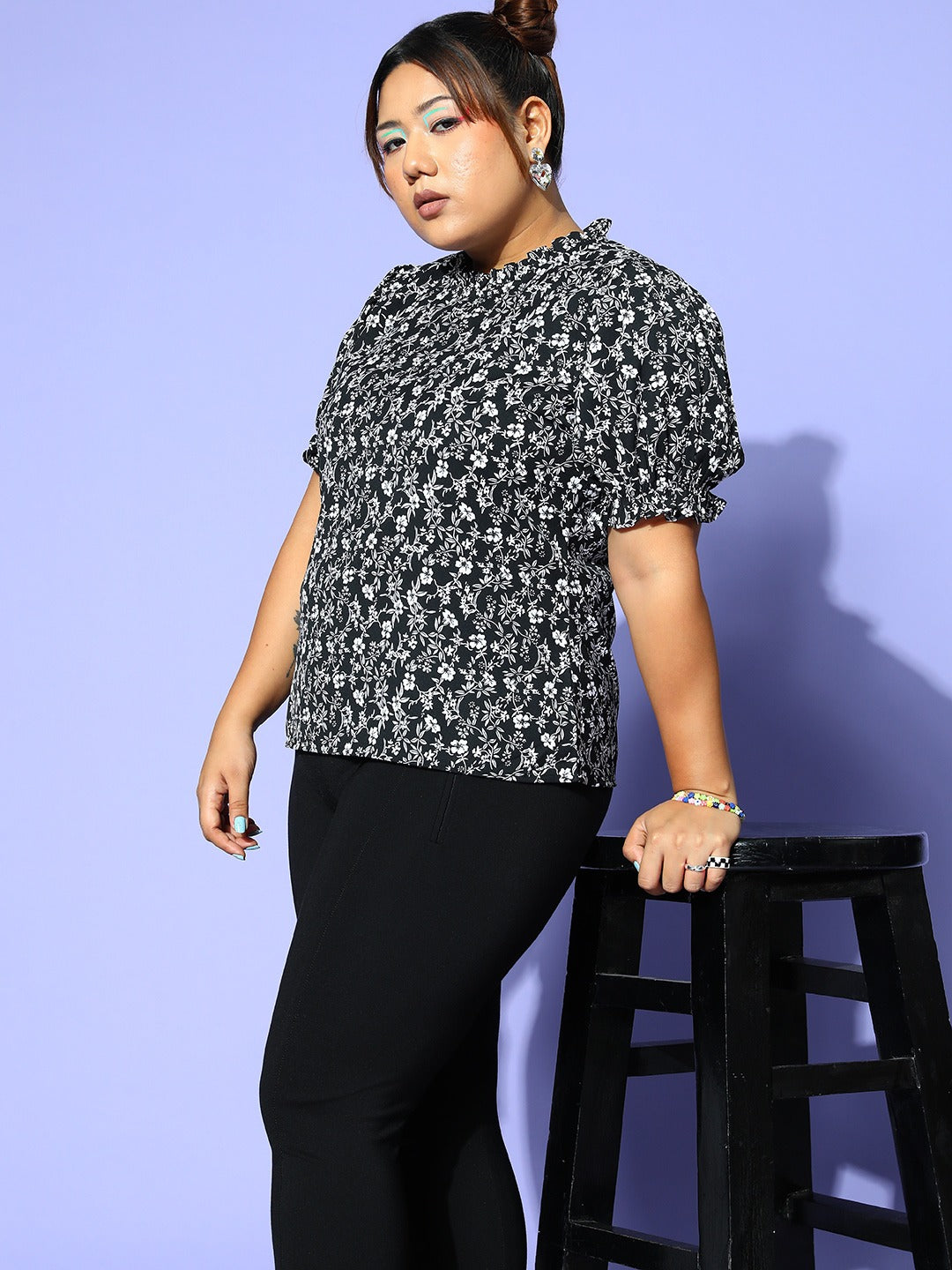 Berrylush Women Plus Size Black & White Floral Printed Round Neck Crepe Pleated Regular Top
