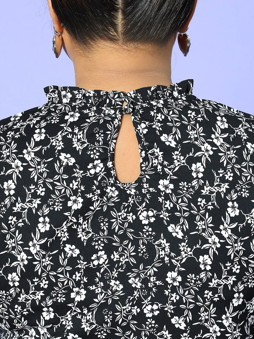 It's time to give your boring casual contingent a classic modern update with this bewitching Black and White Floral Printed Crepe Round Neck Regular Top introduced by Berrylush. Rendered from high-quality crepe polyester fabric that keeps this top super light in weight with the excellent moisture-absorbing feature. Styled in regular length that lends this top is a modest fashion element with a practical design to get you a smart look. In addition, the woven detailing enhances the overall structural integrity of this top with delicate touch and texture. Partner it with your favourite denim jeans, cute hoop earrings, round sunglasses, and a sassy side bag to get a fashion-forward look for your next outing.
