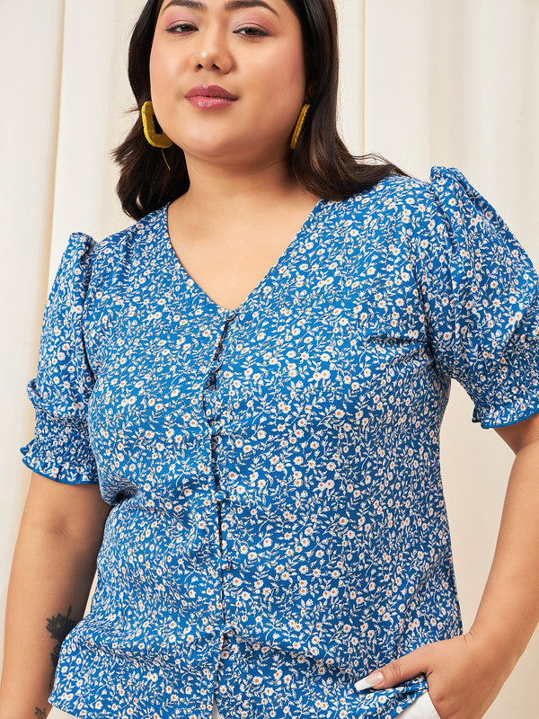 Berrylush Curve Women Blue & White Floral Printed V-Neck Puff Sleeves Button-Up Crepe Smocked Regular Top