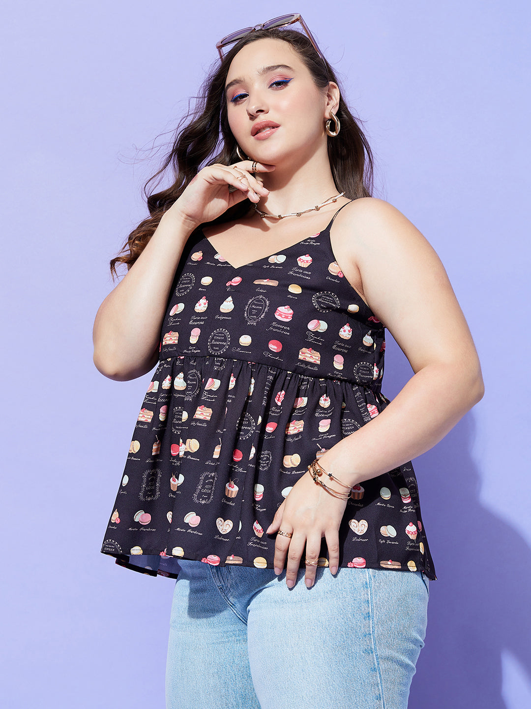 Berrylush Women Plus Size Black Muffin Printed V-Neck Sleeveless Crepe Pleated Empire Top