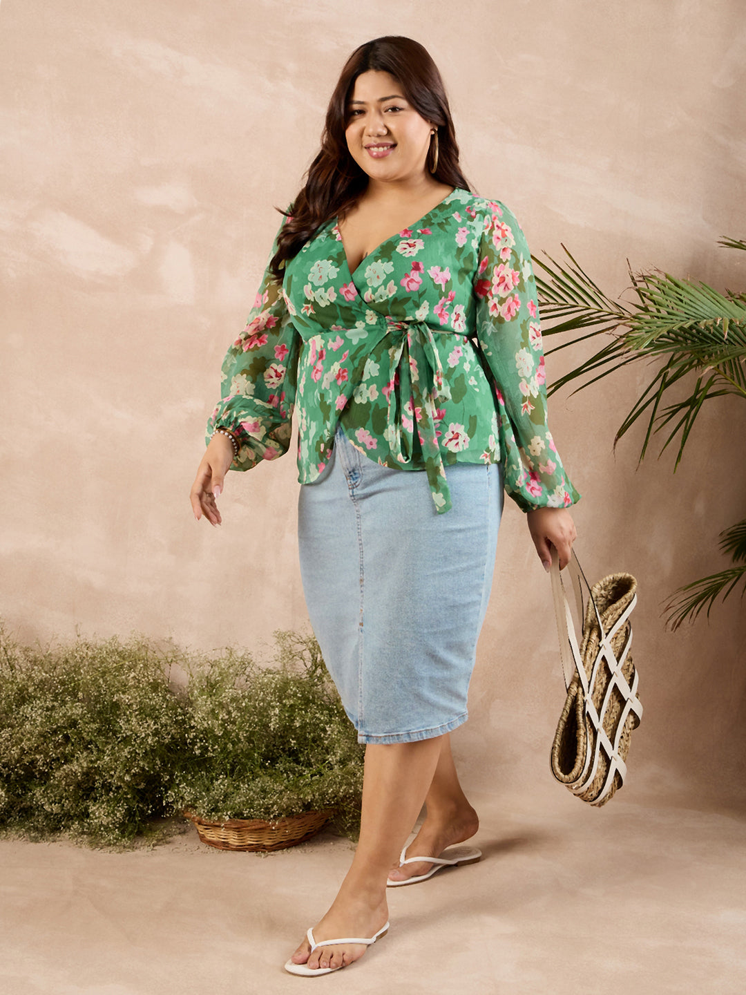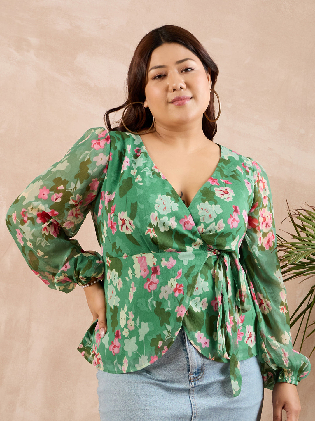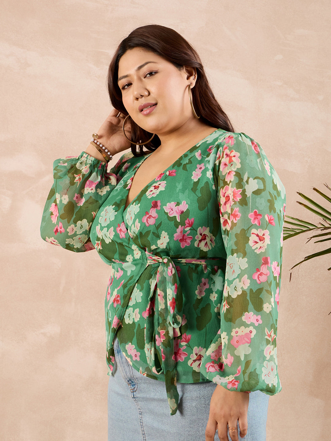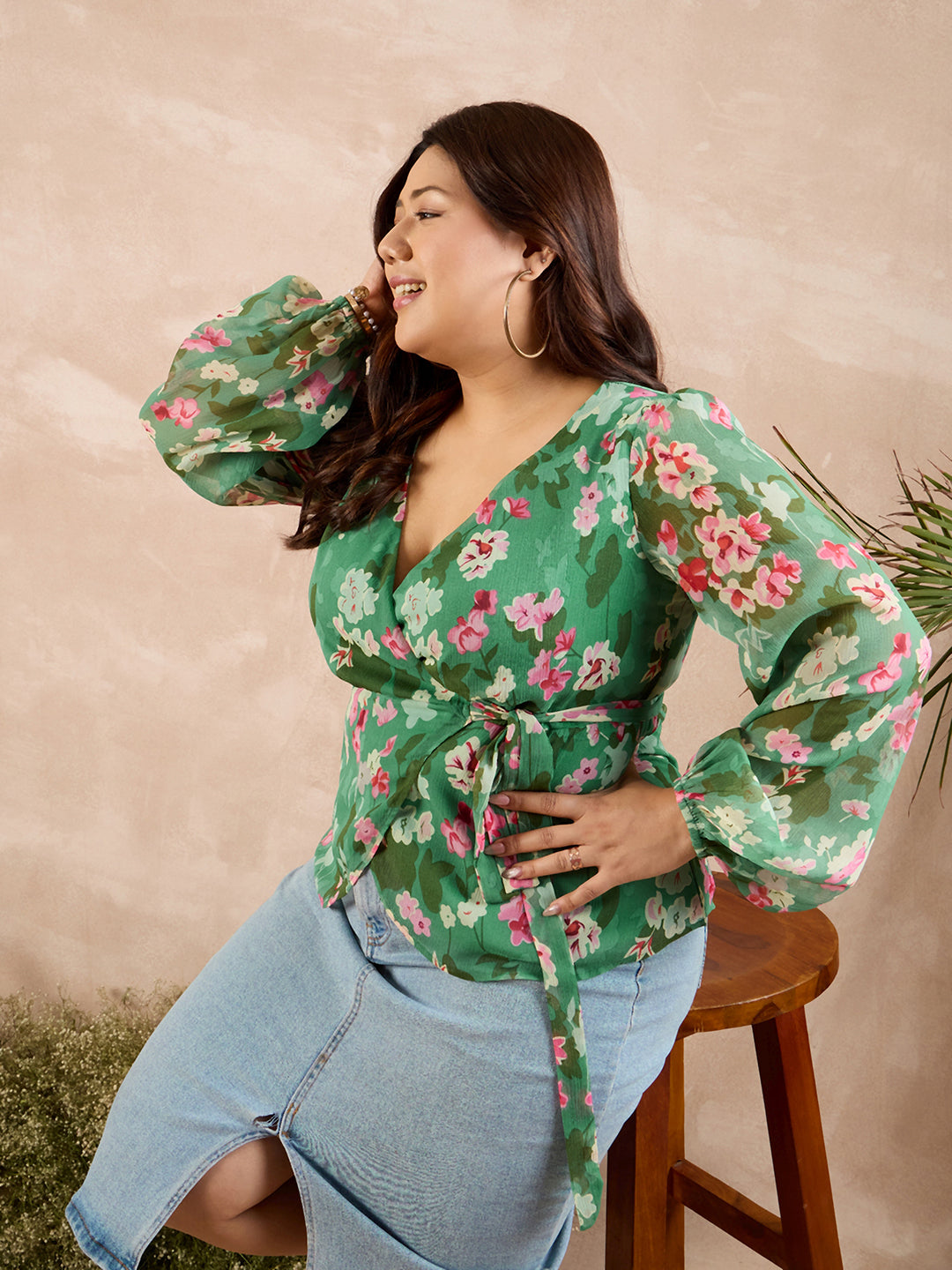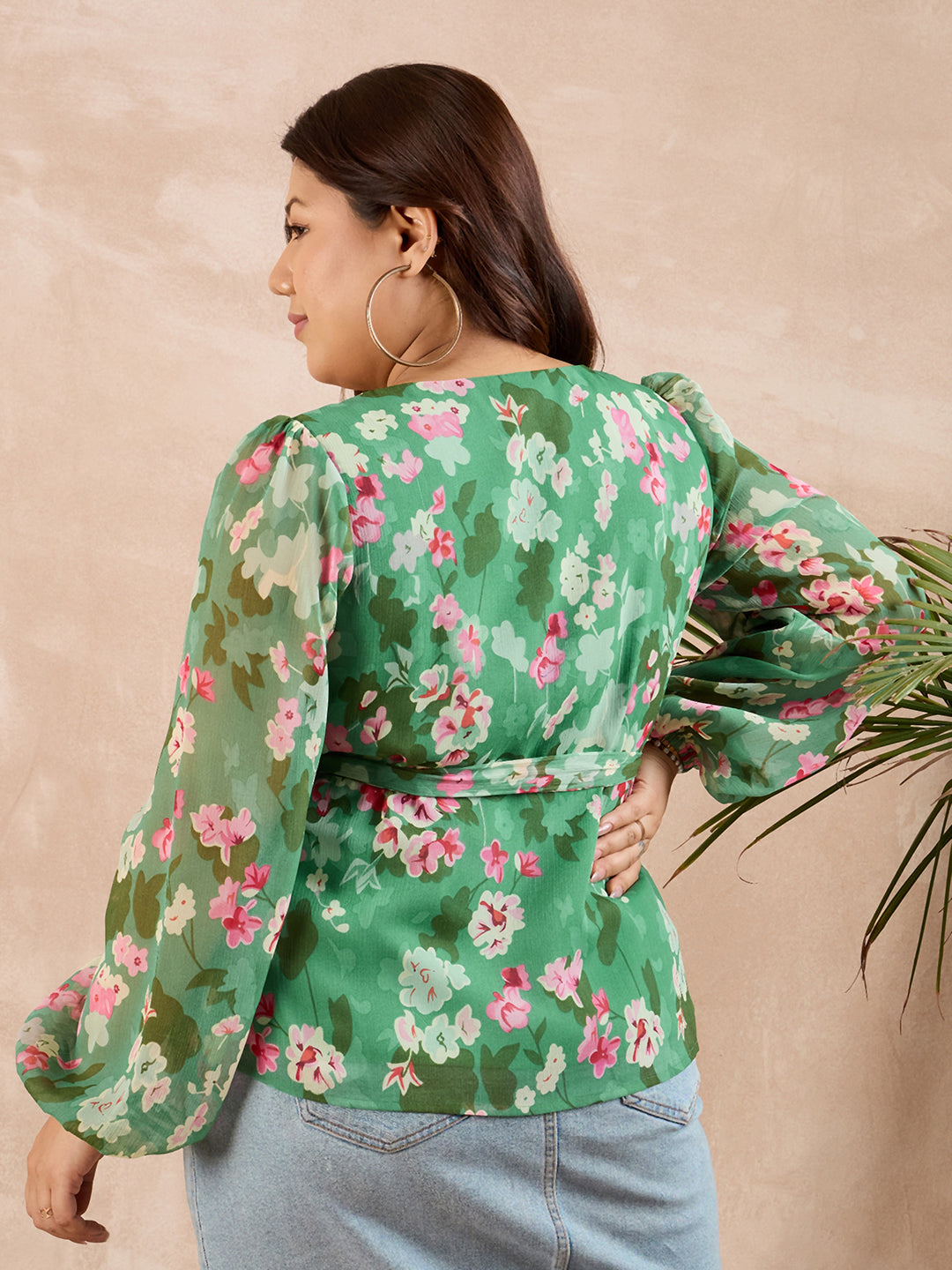 Berrylush Curve Women Green & Pink Floral Printed V-Neck Bishop Sleeves Waist Tie-Up Wrap Regular Top