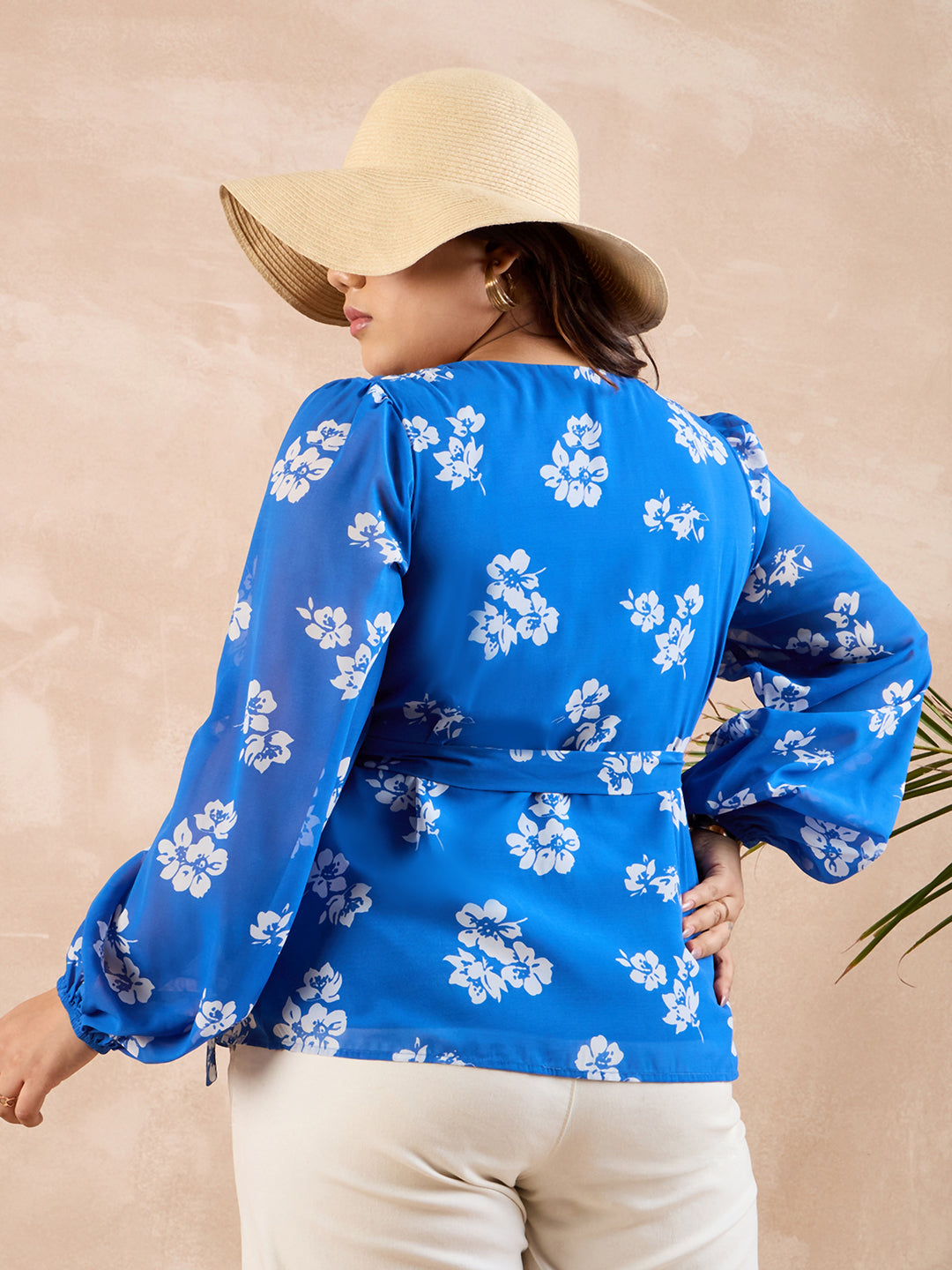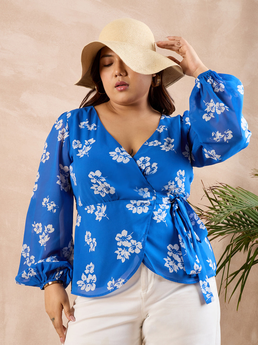 Berrylush Curve Women Blue & White Floral Printed V-Neck Bishop Sleeves Waist Tie-Up Wrap Regular Top