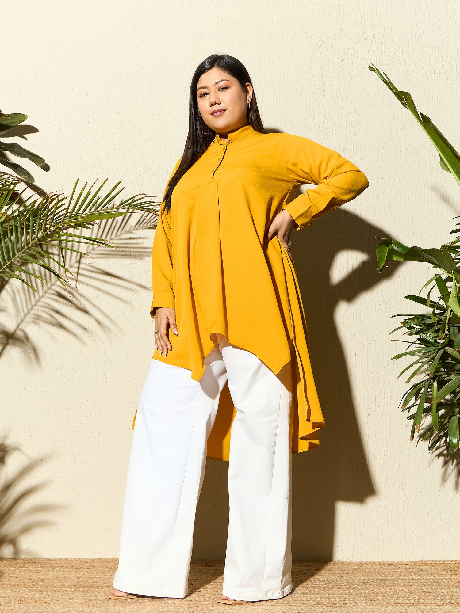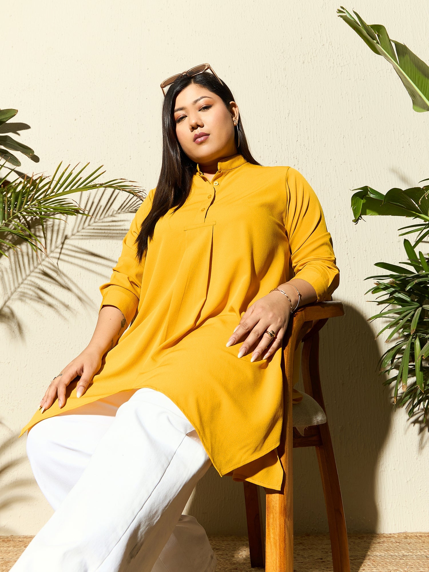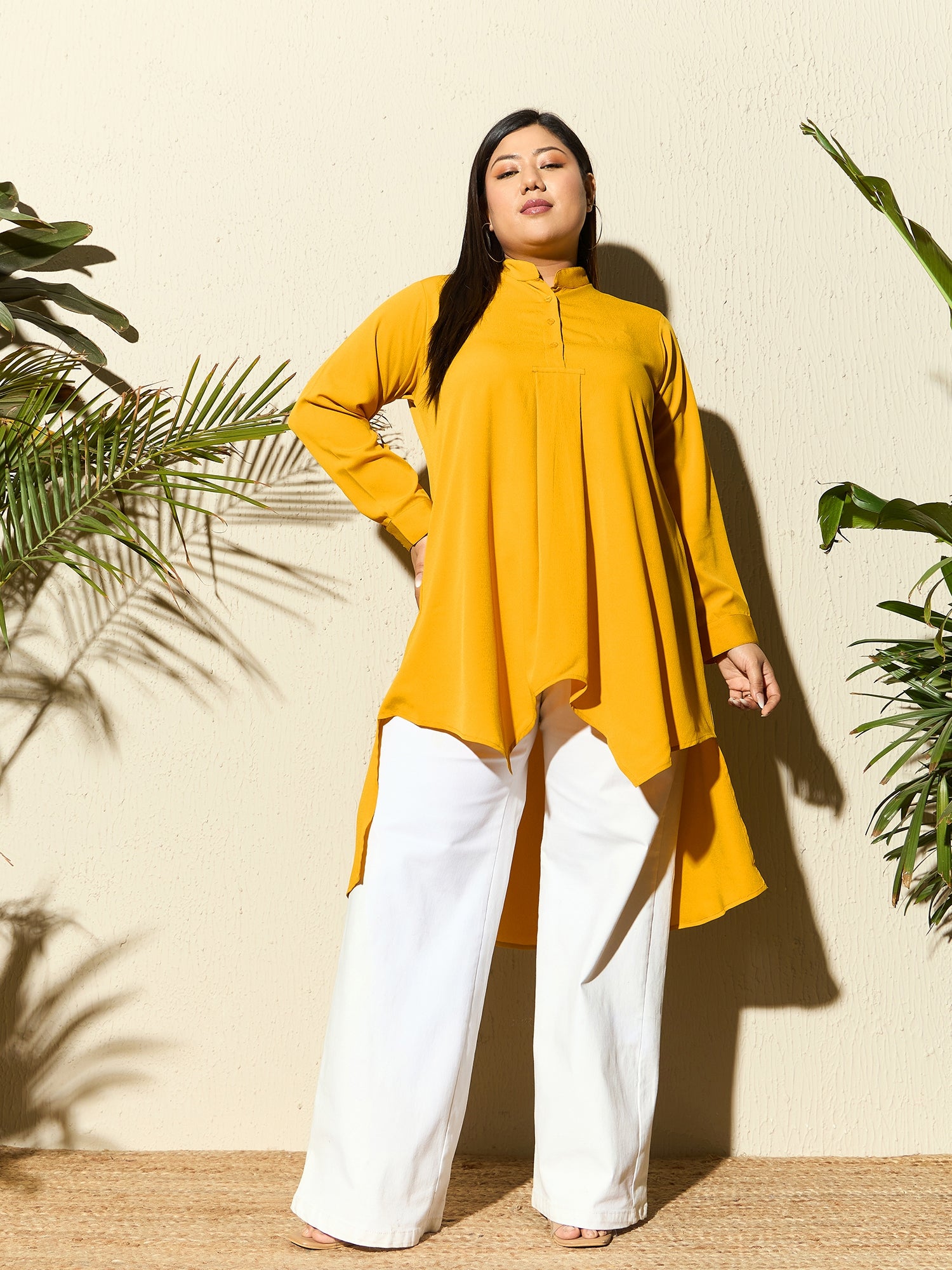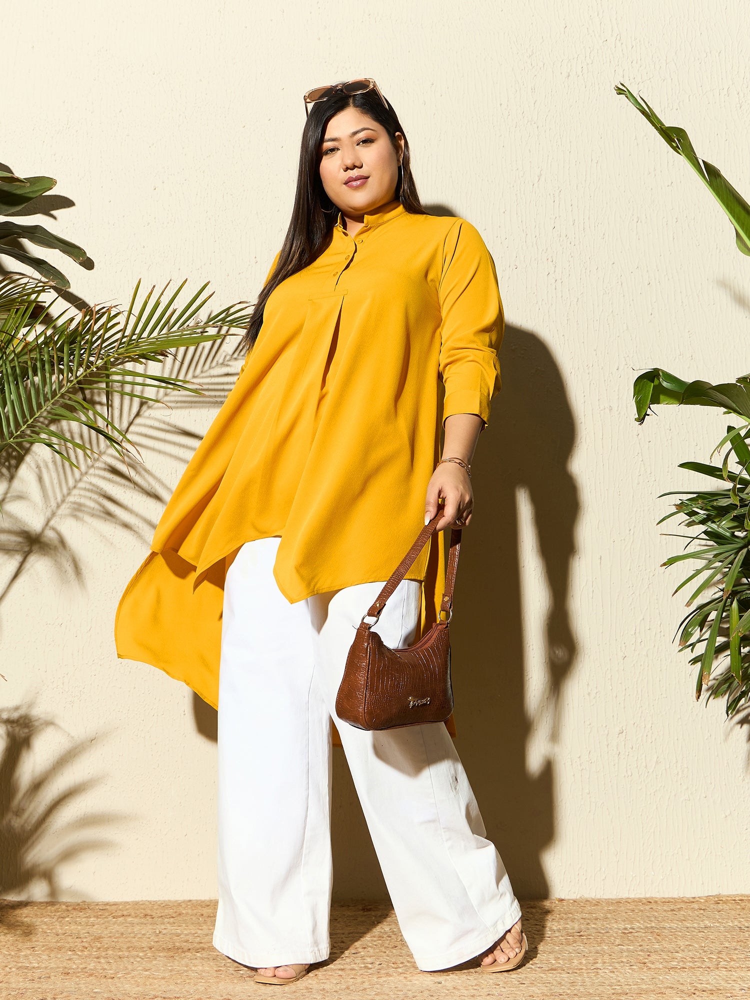 Berrylush Curve Women Solid Yellow Mandarin Collar Neck Cuffed Sleeves High-Low Hem Pleated Longline Top