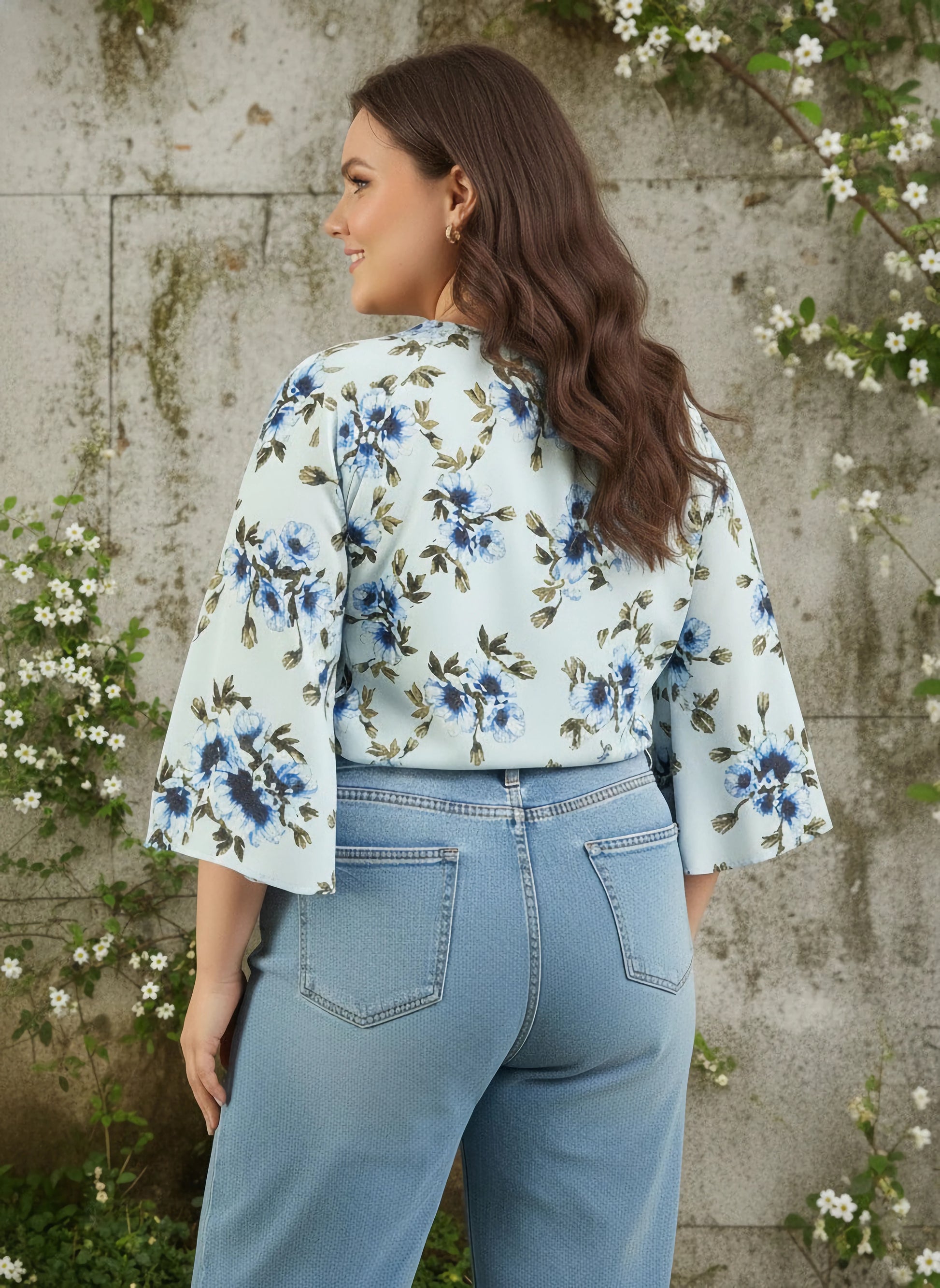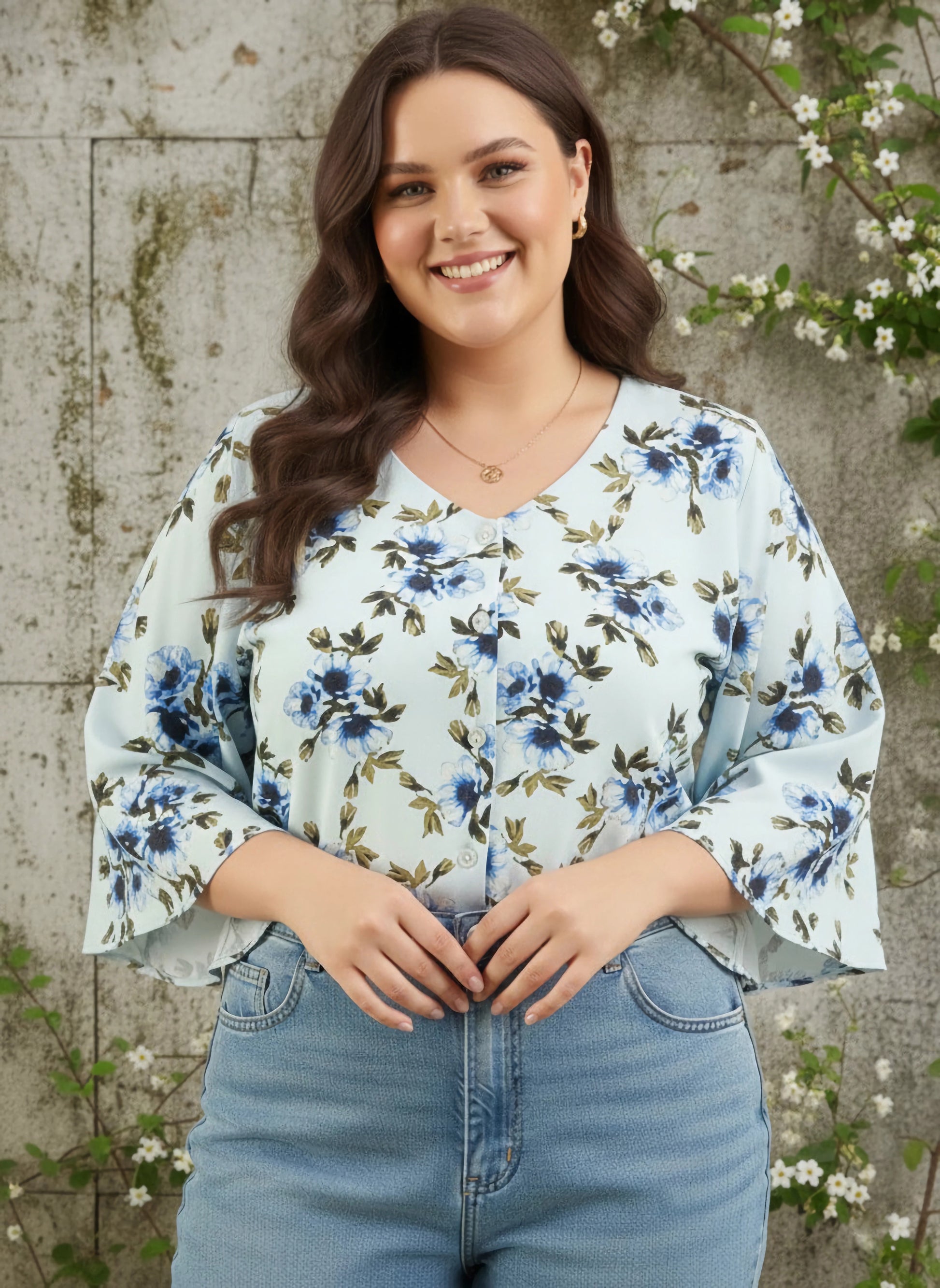 Berrylush Curve Women Green & Blue Floral Printed V-Neck Batwing Sleeves Front Button-Up Regular Top
