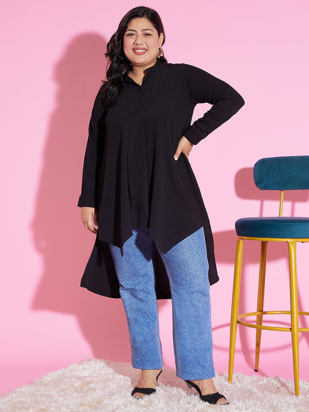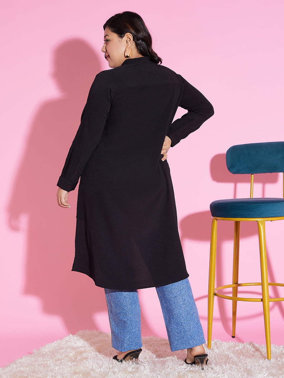 Berrylush Women Plus Size Solid Black Mandarin Collar Neck Flutter Sleeve Crepe Button-Up High-Low Hem Longline Top