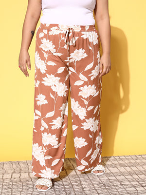 Berrylush Women Plus Size Brown & White Floral Printed Drawstring High-Rise Waist Woven Regular Trousers