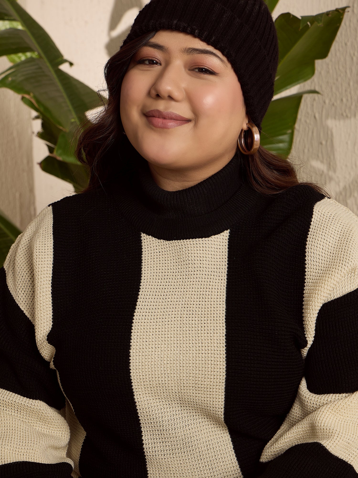 Berrylush Curve Women Black & White Frenchy Two-Tone Printed Round Neck Drop-Shoulder Sleeves Ribbed Hem Regular Sweater