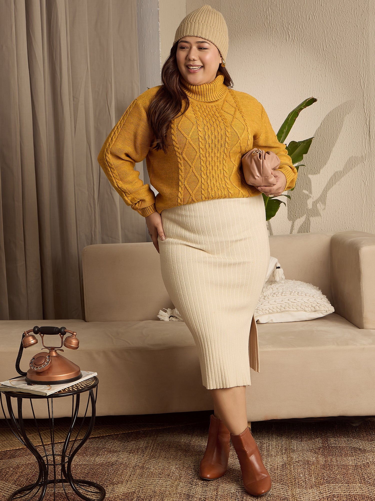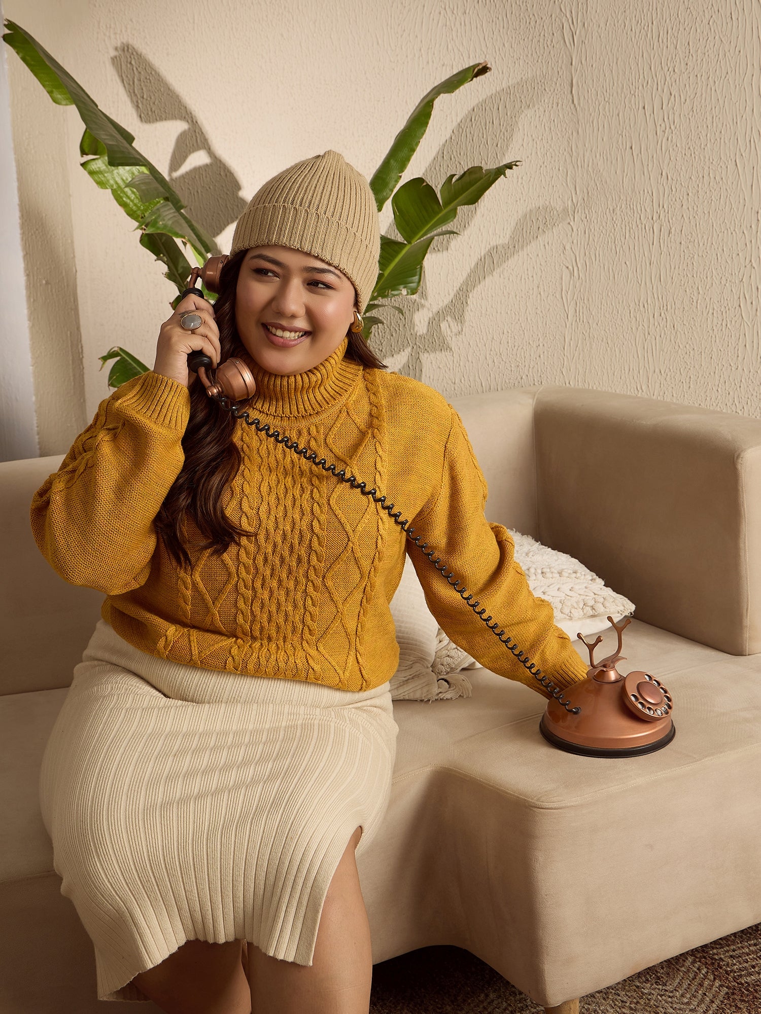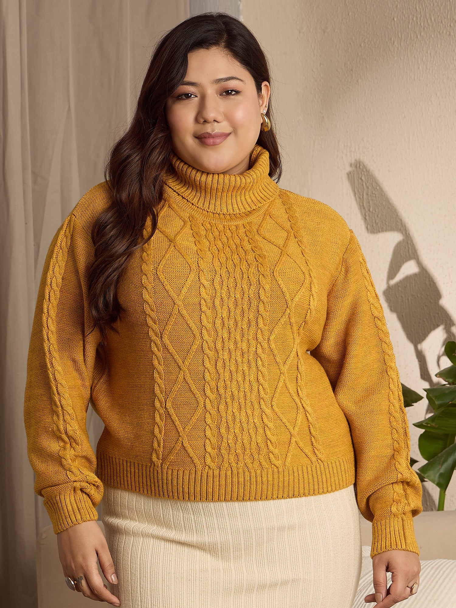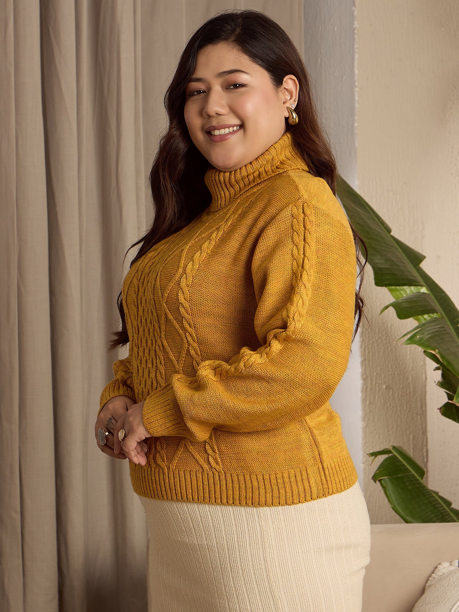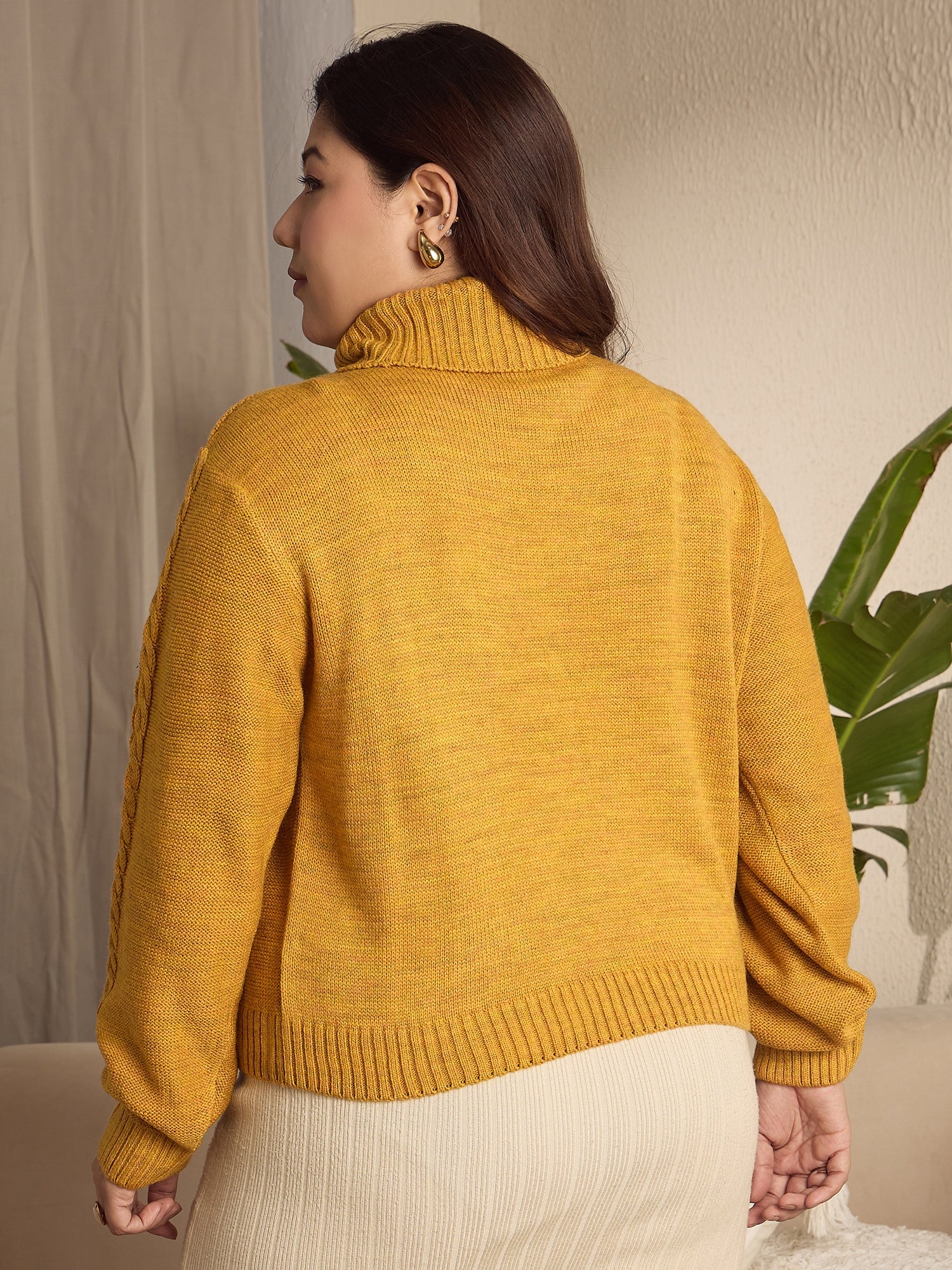 Berrylush Curve Women Solid Yellow Turtle Neck Acrylic Ribbed Hem Cable Knitted Regular Sweater