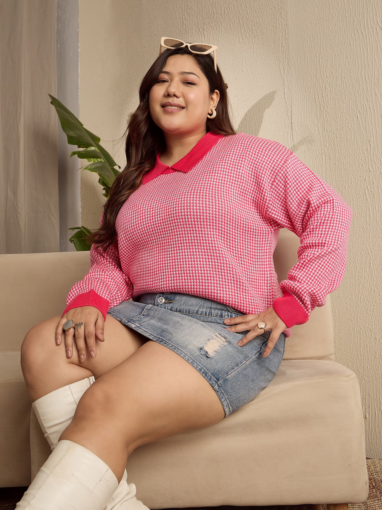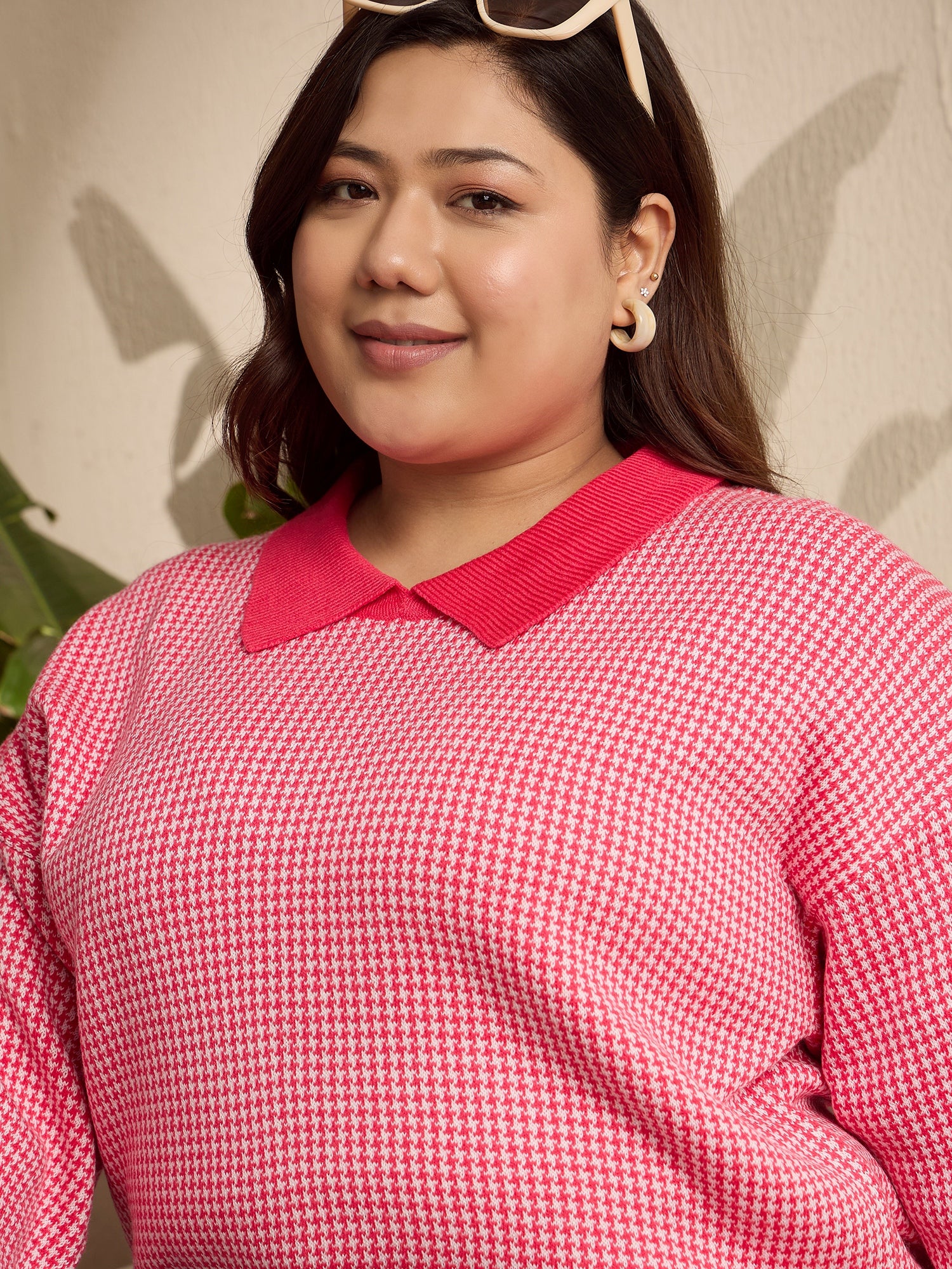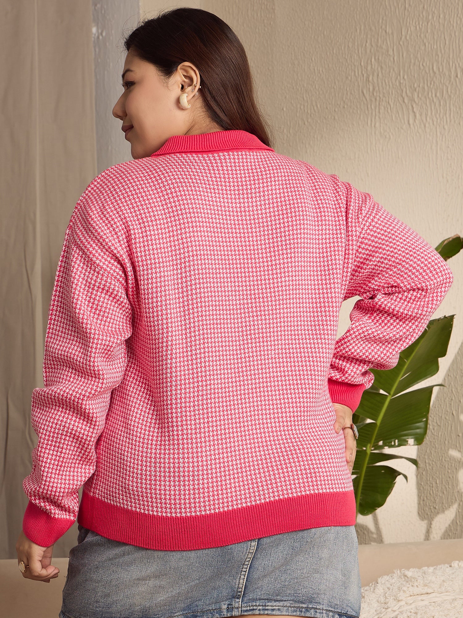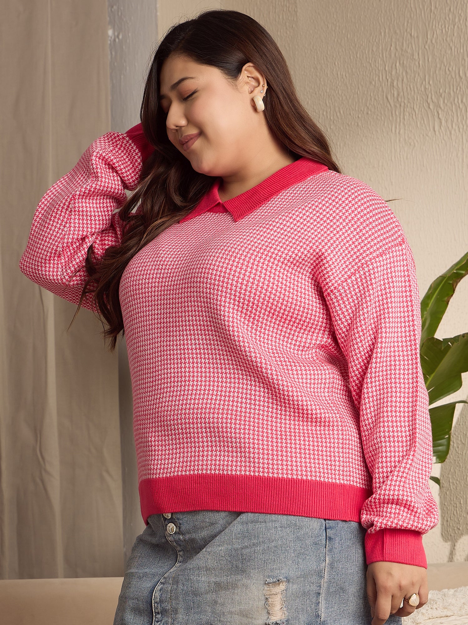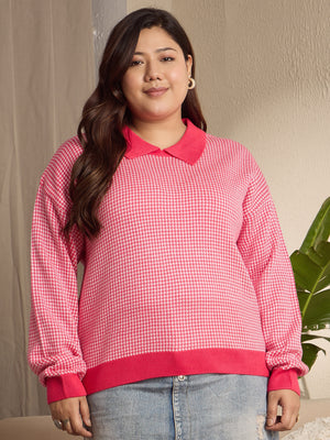 Berrylush Curve Women Red & White Houndstooth Printed Contrast Collar Neck Drop-Shoulder Sleeves Ribbed Hem Regular Sweater