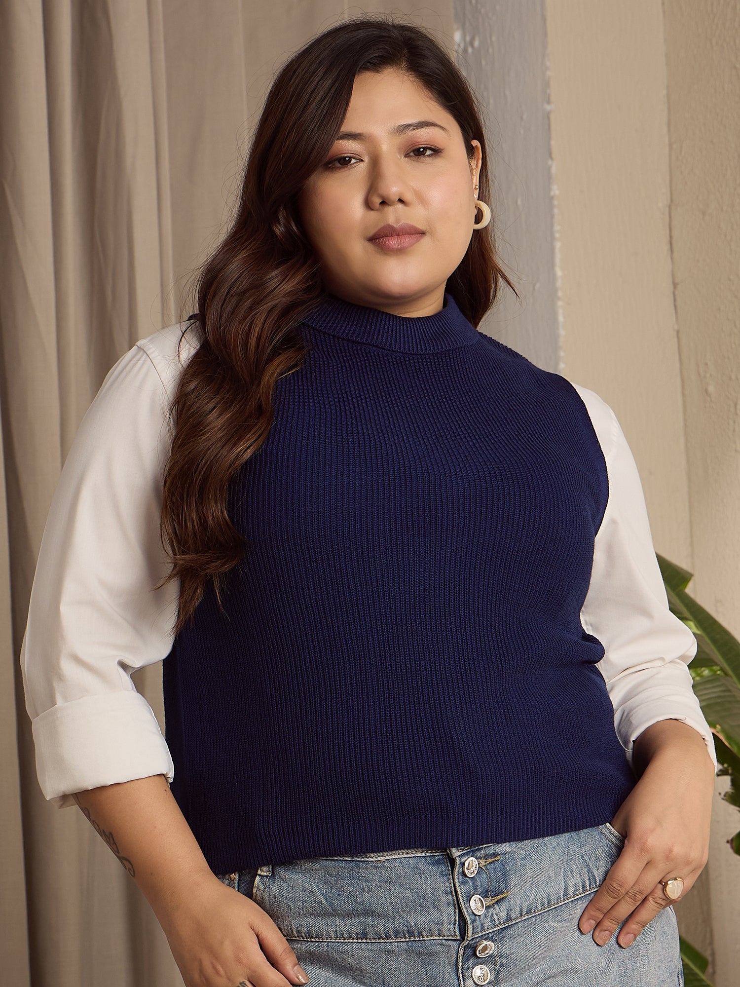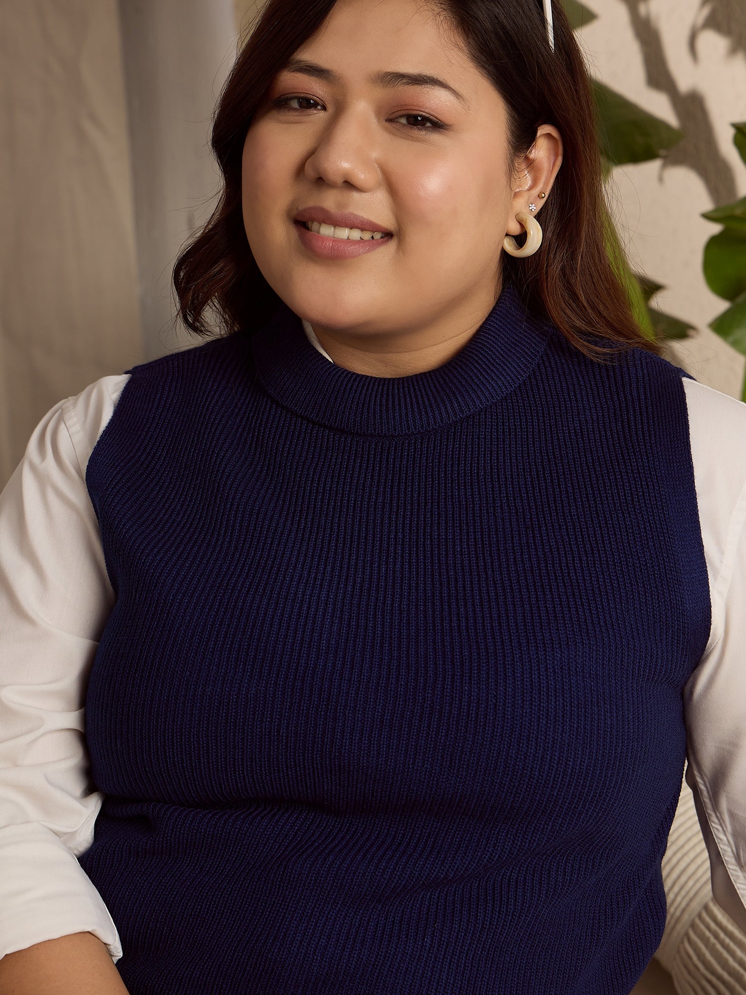 Berrylush Curve Women Solid Navy Blue Turtle Neck Sleeveless Acrylic Straight Hem Regular Sweater
