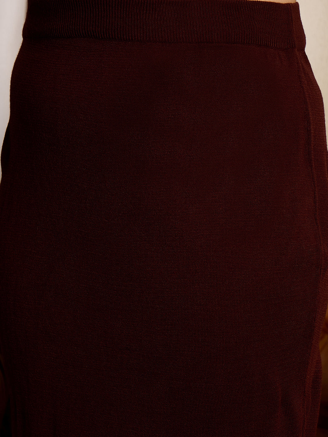Berrylush Curve Women Solid Maroon Round Neck Drop-Shoulder Sleeves Acrylic Straight Hem Knitted Regular Top & Midi Skirt Sweater Co-Ord Set