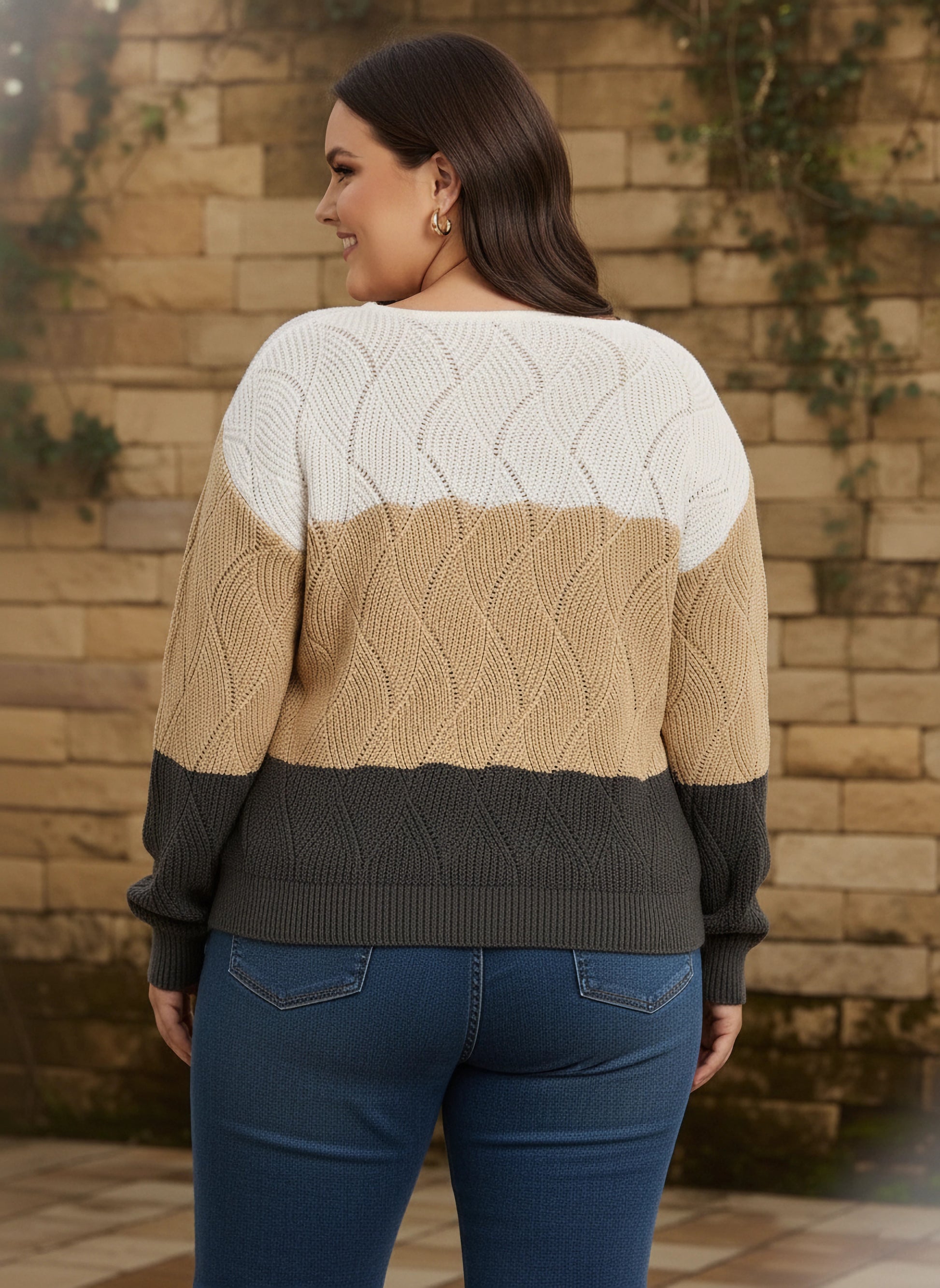 Stay cozy and stylish this season with our trendsetting tri-color sweater from Berrylush Curve. This knitted masterpiece features an elegant boat neckline complemented by contemporary drop-shoulder sleeves. The sophisticated colorblock design in white, beige, and black creates a versatile piece that effortlessly transitions from casual outings to relaxed gatherings. Crafted from premium acrylic, this opaque sweater offers both warmth and comfort. The ribbed hem adds a polished finish while ensuring a flattering fit. Perfect for layering or wearing solo, this regular-length sweater combines modern design elements with timeless appeal.