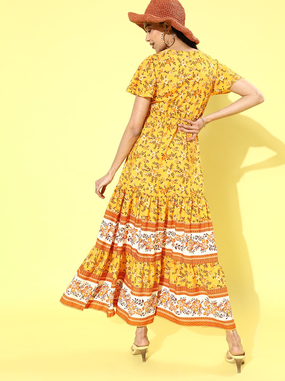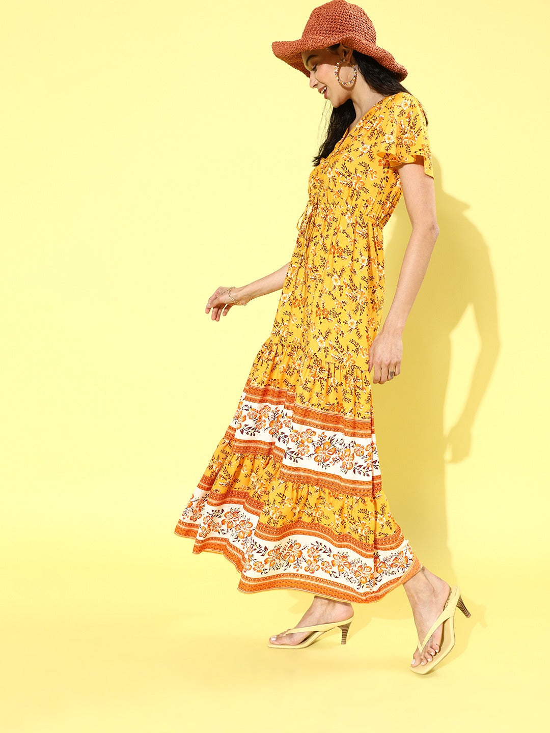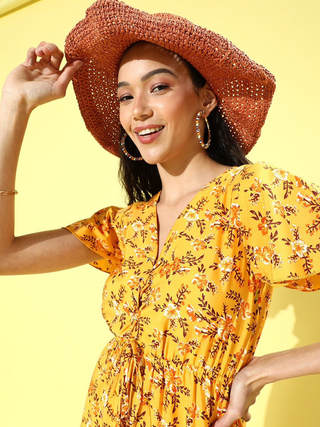 Berrylush Women Yellow Floral Printed V-Neck Grommet Lace-up Ruffled Maxi Dress