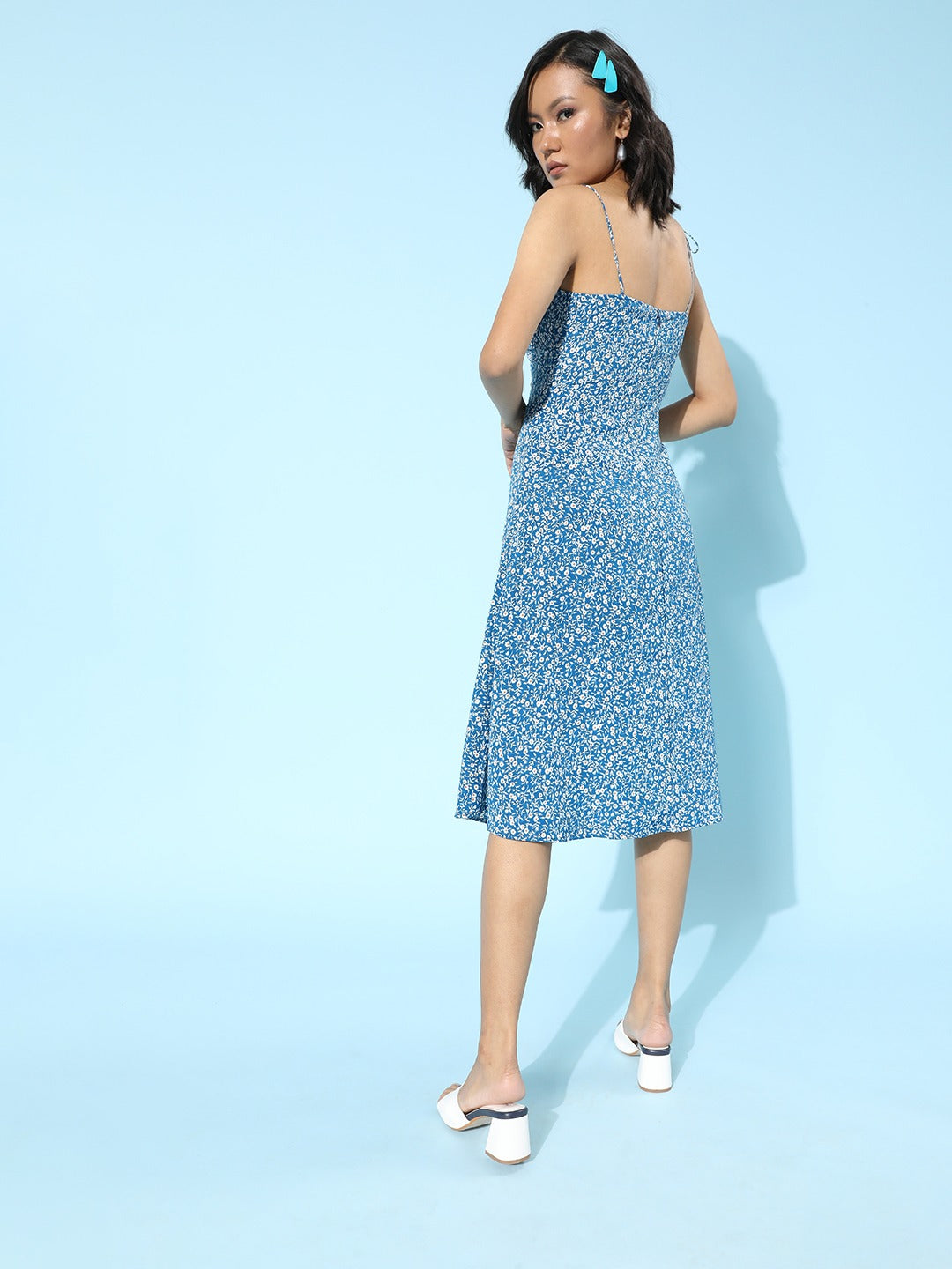 It's time to steal the limelight at any occasion by looking exotic and stylish with this beautiful Blue Floral Printed Sweetheart Neck Tie-Up Strap A-Line Midi Dress from Berrylush. Designed with an A-line shape to give an alluring shape and silhouette to your natural curves. The adjustable shoulder straps offer you convenient fitting while the tie-up surface styling adds a garnishing sheen to this dress. Moreover, the amusing combination of blue shade with a pretty floral print gives away a calming and cheerful vibe to your casual look. You can partner up this gorgeous floral printed dress with a pair of high heels, minimal silver jewellery, and a side bag to create a fashion-forward look.