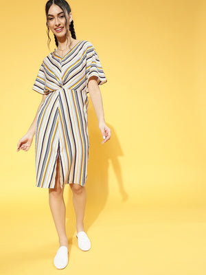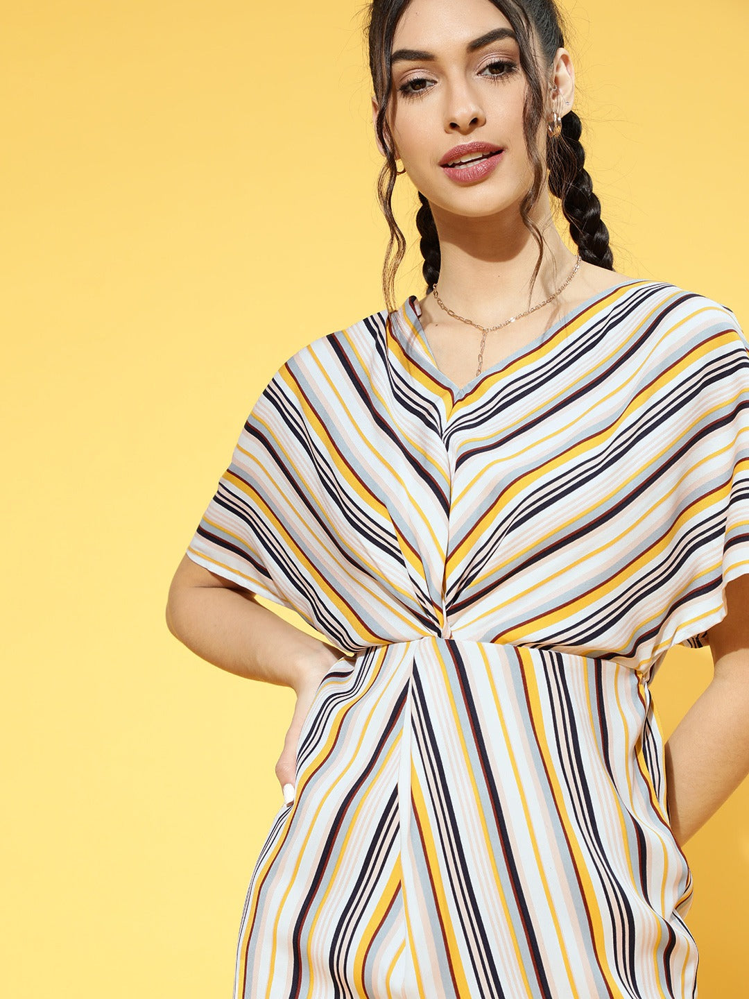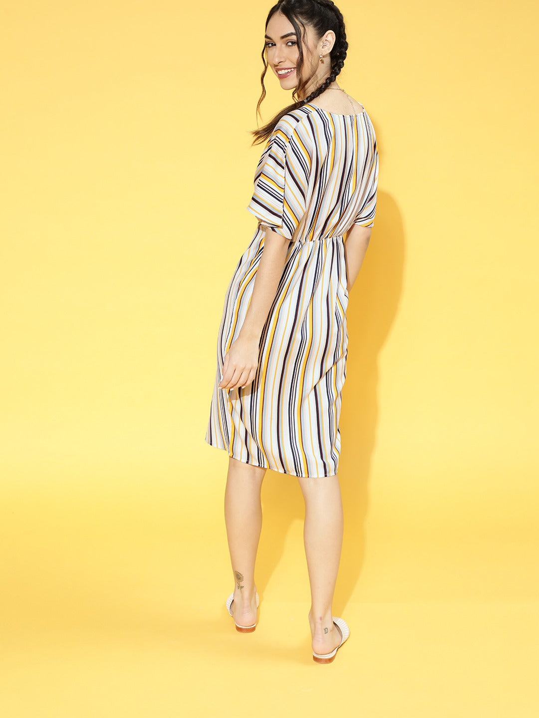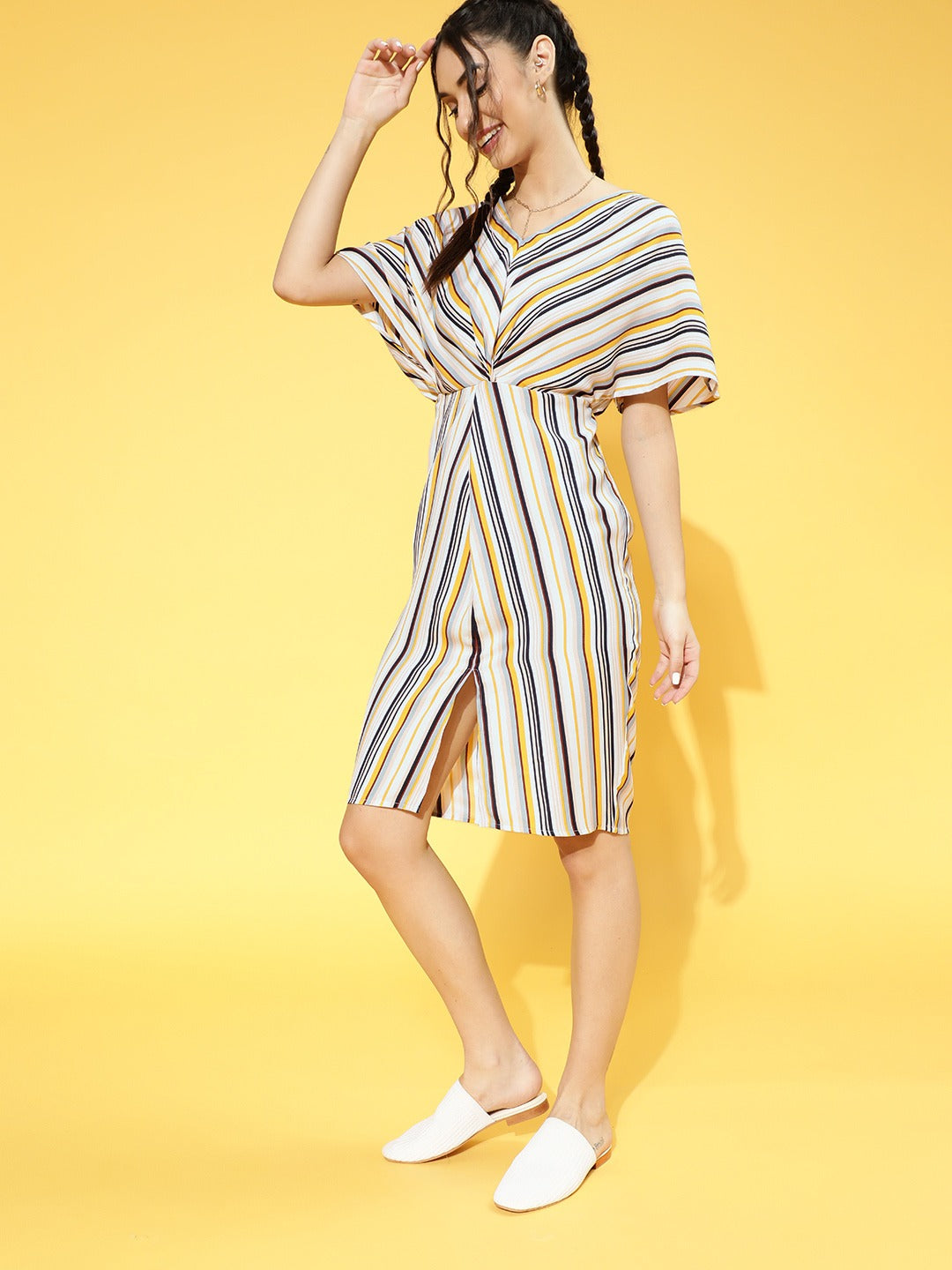 Berrylush Women Yellow & Off-White Stripe Printed V-Neck Front Slit Pleated A-Line Mini Dress