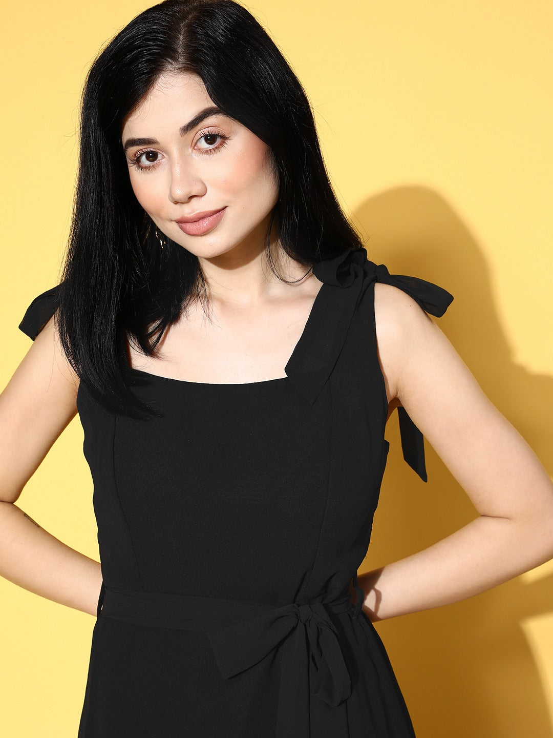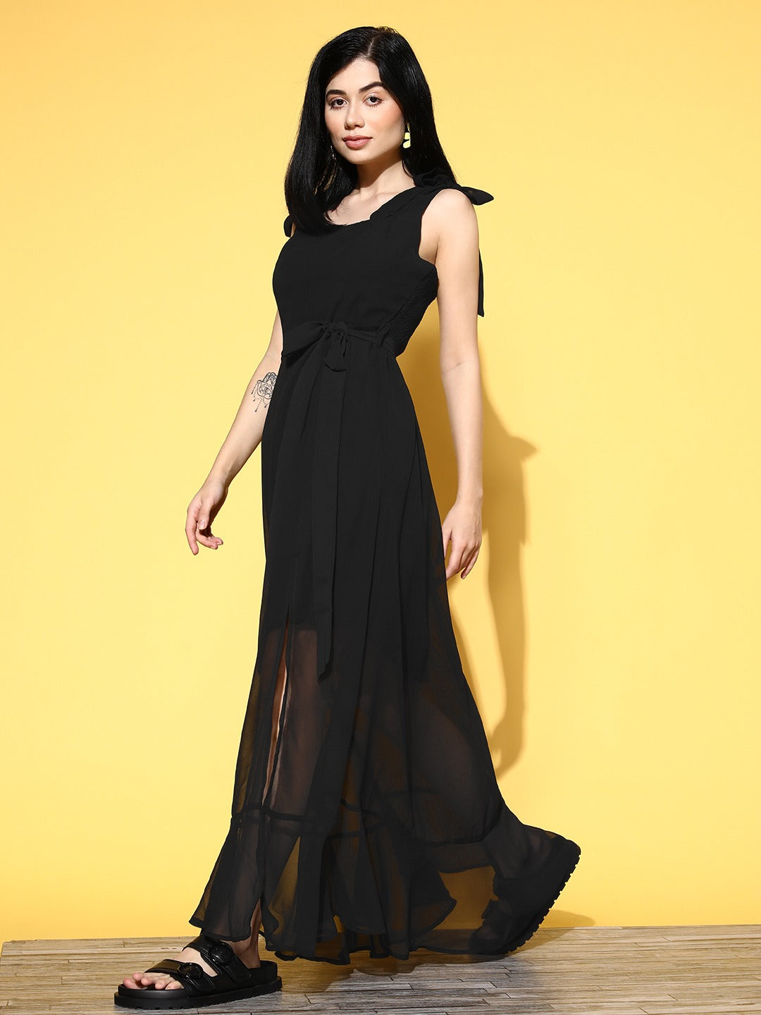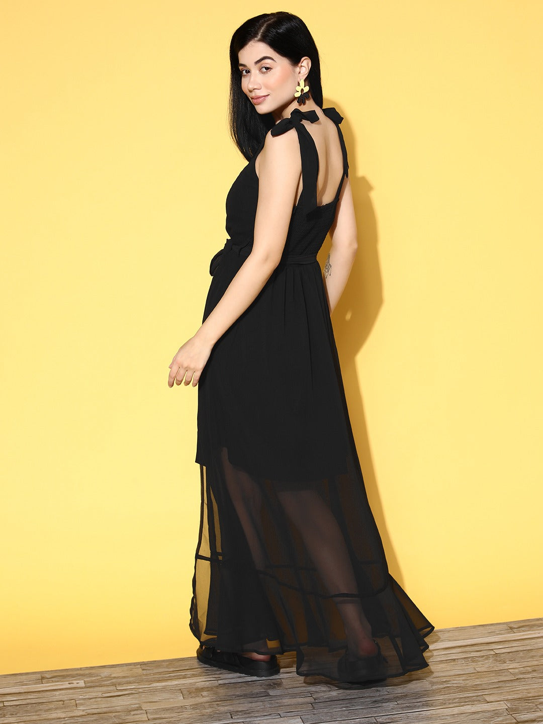 Make a remarkable fashion statement while stepping in and out of any party event by donning this stunning Solid Georgette A-Line Maxi Dress designed by Berrylush. The most adorable style element of this dress is its tie-ups shoulder straps that lend a comfortable fit with a cute decorative design. Punctuated from the finest georgette polyester material that gives this dress has a crisp texture with an excellent anti-fading feature. In addition, the woven detailing improves the structural integrity and durability of this maxi dress. Let the limelight be over you with your charismatic look by wearing this maxi dress with a pair of high-heels, pearl earrings, and a sling bag.