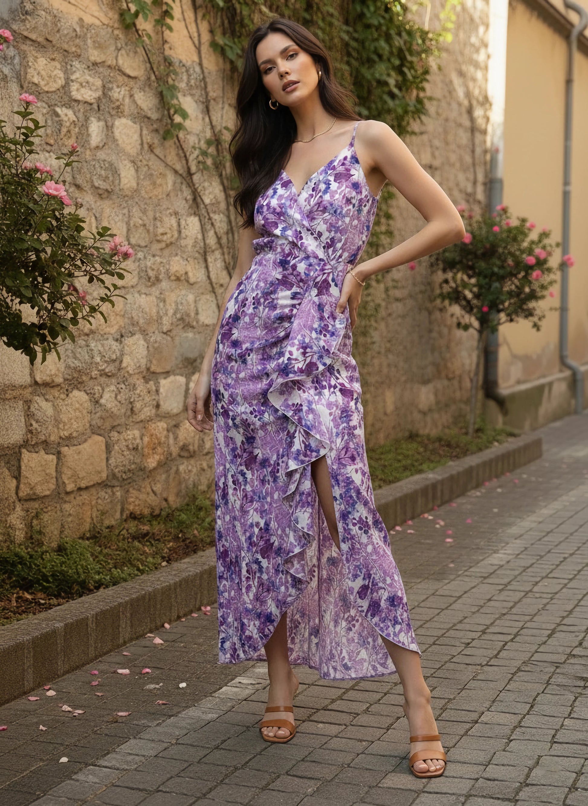 Flaunt your wardrobe by adding a radiant quirky core to it with this gleaming White Floral Printed Asymmetric Hem Maxi Dress from Berrylush. This dress assembles a unique and stunning casual look with its asymmetric hem at the waist which appears as ruffled styling. The sleeveless and front thigh slit give enough disclosure to your beautiful arms and legs to present an alluring outlook. Spun from the georgette polyester fabric to provide crease resistance and beautiful clings to your figure. The concealed zip closure supports the ease-wearing attribute while the shoulder straps ensure a supportive and non-slip fit. Featuring a glamorous appearance with ruffles surface styling which gives a radiant sheen to your lower body portion. Pair up this boho-chic maxi dress with strappy heels and a cute clutch to get a bewitching final look.