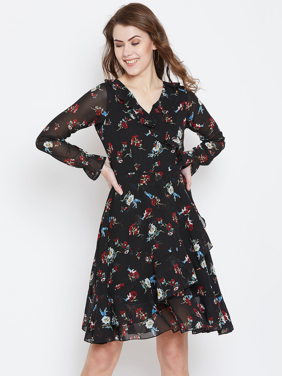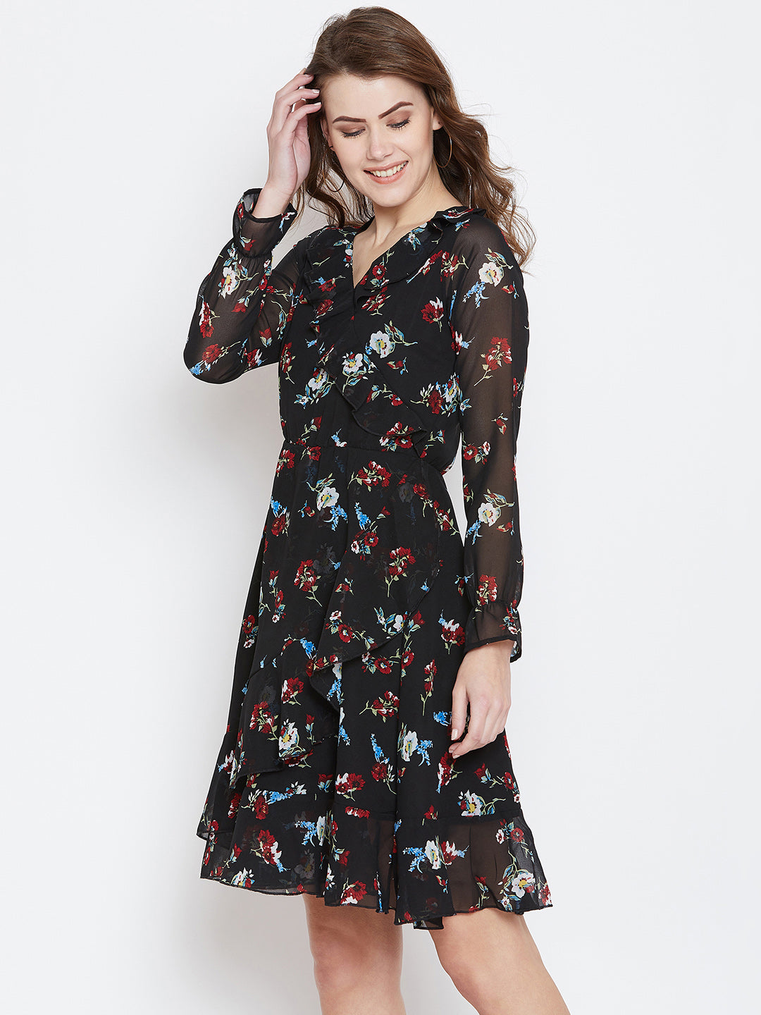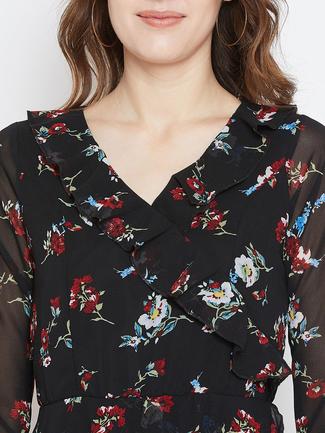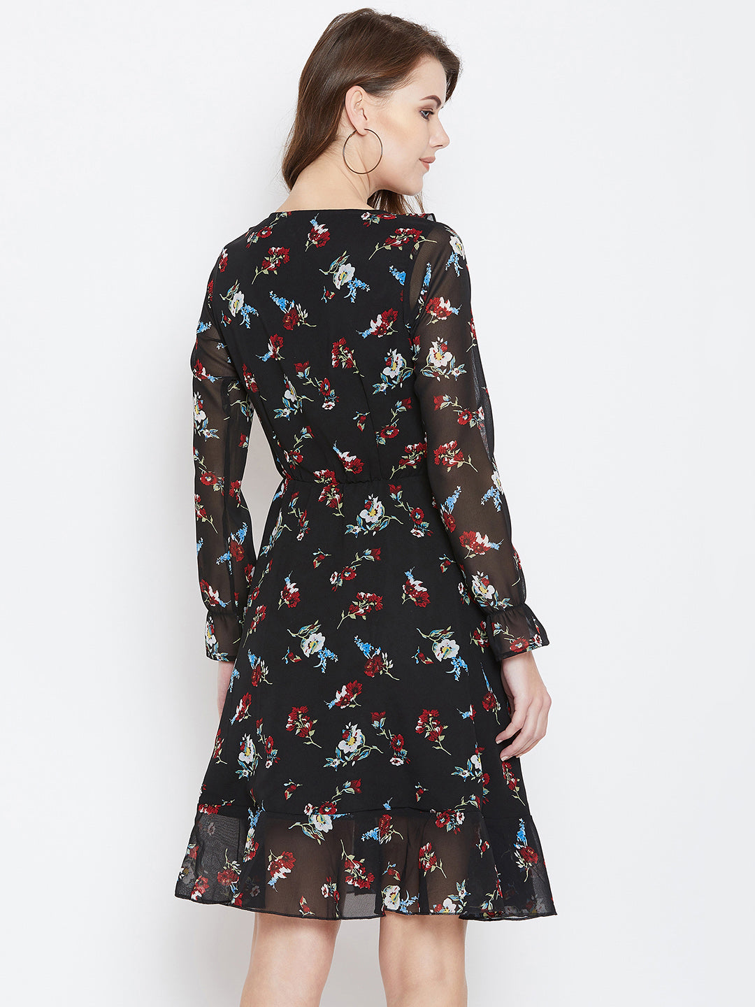 Berrylush Women Black & Red Floral Printed V-Neck Semi Sheer Flared Wrap Mini Dress