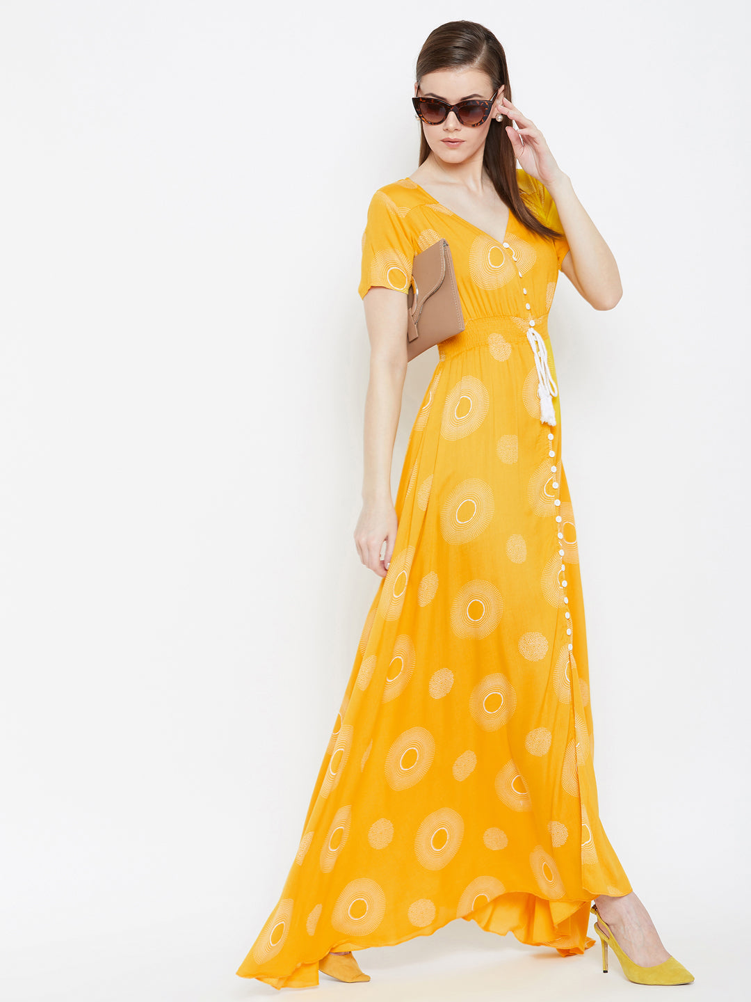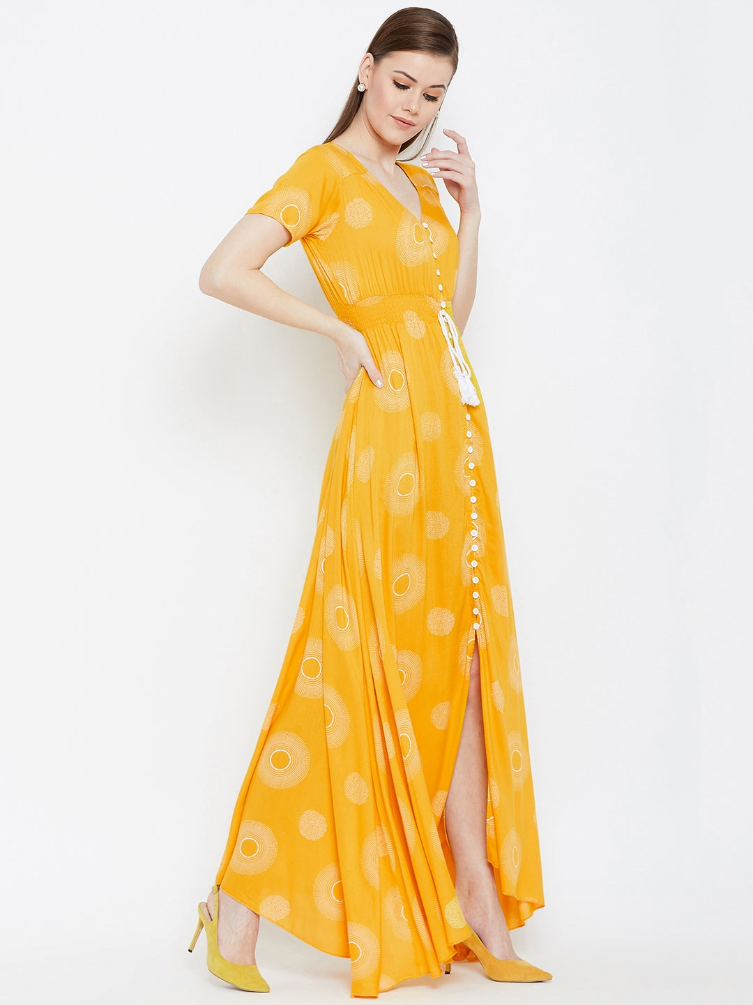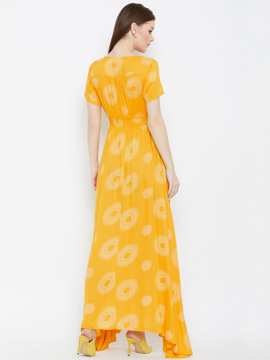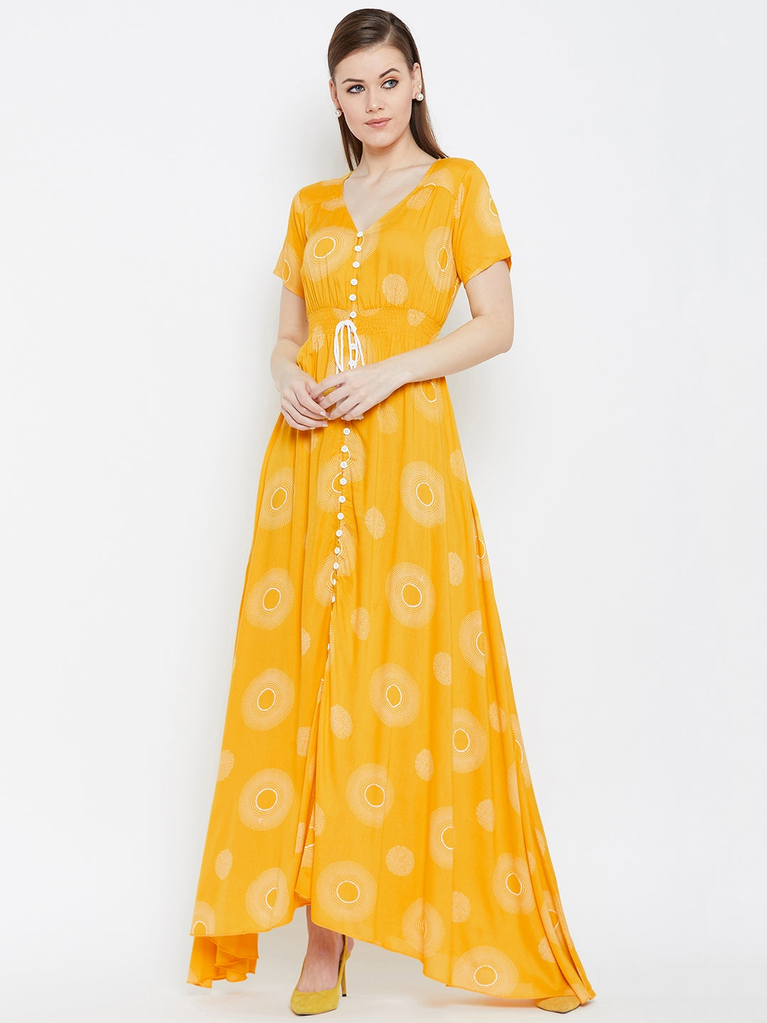 Amplify your casual wear collection by adding a playful and stylish vibe with this charming Yellow & White Geometric Printed V-Neck Crepe Smocked Maxi Dress introduced by Berrylush. The amazing amalgam of yellow shade with white geometric print depicts your cheerful personality with the tint of nature's neutral beauty. Designed with short regular sleeves to get your arms a modish appeal while the button closure adds vintage style to your casual look. Maxi length accompanied with asymmetric hemline gives a lustrous finish to your lower body portion. Wear this beautiful maxi dress with your favourite pair of heels and a trendy purse to get a gorgeous appearance.