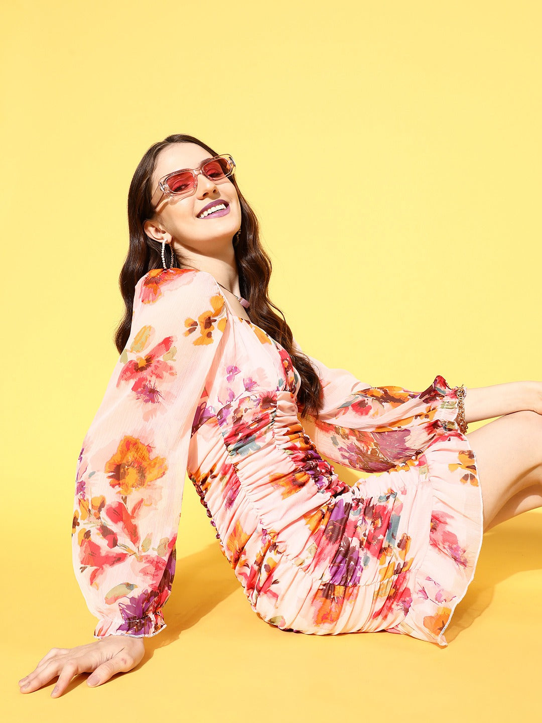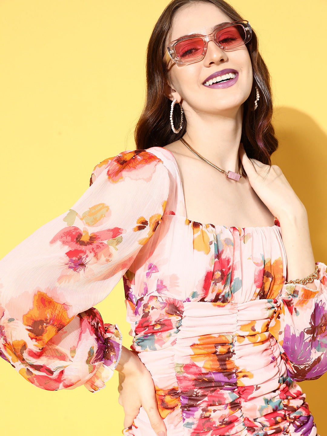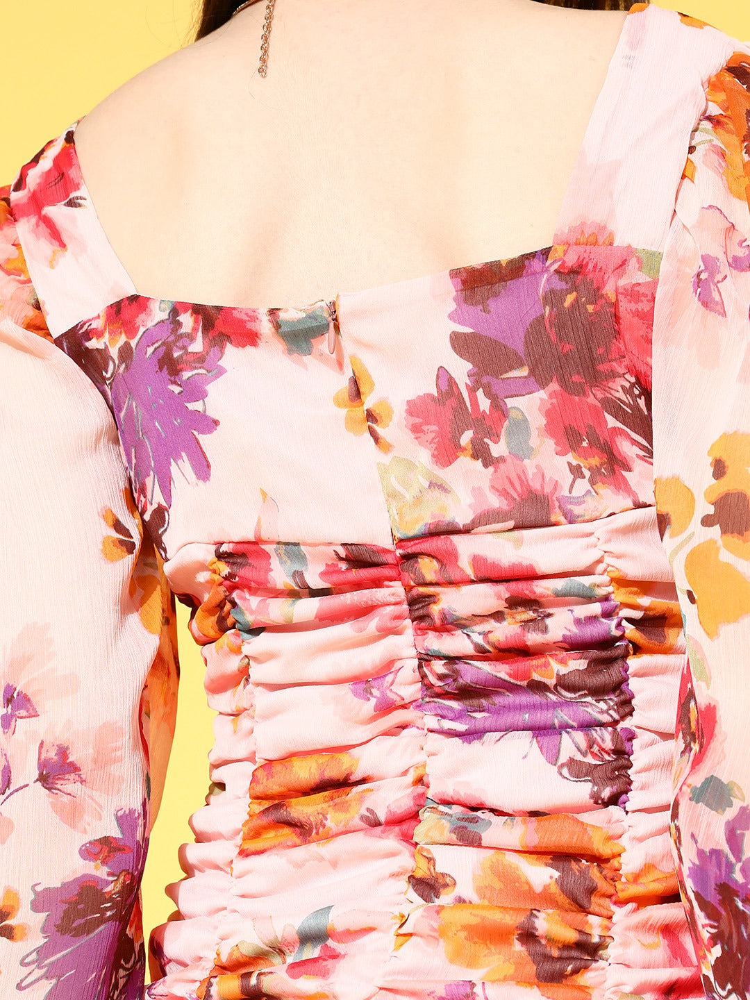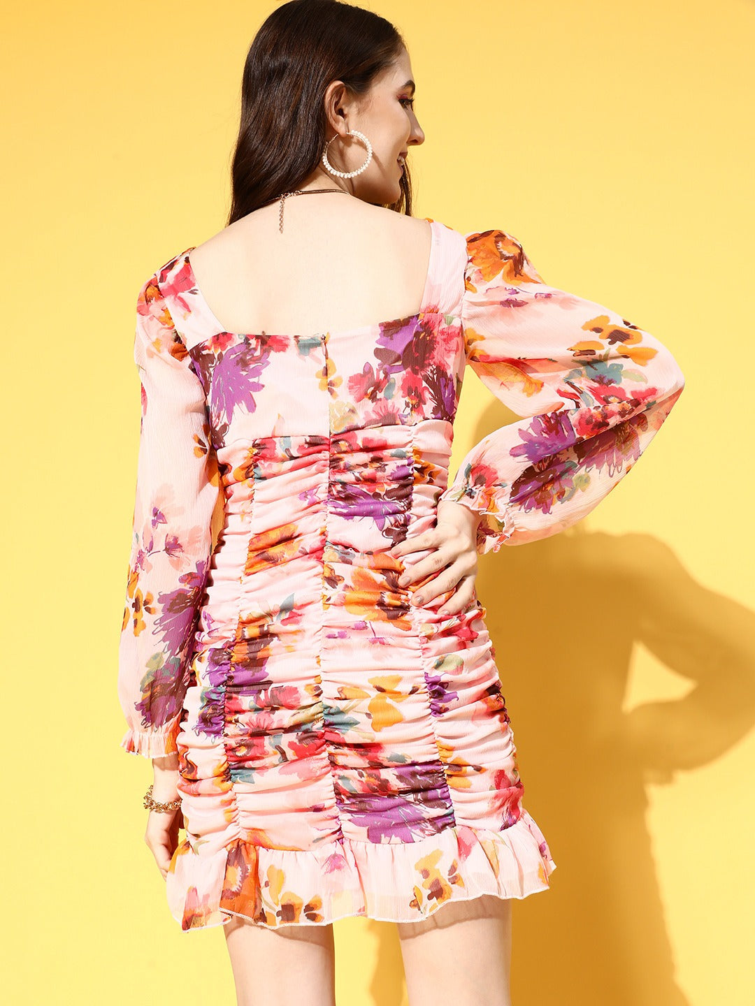 Berrylush Women Peach & Purple Floral Printed Square Neck Chiffon Ruched Bodycon Mini Dress