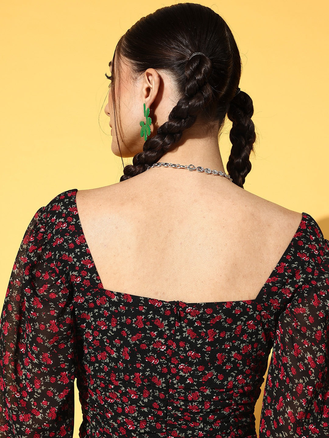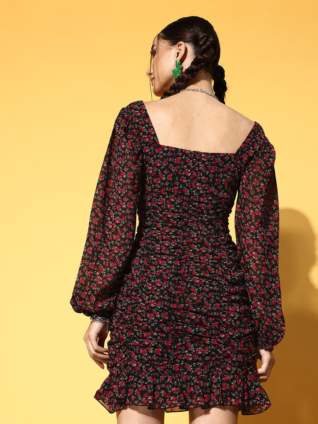 Berrylush Women Black & Red Ditsy Floral Printed Square Neck Georgette Ruched Bodycon Mini Dress