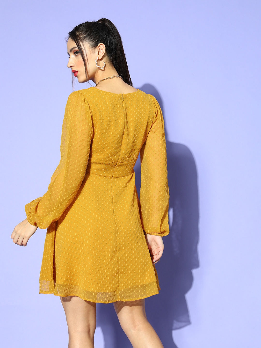 Fashion is a form of expression, thus let your fashion pick empower your classy expression by wearing this Solid Mustard Yellow Dobby Weave Square Neck Pleated Fit & Flare Mini Dress from Berrylush. Spotlighting charming amalgam of mustard yellow shade with dobby weave that gives this dress a dash of chicness with the cinematic vibe. The long-puff sleeves adjoin a tint of retro style note to this dress with captivating coverage to your arms. Comes in mini length to give your beautiful an appropriate exposure for hassle-free movements and graceful appeal. Step out looking glamorous by wearing this dress with a pair of block heels, golden earrings, and a sling bag.