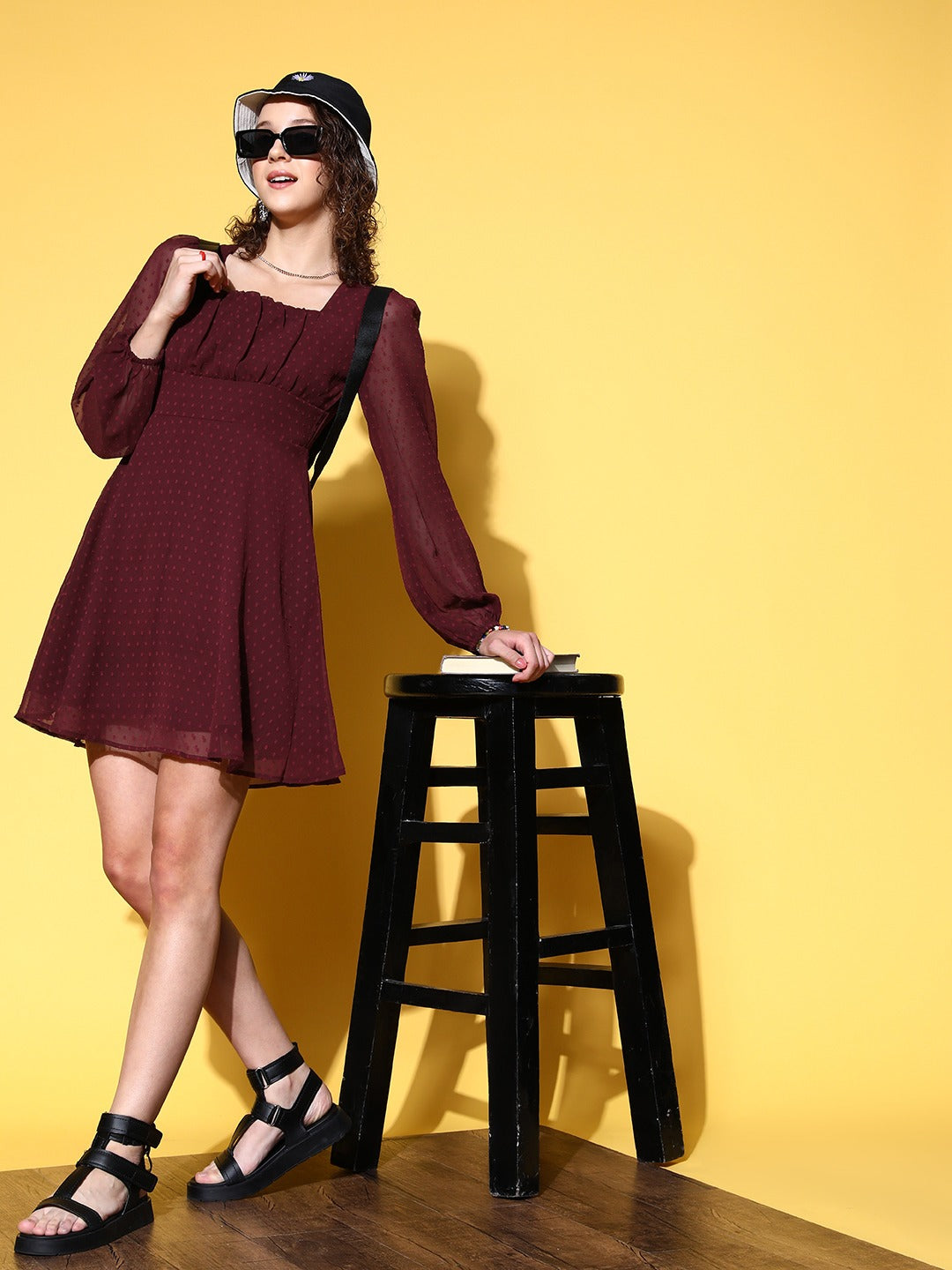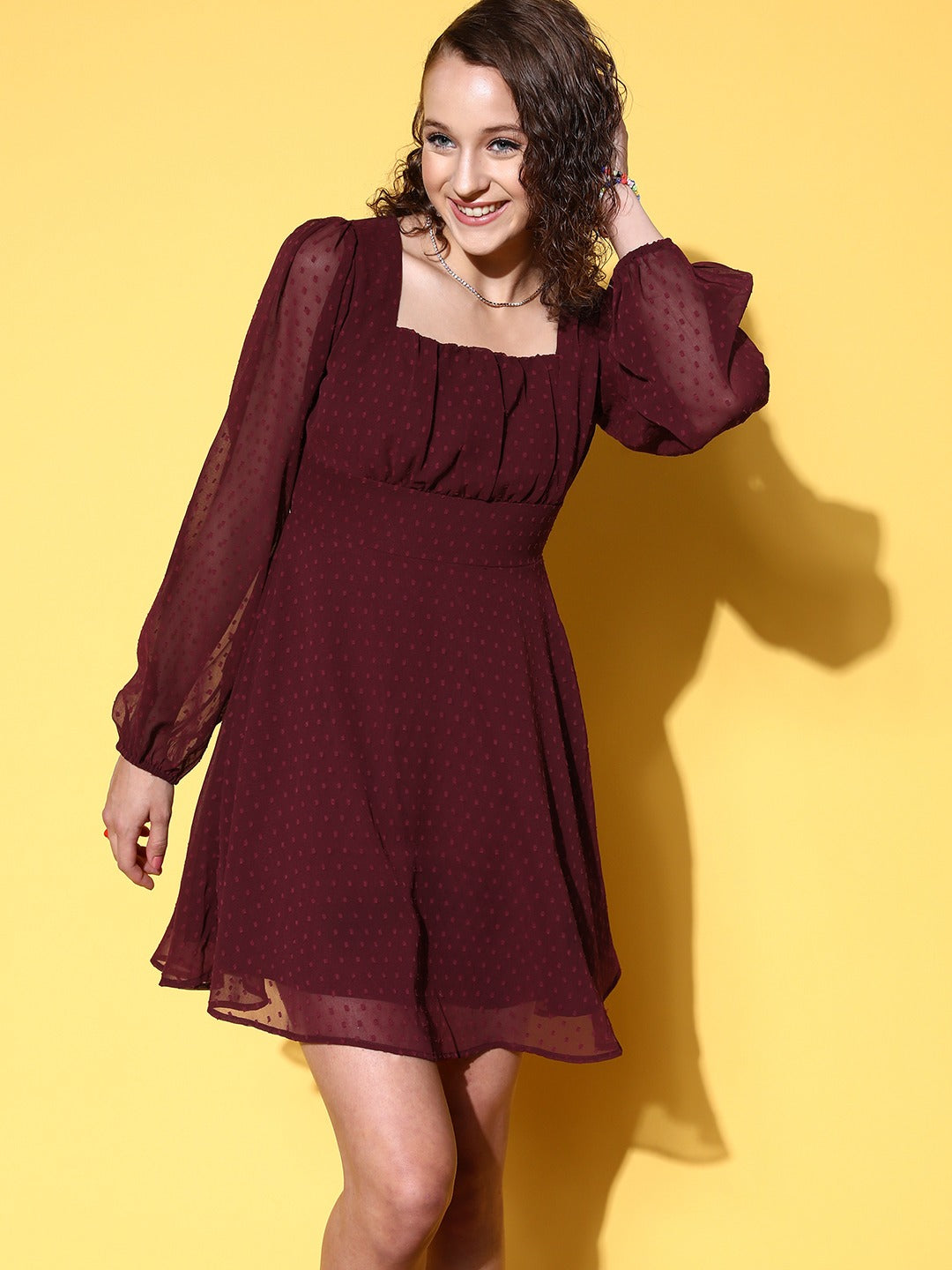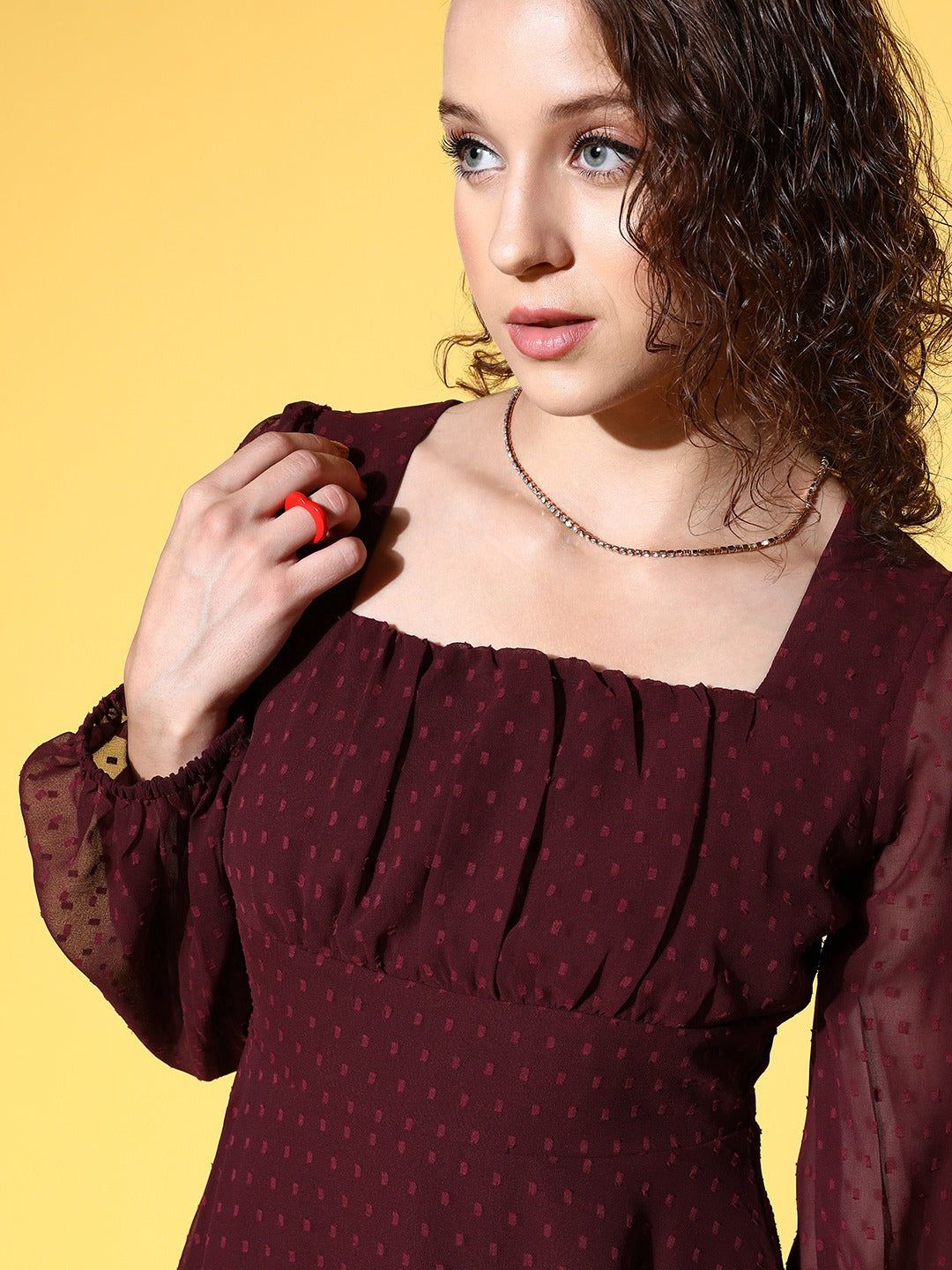 Berrylush Women Solid Burgundy Dobby Weave Square Neck Georgette Pleated Fit & Flare Mini Dress