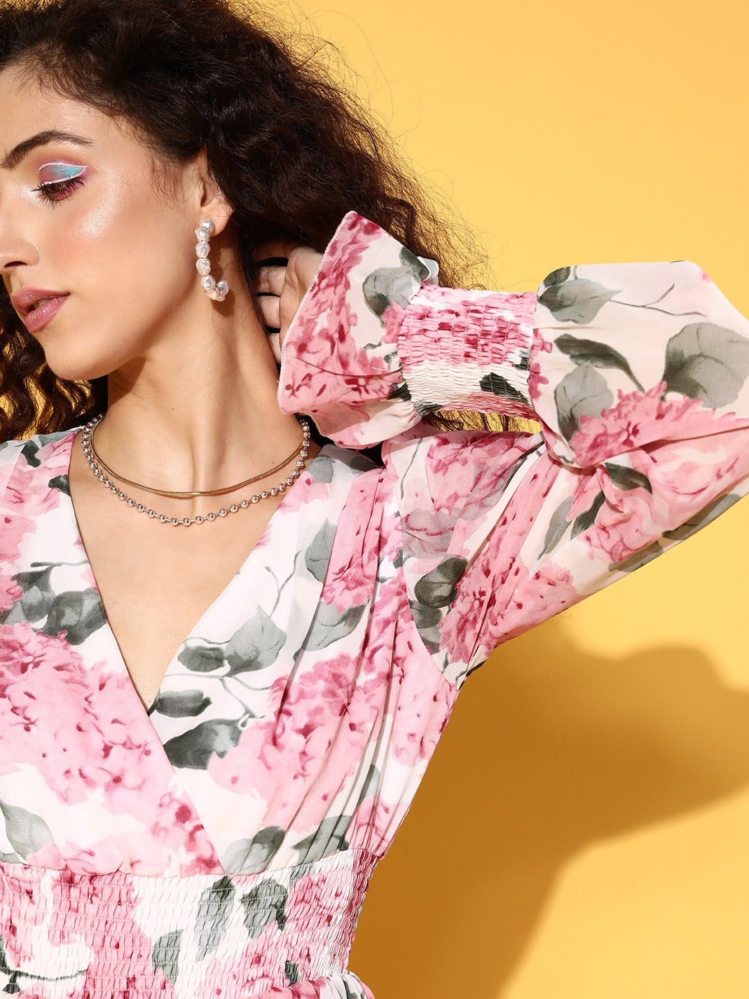 Berrylush Women White & Pink Floral Printed V-Neck Puff Sleeve Layered Wrap Mini Dress