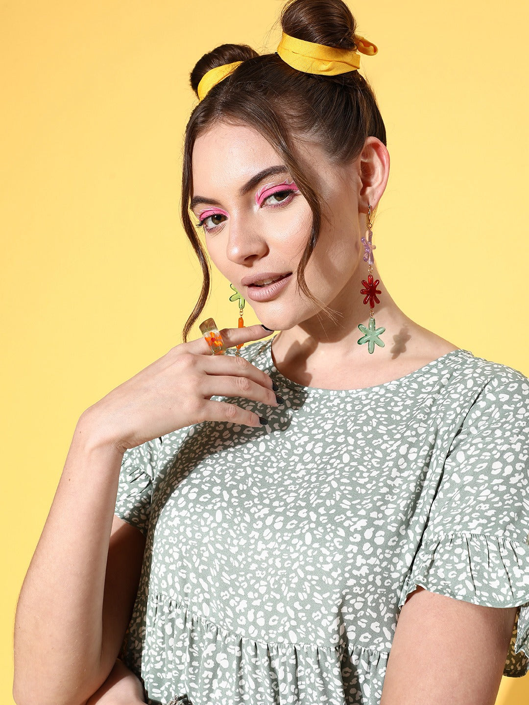 Fill your summer closet with aesthetic hues and relaxing silhouettes with this gorgeous Green and White Crepe A-Line Mini Dress from the latest floral collection of Berrylush. Tailored with a flounce hemline to give this dress a dramatic touch with beautiful frills and pretty ruffles. Punctuated from crepe polyester fabric to keep this dress is lightweight with excellent durability. Fashioned with short-flutter sleeves that give your arms suitable coverage with a flattering design. Go on a café date with your best friend while looking glamorous by wearing this mini dress with a pair of silver high-heels, star tassel earrings, and a trendy side bag.