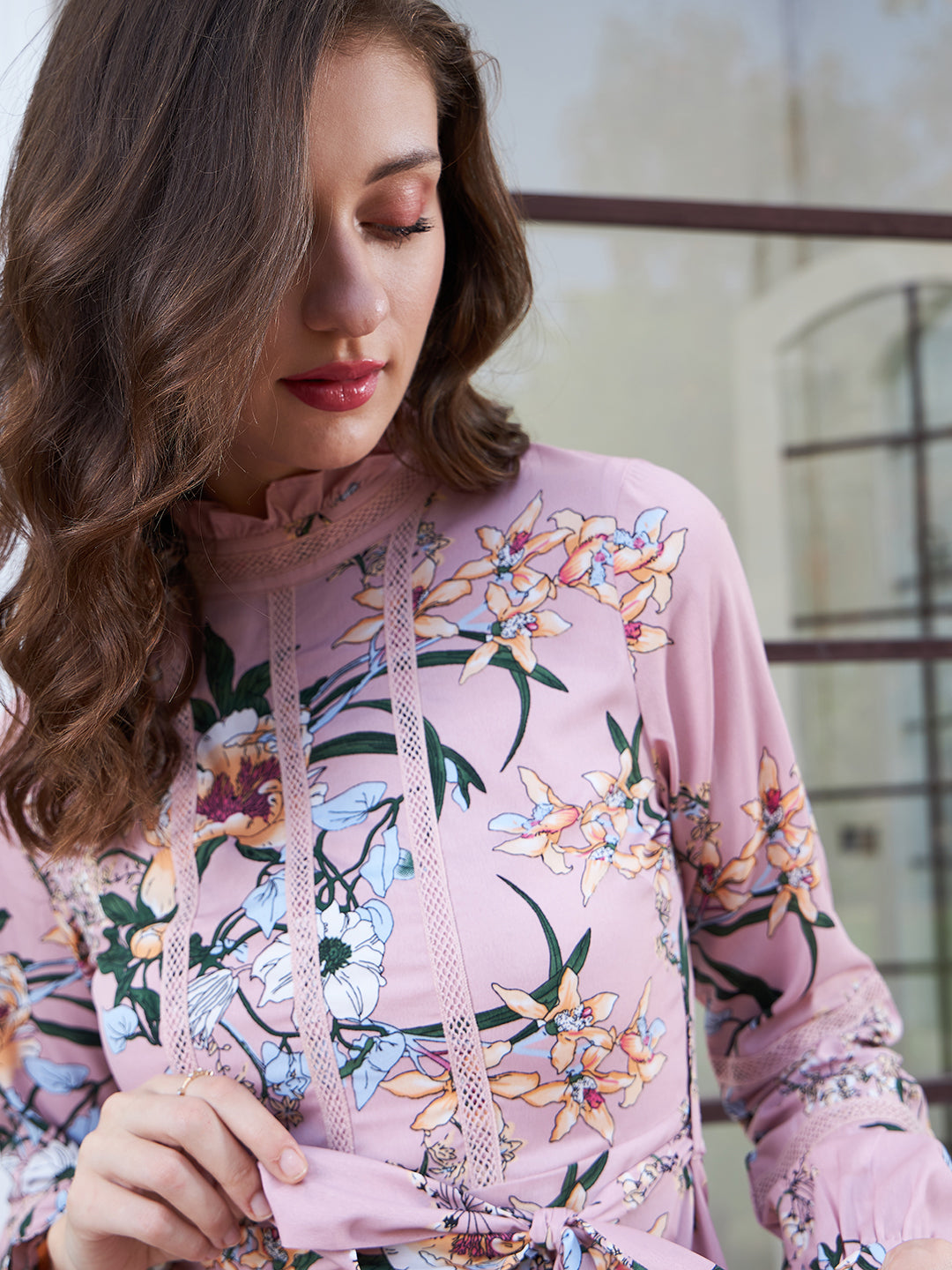 Berrylush Women Pink & Green Floral Printed Mock Neck Tie-Up Waist Lace Insert Curve Hem Ruffled Fit & Flare Mini Dress