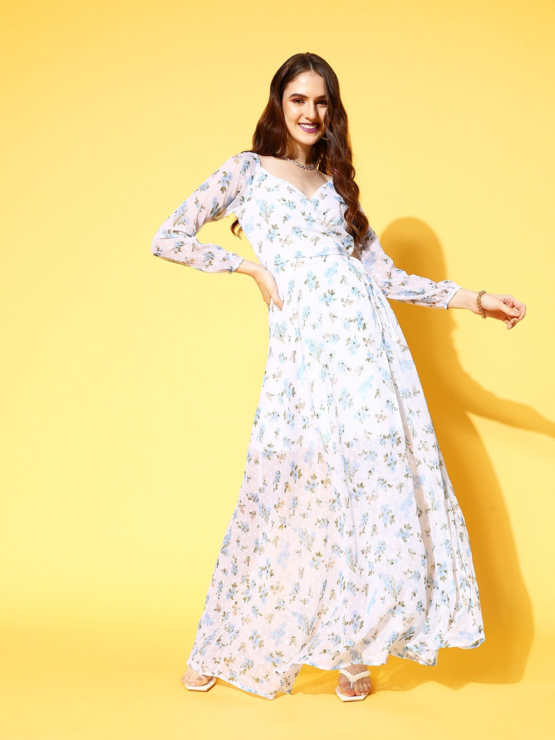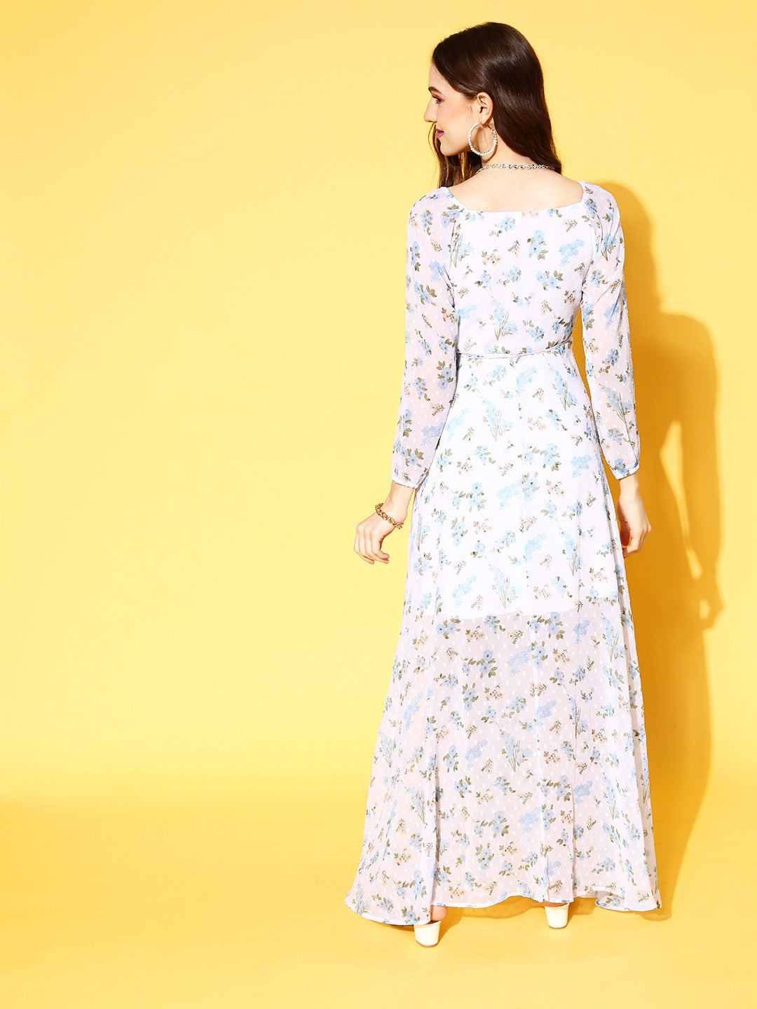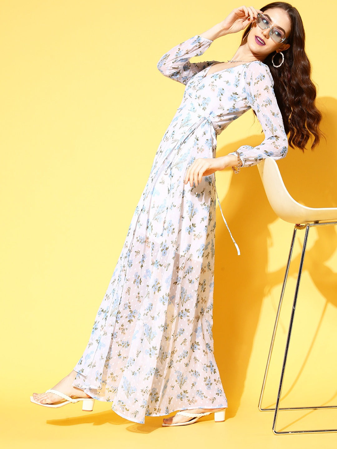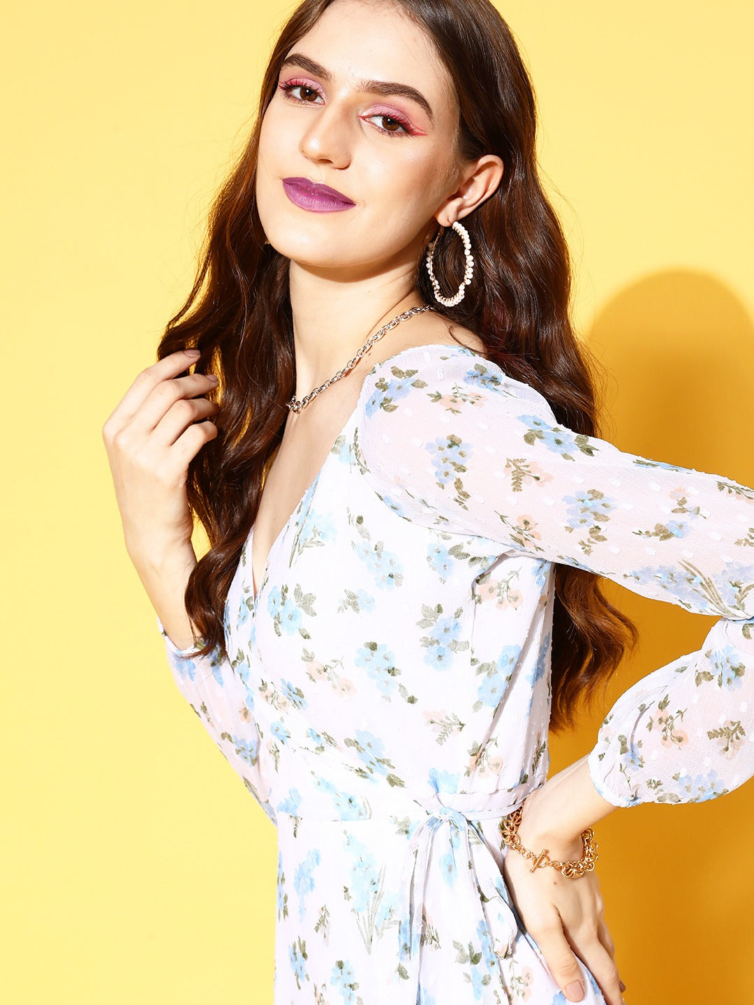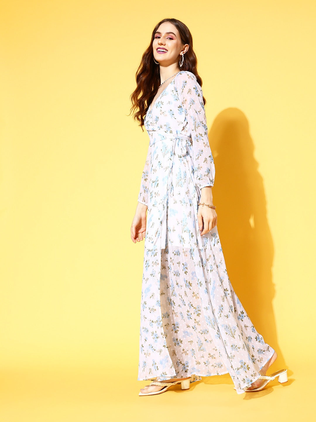 Berrylush Women White & Blue Floral Printed V-Neck Waist Tie-Up Flared Wrap Maxi Dress