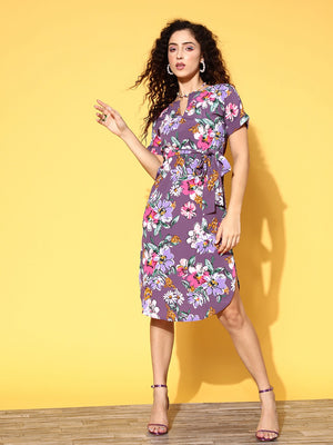 Berrylush Women Purple & White Floral Printed Shirt Collar Neck Waist Tie-Up Crepe Side-Slited A-Line Midi Dress