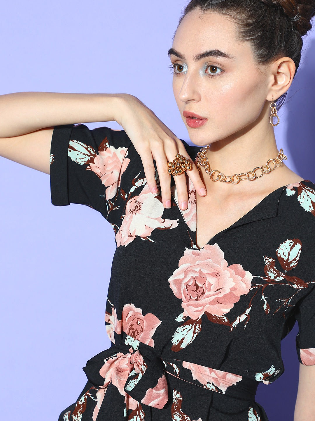 Berrylush Women Black & Pink Floral Printed Shirt Collar Neck Waist Tie-Up Crepe Side-Slited A-Line Midi Dress