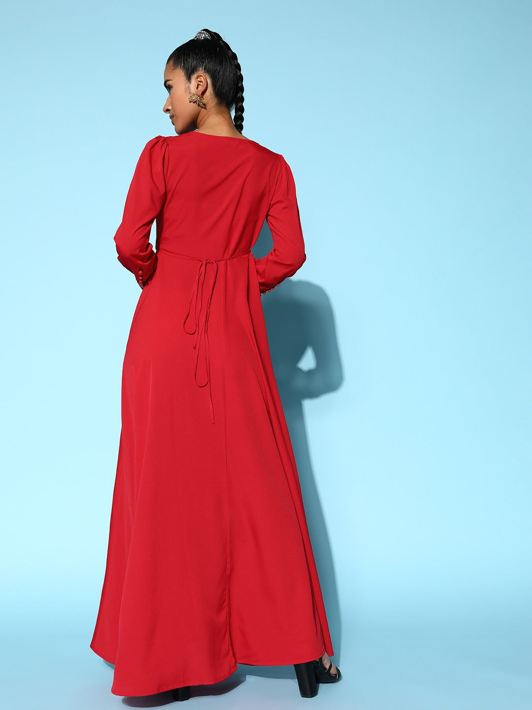 Berrylush Women Solid Red V-Neck Waist Tie-Up Thigh-High Slit Flared Maxi Dress