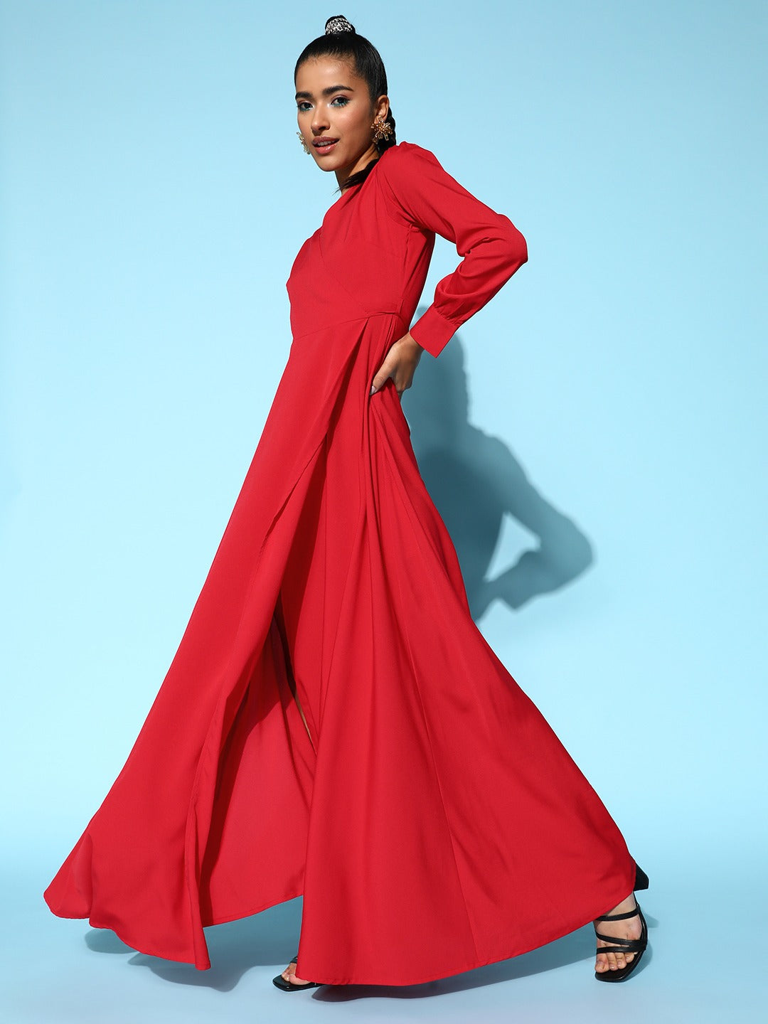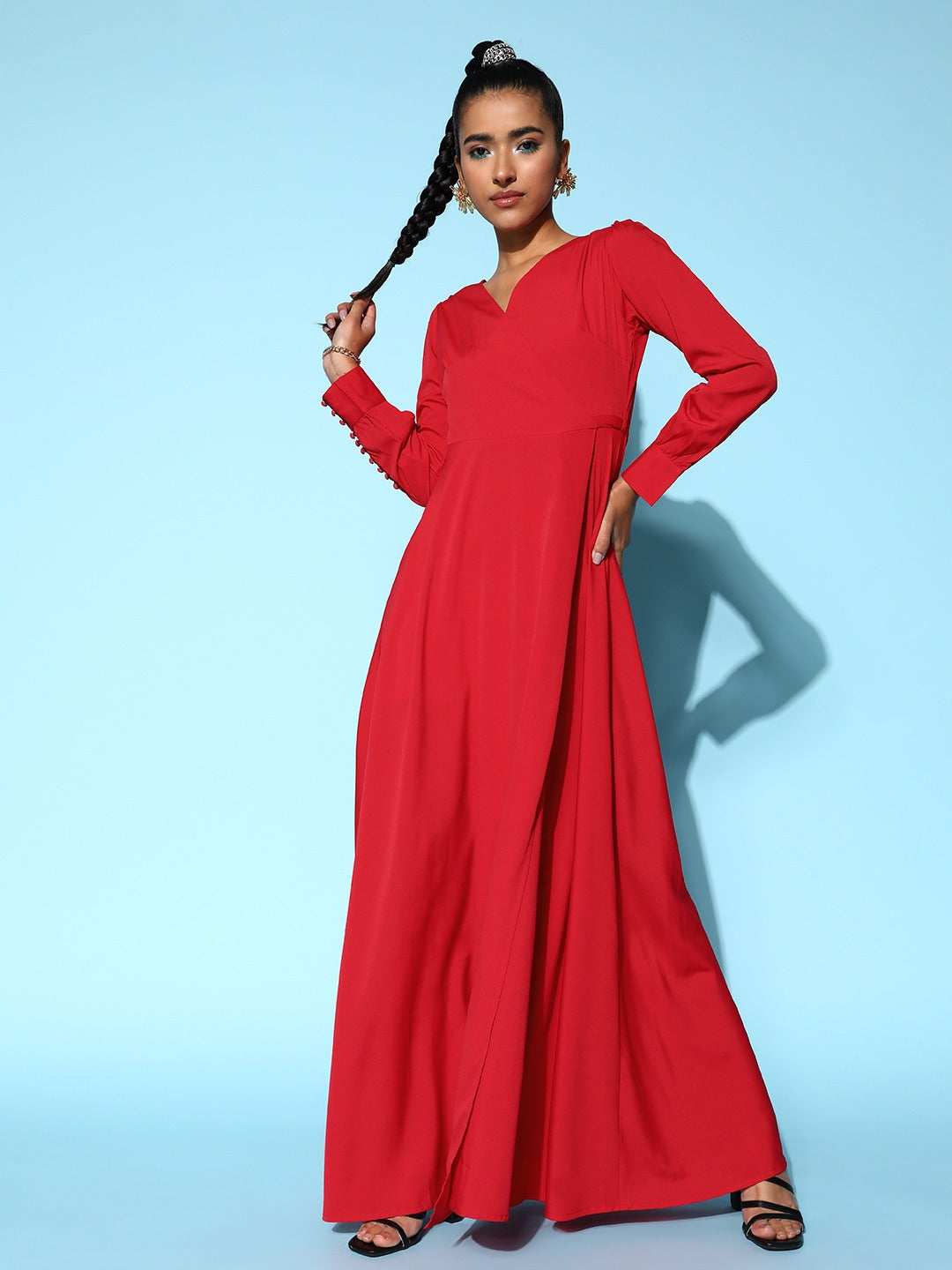 Lend a chic and classy addition to your party rotation by investing in this ravishing V-Neck Tie-Up Wrap Crepe Maxi Dress introduced by Berrylush. Presenting a V-neck design that gives this dress a simplistic appeal while beautifully elongating your neckline. Tailored in a wrap shape to offer this dress contouring silhouette that highlights your feminine figure without any inconvenience. Apart from this, that flared hemline makes this dress appear voluminous with amazing drape and textures sheen. Wear this maxi dress with a pair of trendy high-heels, matching hoop earrings, and your favourite sling bag to create a fashion-forward look.