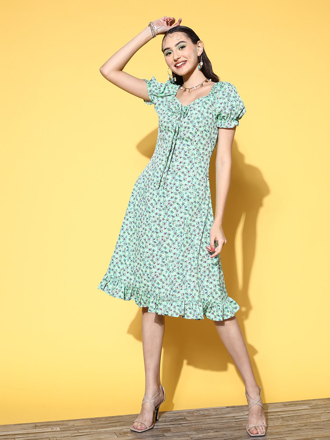 Berrylush Women Sea Green & Blue Floral Printed Sweetheart Neck Crepe Ruffled A-Line Midi Dress