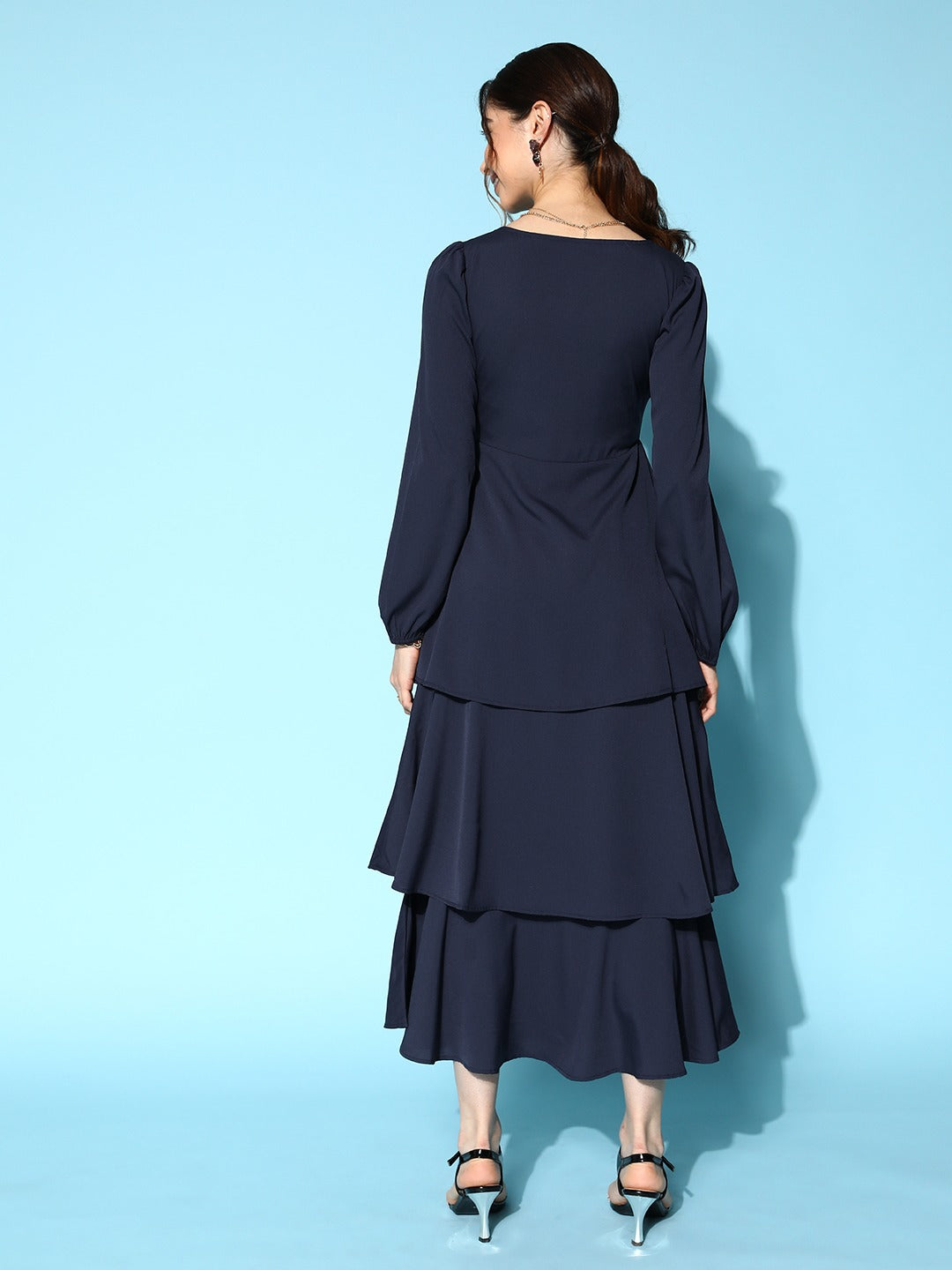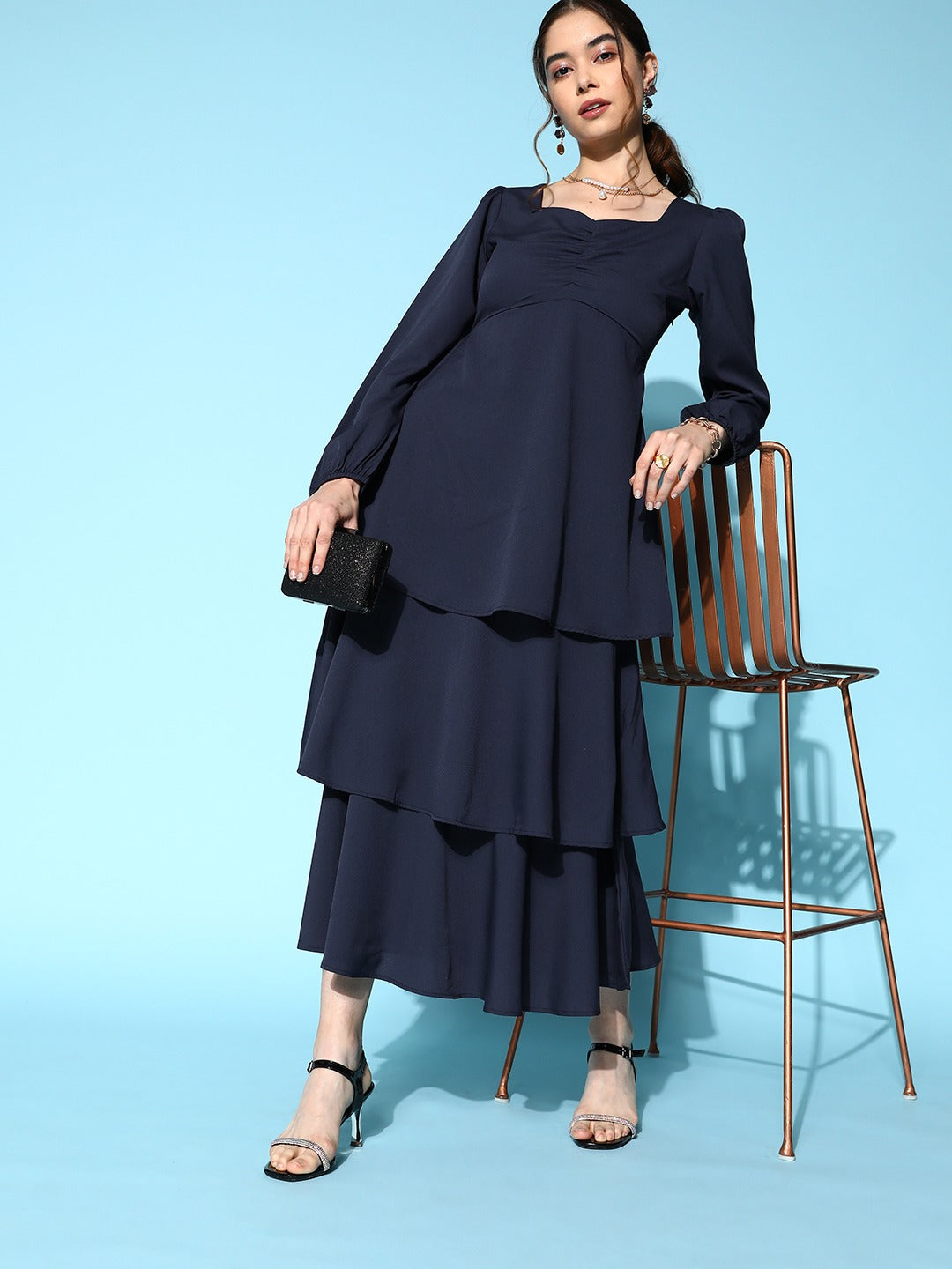Berrylush Women Solid Navy Blue Sweetheart Neck Puff Sleeve Flounce Tiered A-Line Maxi Dress