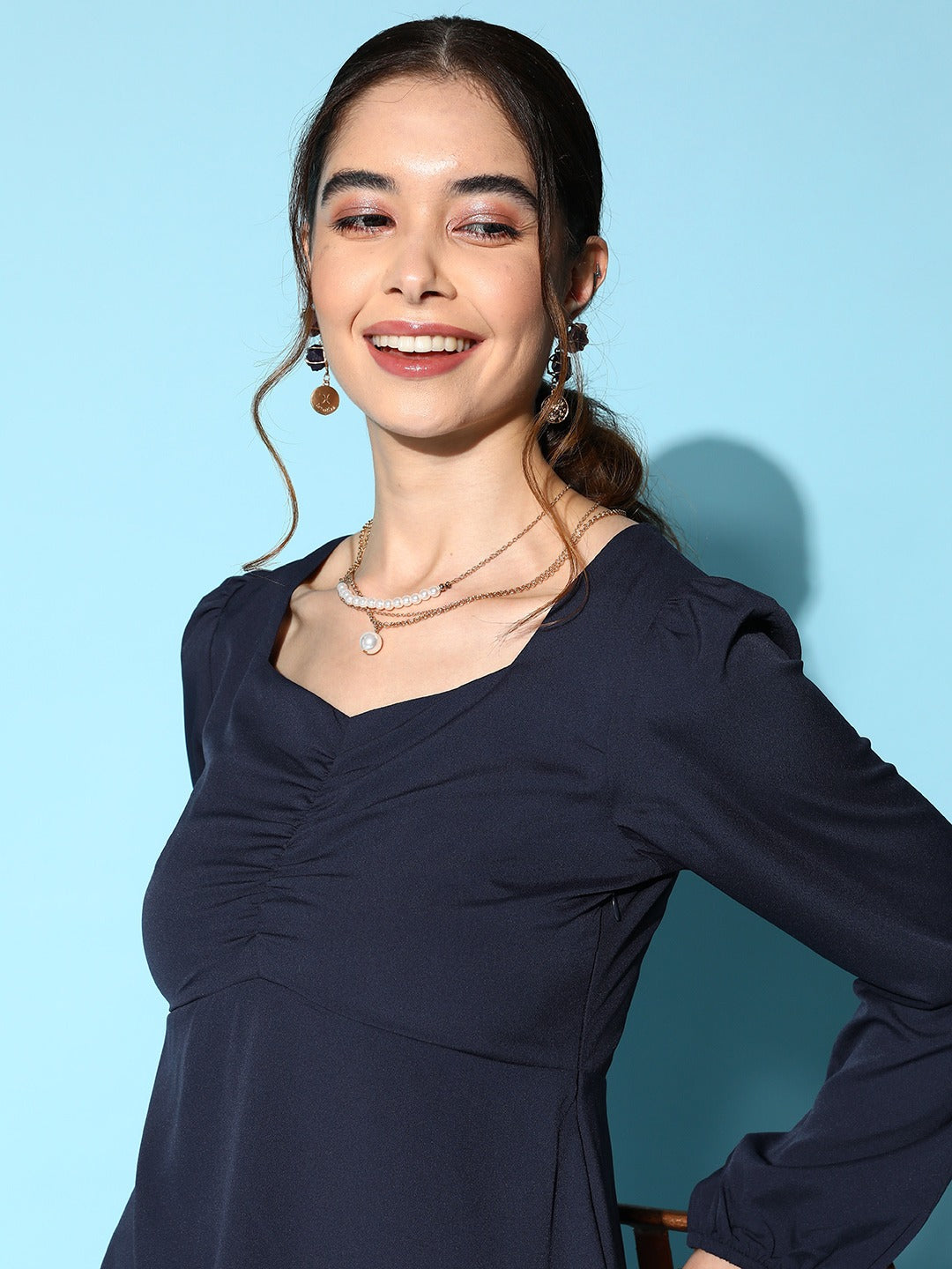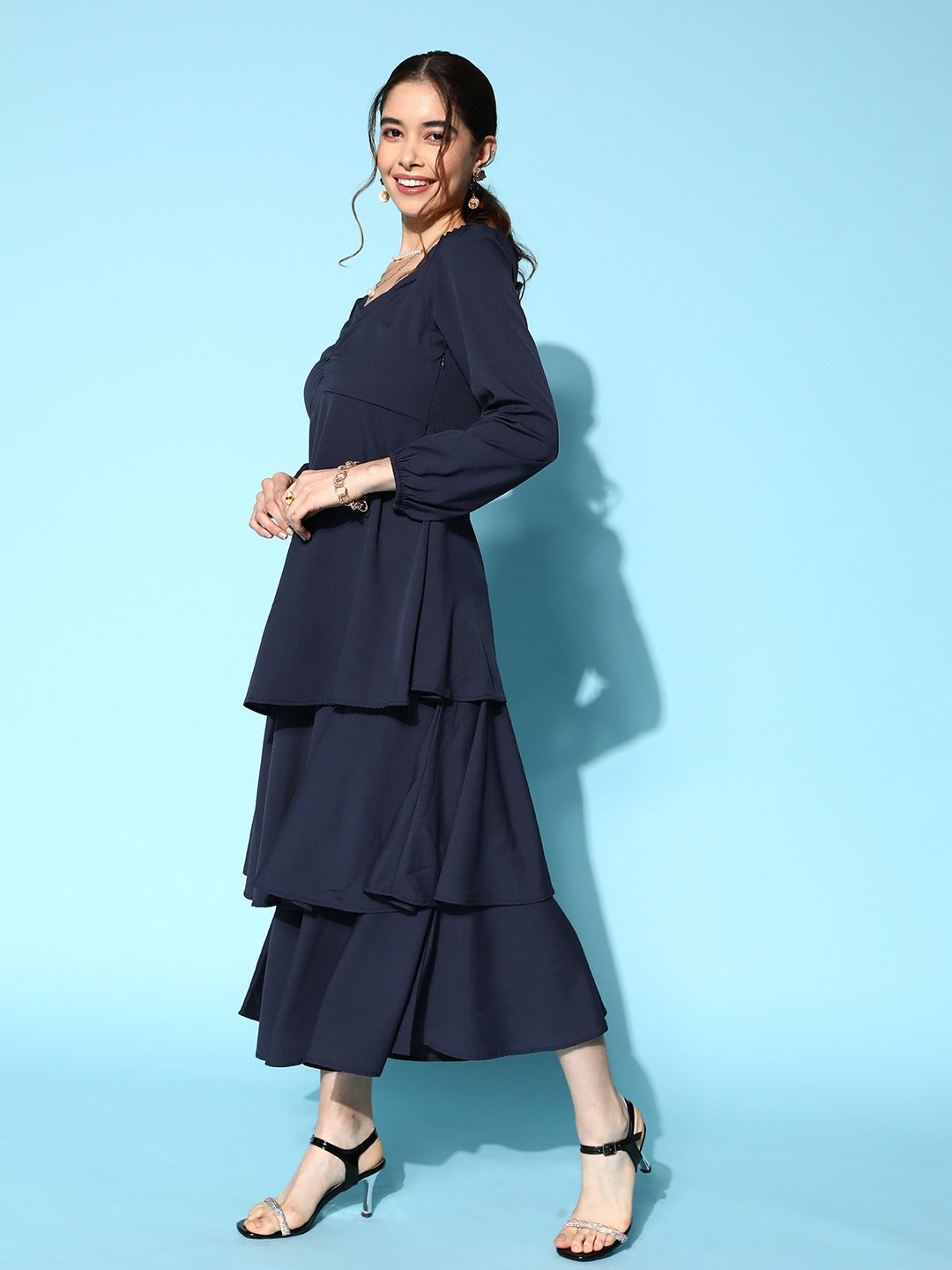 For the perfect definition of sophistication lay your hands on this classy Navy-Blue Layered Crepe A-Line Maxi Dress introduced by Berrylush from its latest casual collection. Put together a striking combination of navy-blue shade and solid pattern that gives this dress an ultra-chic look with a royal vibe. Designed in maxi length to make this dress appear versatile with proper and captivating coverage to your legs. Fashioned with layered surface styling that lends this dress a voluminous appearance that resembles tiered styling. Turn heads from wherever you go with your fabulous look by wearing this maxi dress with block heels, cute earrings, and a side bag.