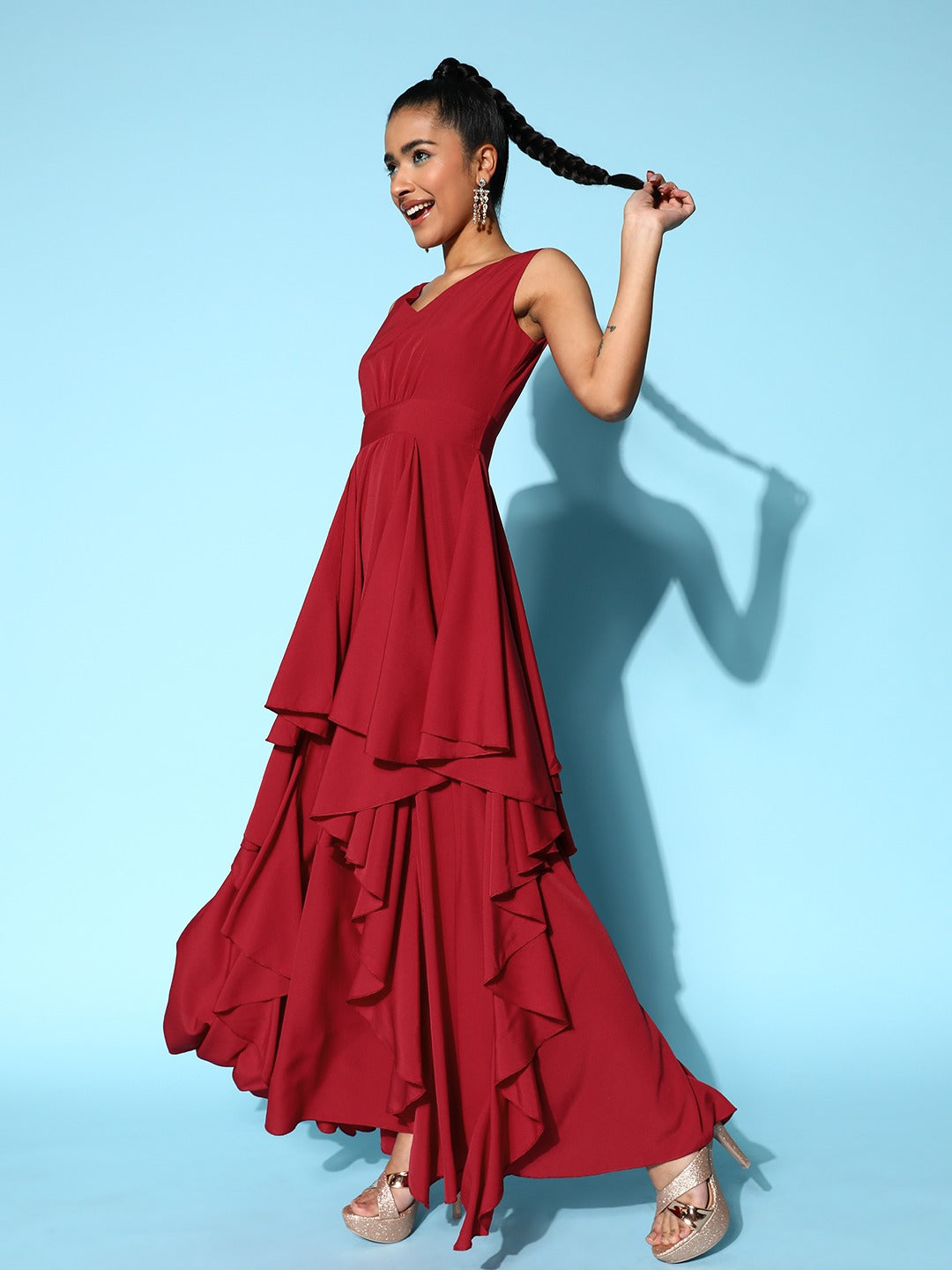 It’s time to add drama to your capsule closet with this stunning Red Solid Layered Crepe Maxi Dress designed by Berrylush for its latest casual collection. Fashioned with layered surface styling that gives the dress a beautiful flair and voluminous appearance. Styled with a sleeveless design that makes this dress appear enticing with an alluring disclosure to your arms. In addition, the v-neck design lends your neckline a flattering appeal with a vertical impression. Step out looking gorgeous for your next outing by dressing up this maxi dress with a pair of red block heels, peal jewellery, cool sunglasses, and a stylish handbag.