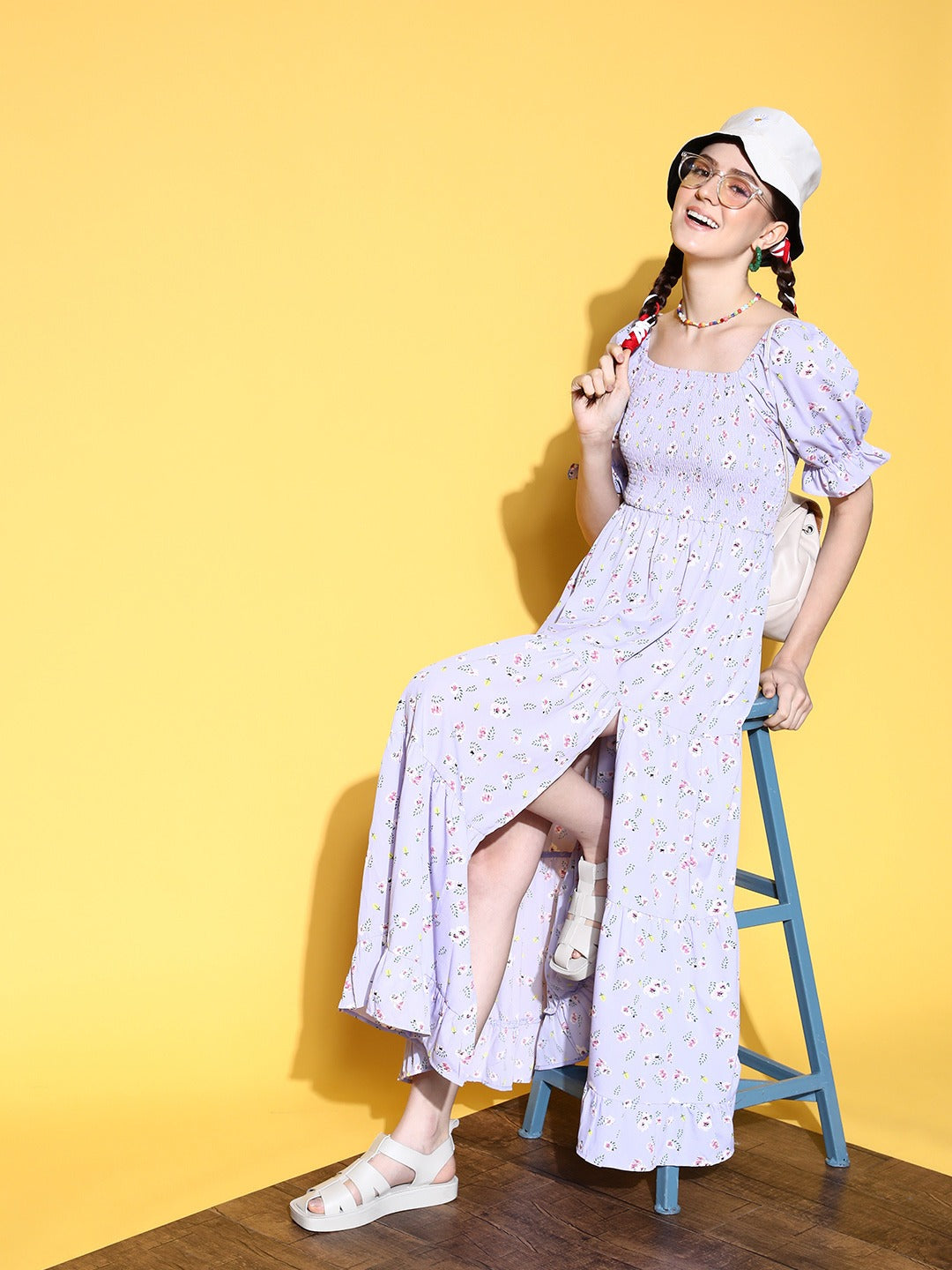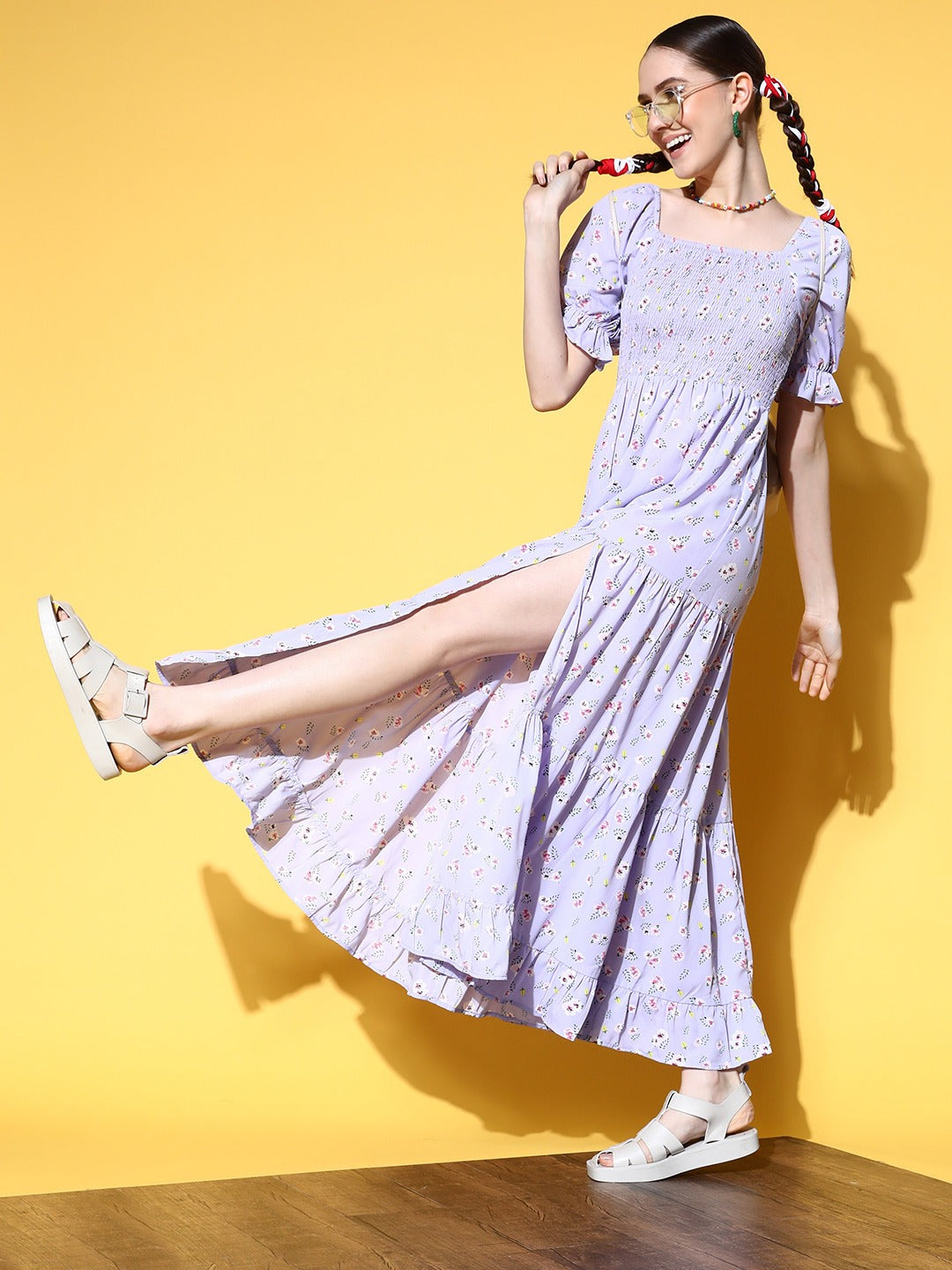 Berrylush Women Lavender & White Floral Printed Square Neck Crepe Thigh-High Slit Smocked Maxi Dress