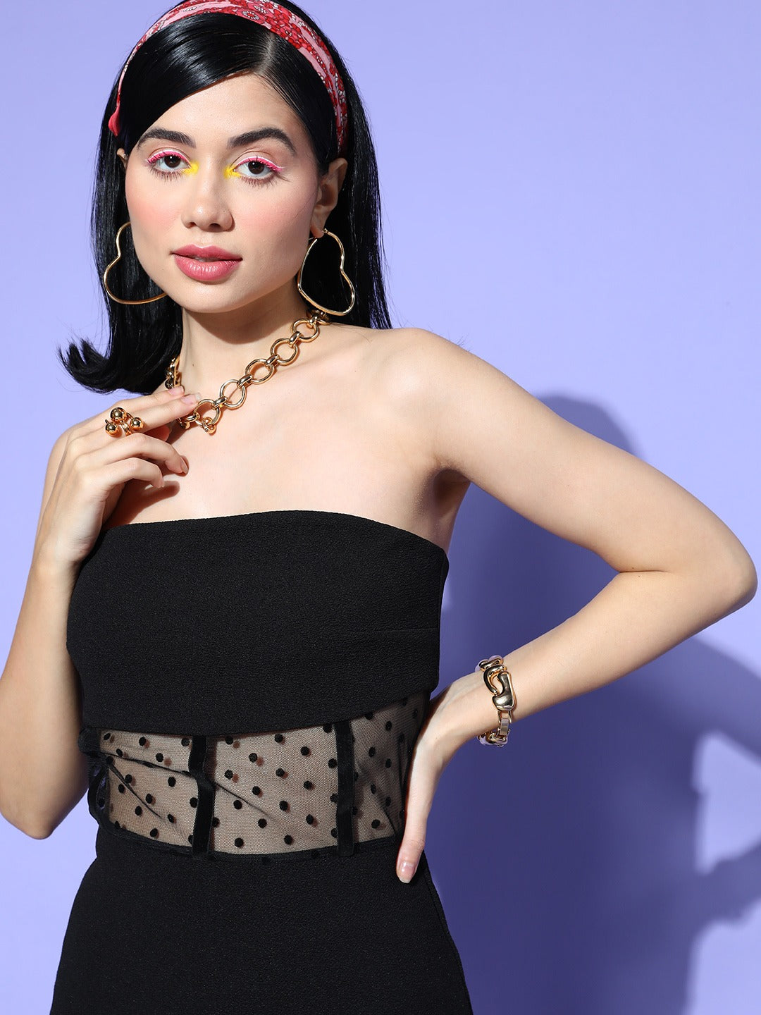 Berrylush Women Solid Black Strapless Neck Mesh Polka Dot Waist Crepe Straight Hem Bodycon Mini Dress