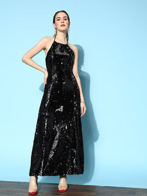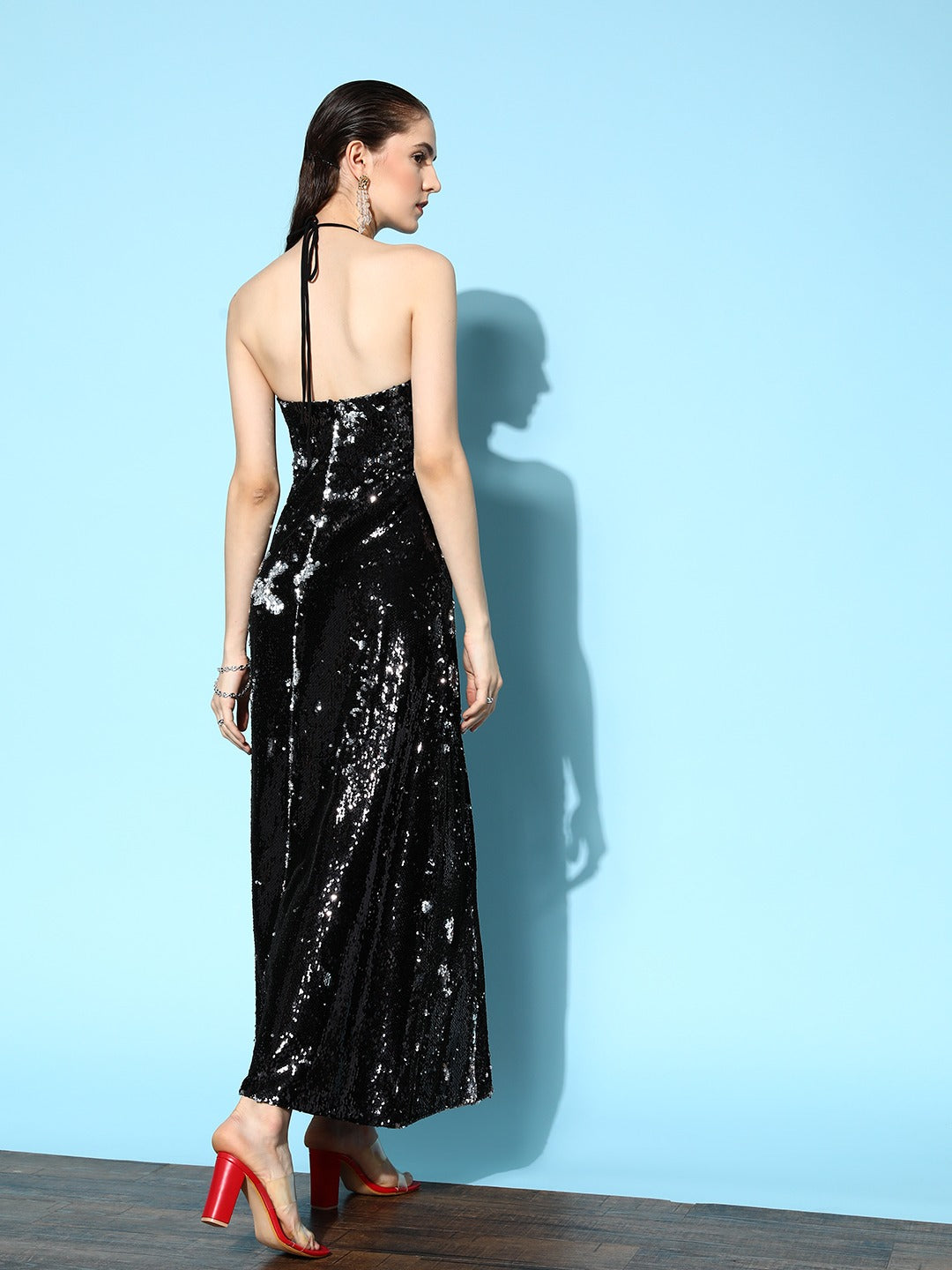 Berrylush Women Solid Black Halter Neck Thigh-High Slit Straight Hem Sequined Bodycon Maxi Dress