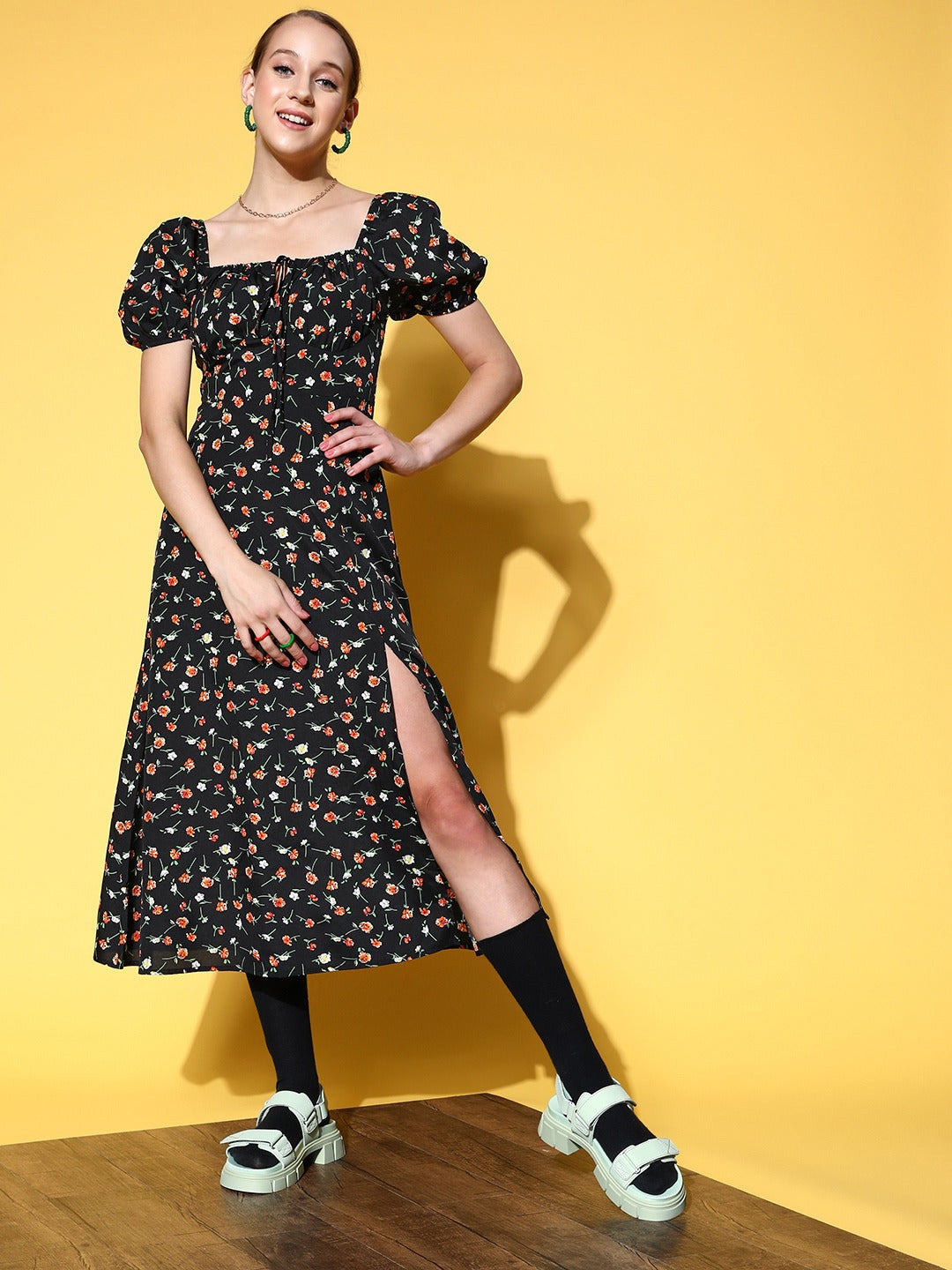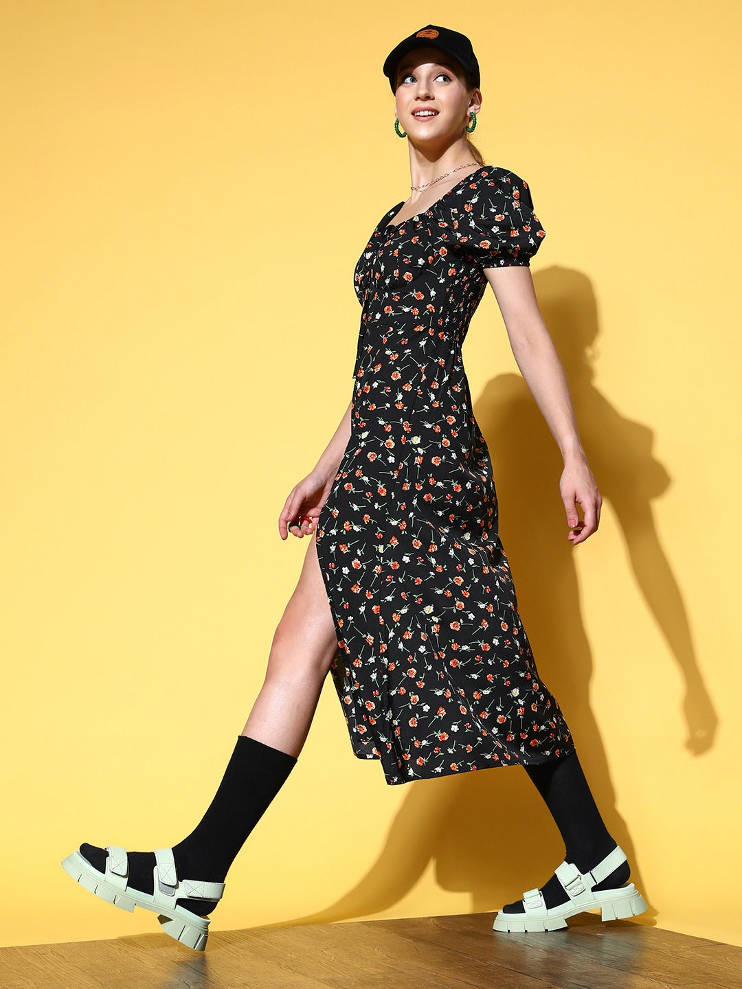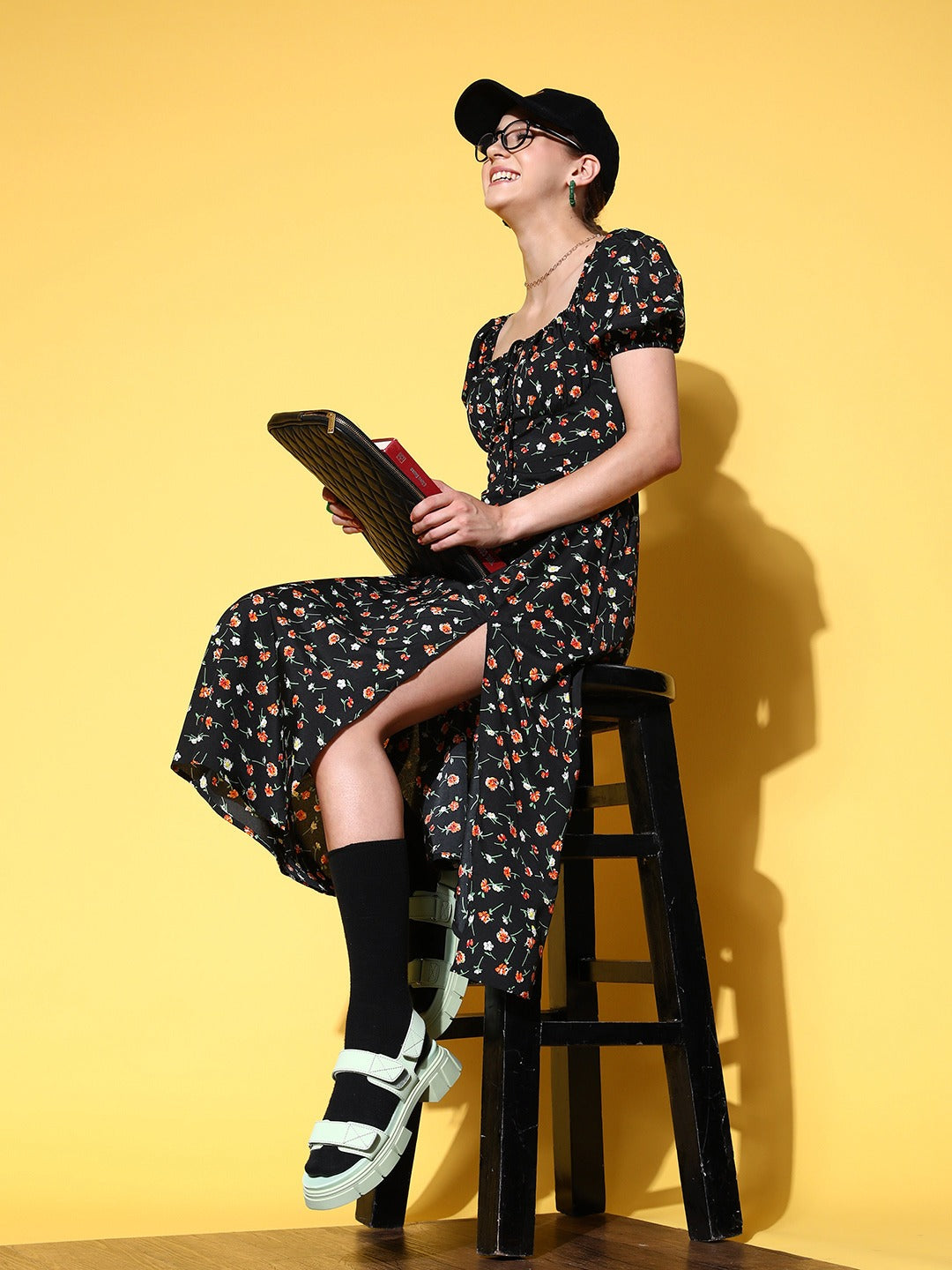 Berrylush Women Black & Orange Floral Printed Square Neck Thigh-High Slit Crepe Empire Midi Dress
