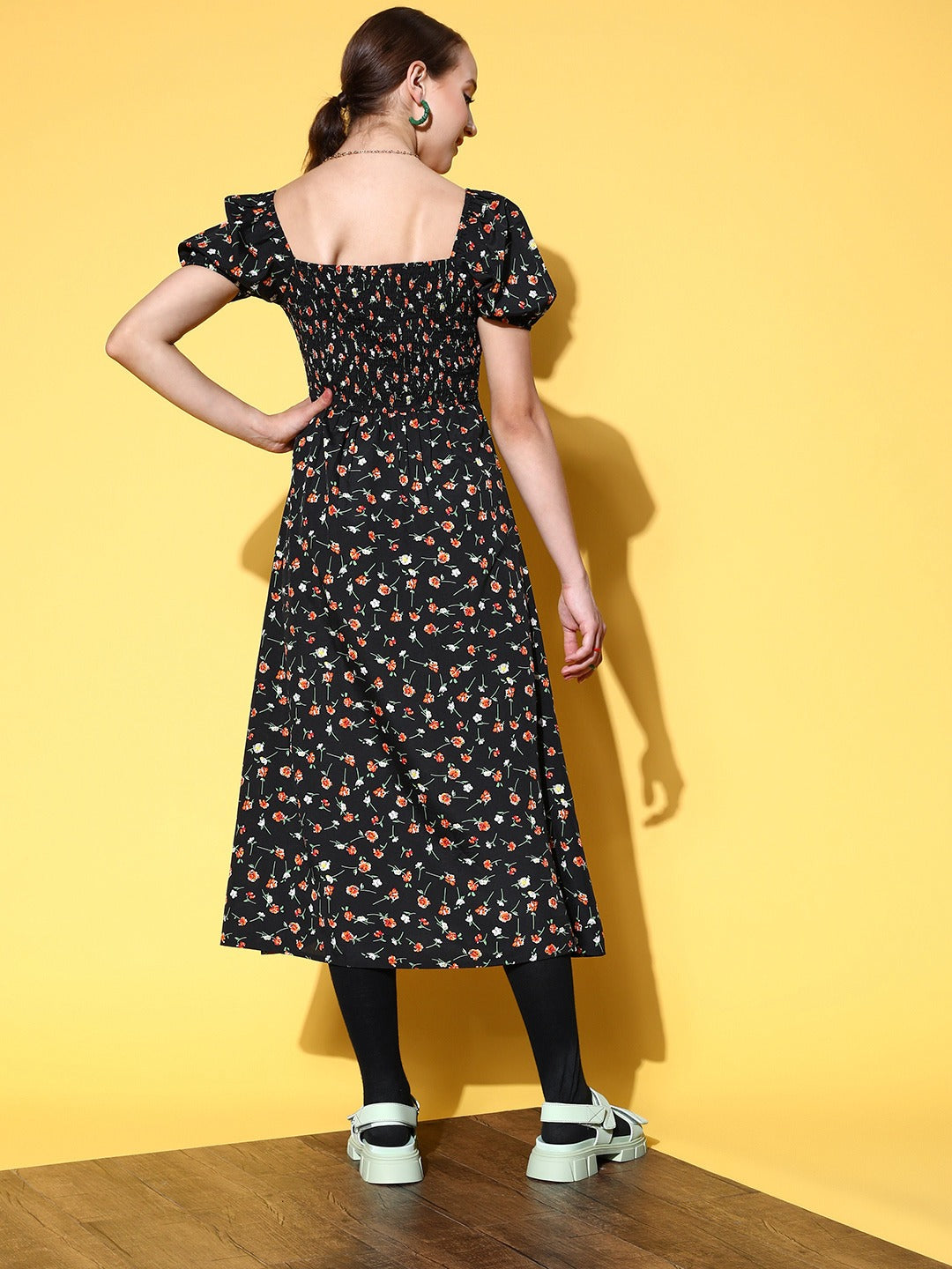 Keep your summer style fun, playful, and comfy with this bedazzling Black and Orange Floral Print Crepe Empire Midi Dress designed by Berrylush. This gorgeous dress features a majestic duo of black and orange floral print that put together an astonishing design with a tropical vibe. Flaunting short-puff sleeves that give this dress a hint of retro charm with a modern twist along with appropriate exposure to your arms. In addition, the midi length makes this dress appear classy and modest for any occasion. Go out exploring the city with a fabulous look by teaming up this midi dress with cute sandals, beads earrings, and a cute side bag.