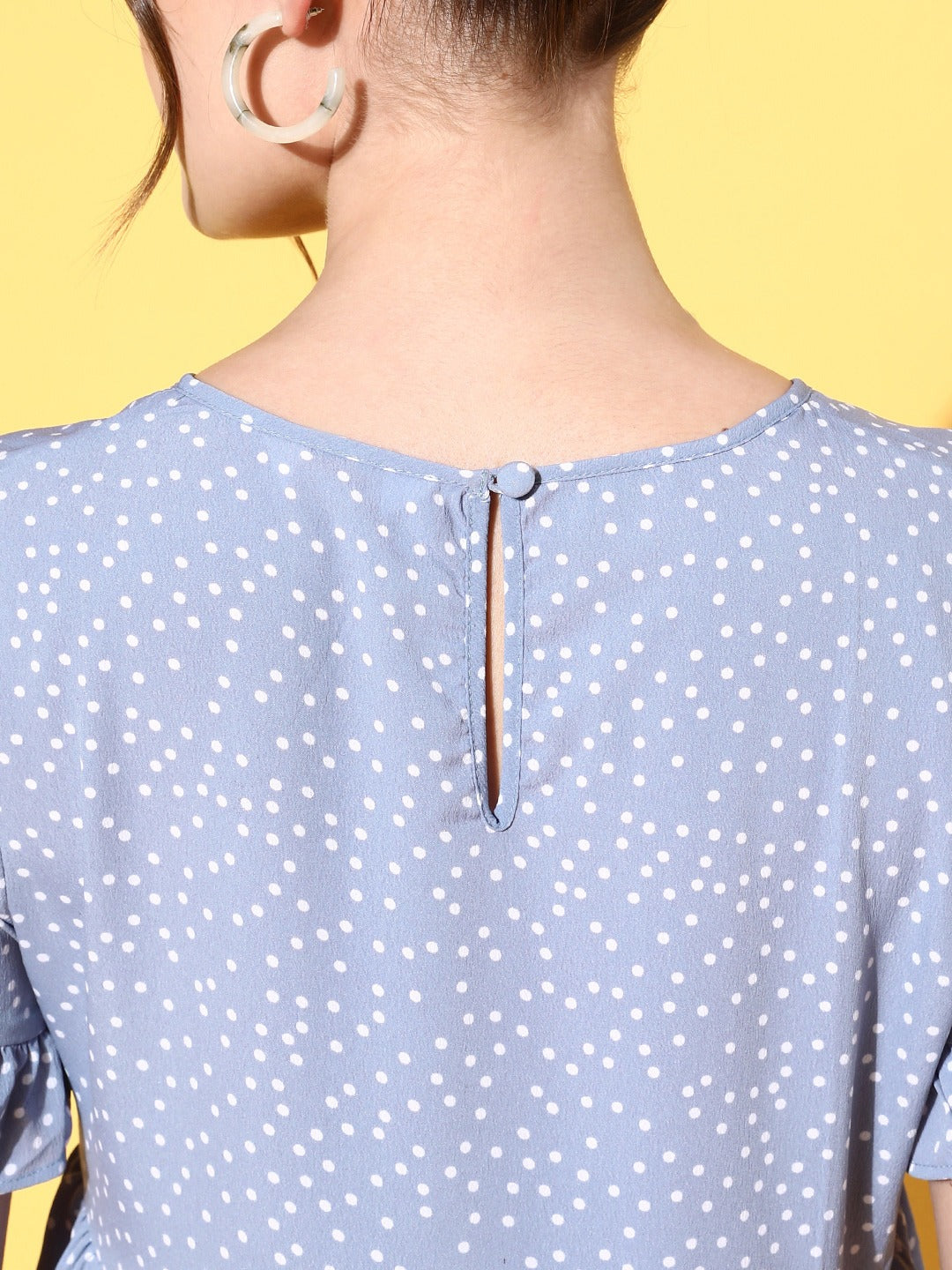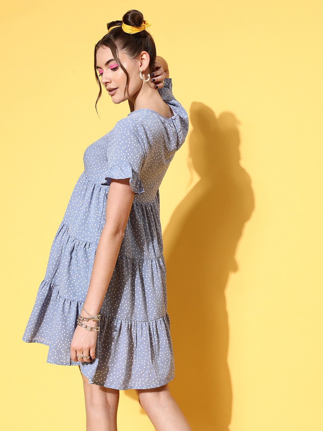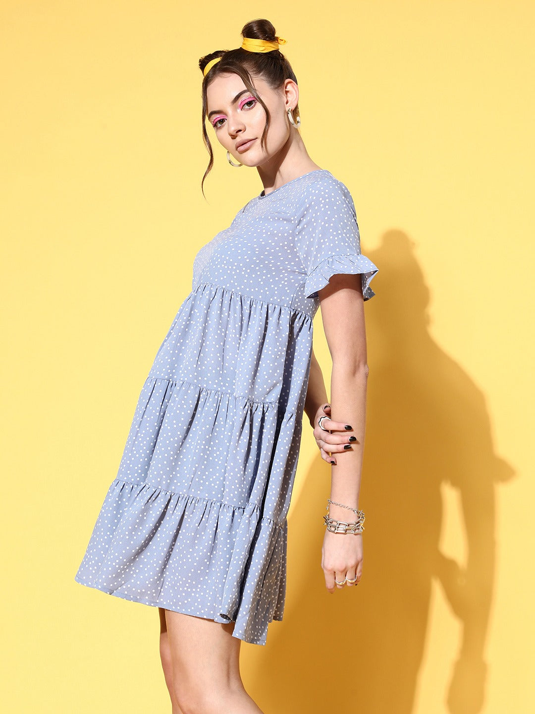 Berrylush Women Blue & White Polka Dot Printed Round Neck Crepe Flounce Hem Pleated A-Line Mini Dress