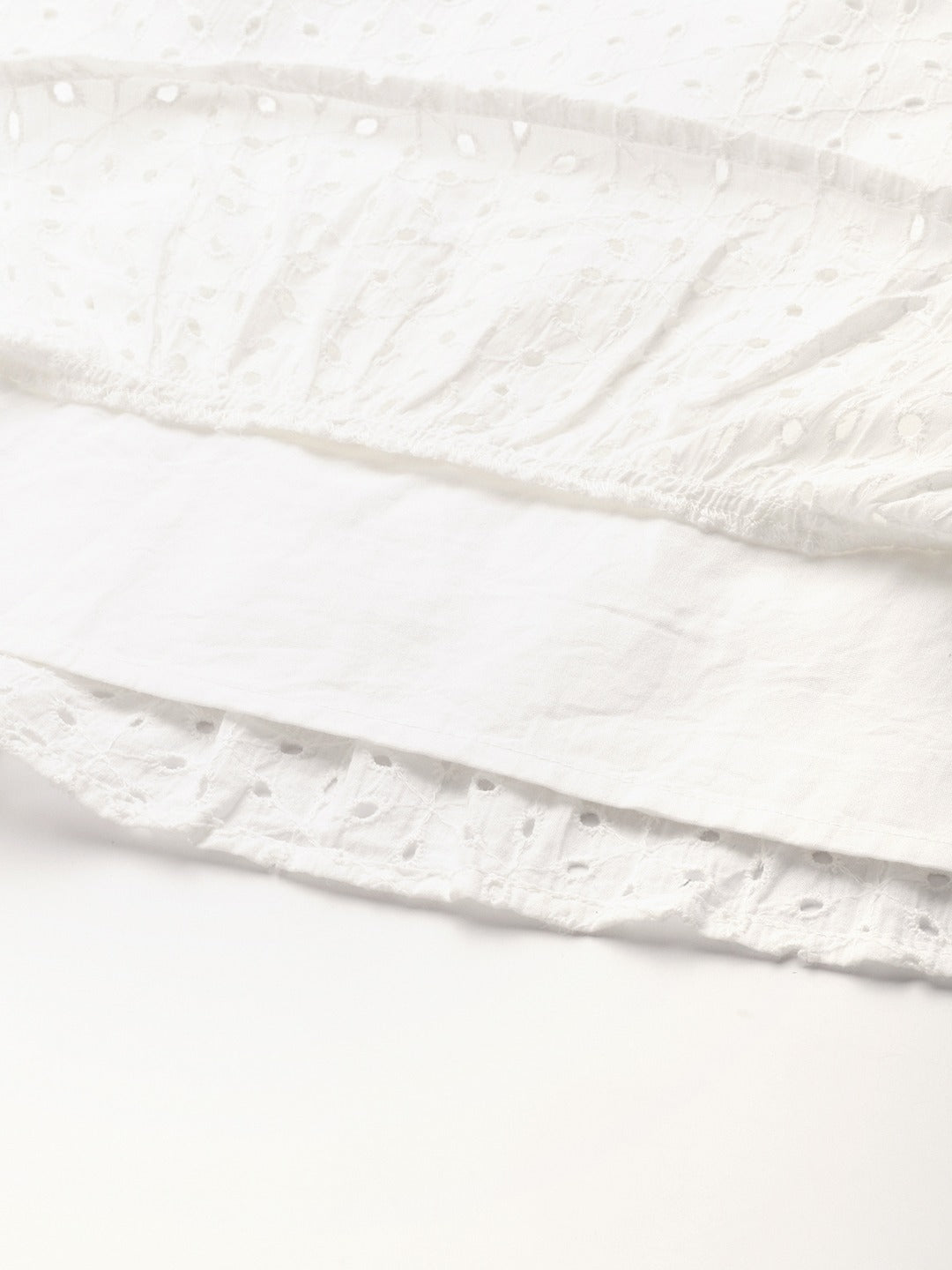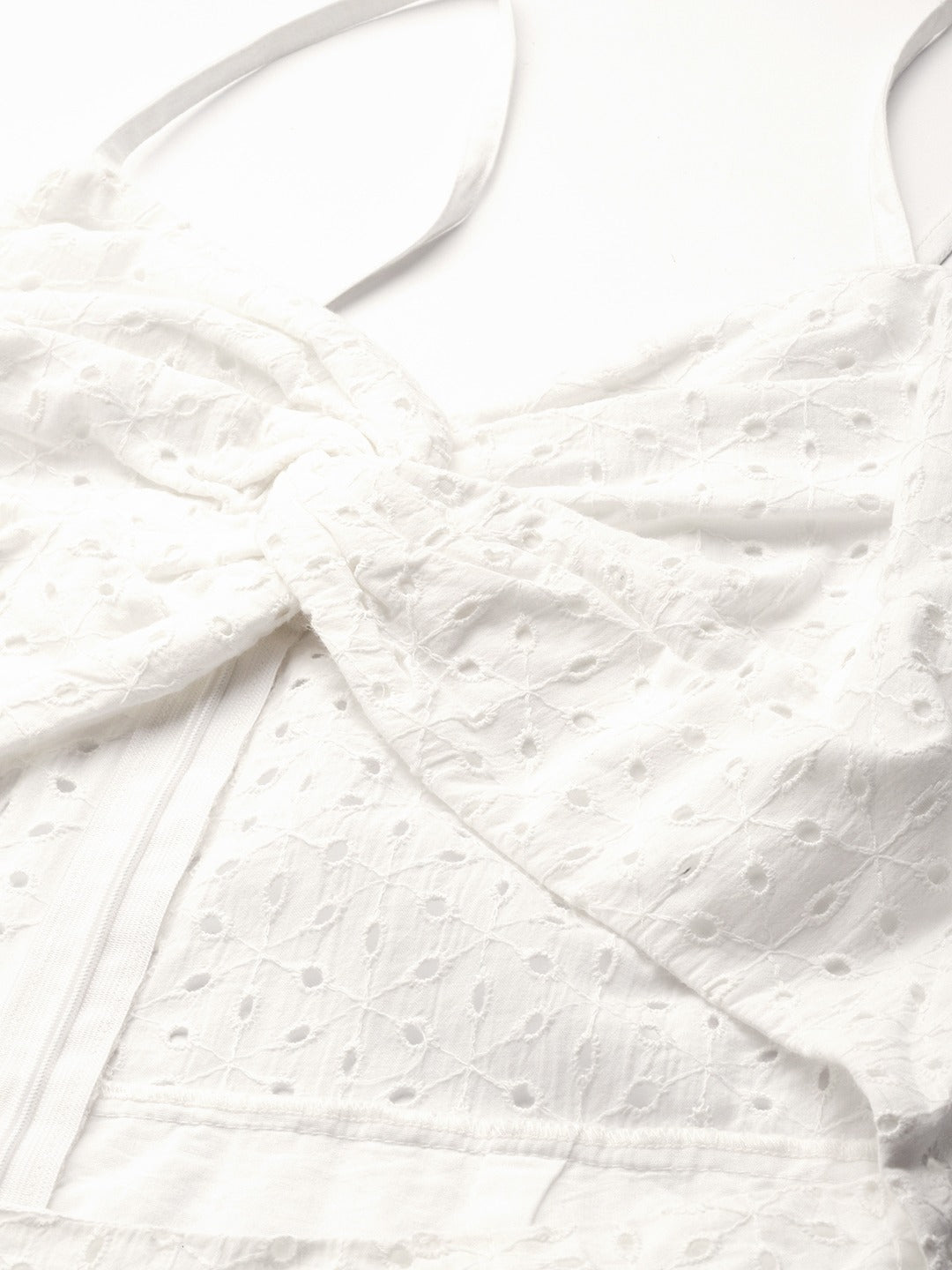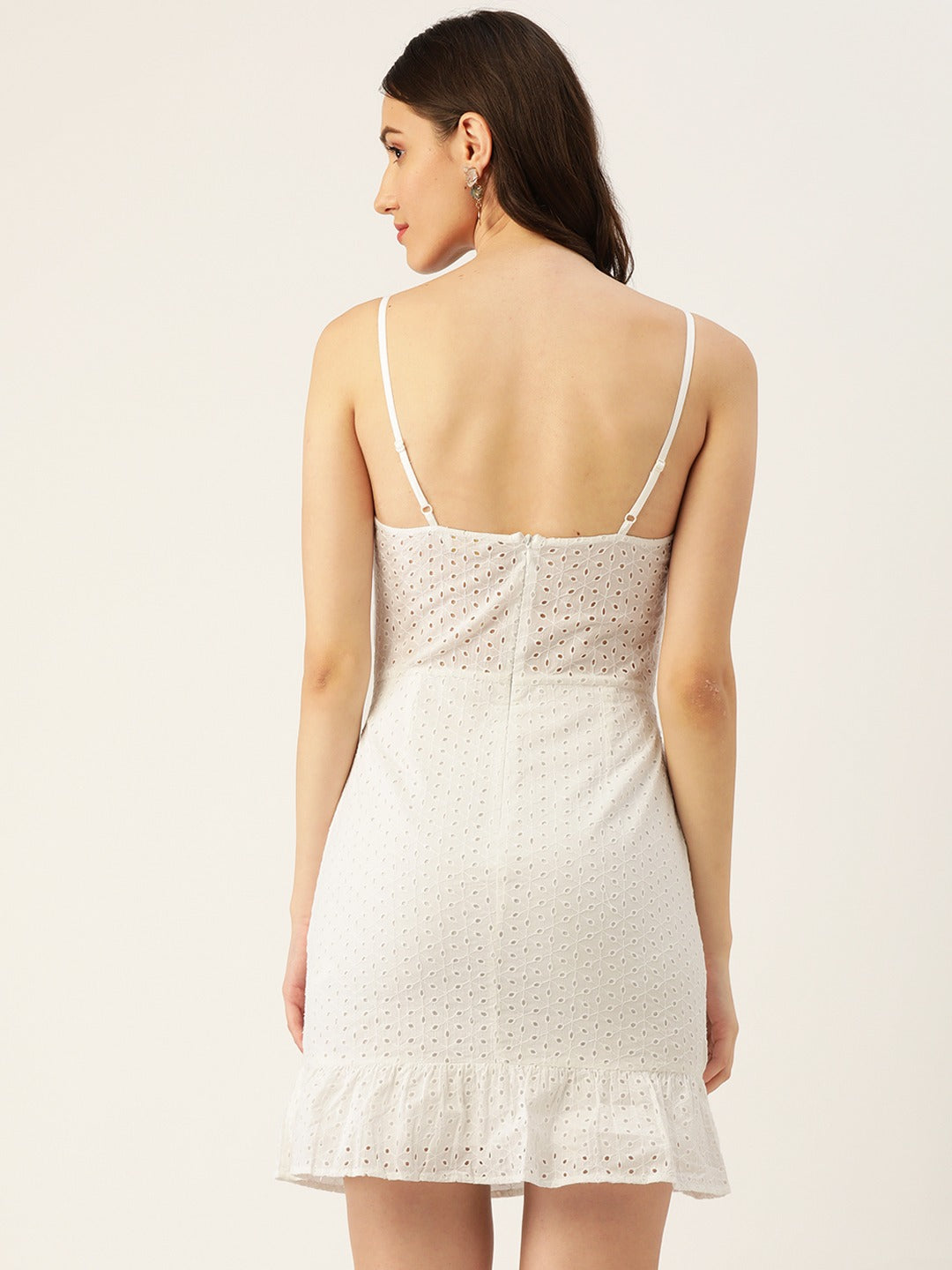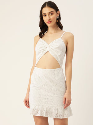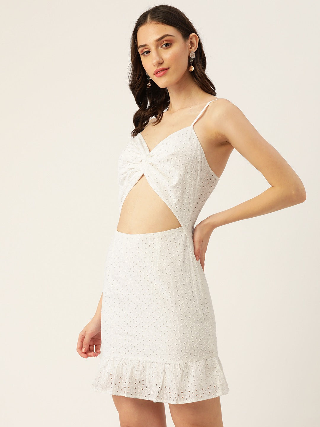 Berrylush Women Solid White Sweetheart Neck Front Cutout Schiffli Flounce Hem A-Line Mini Dress