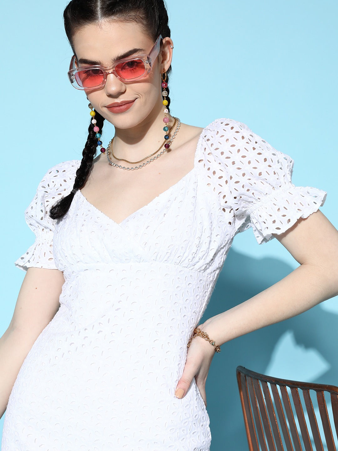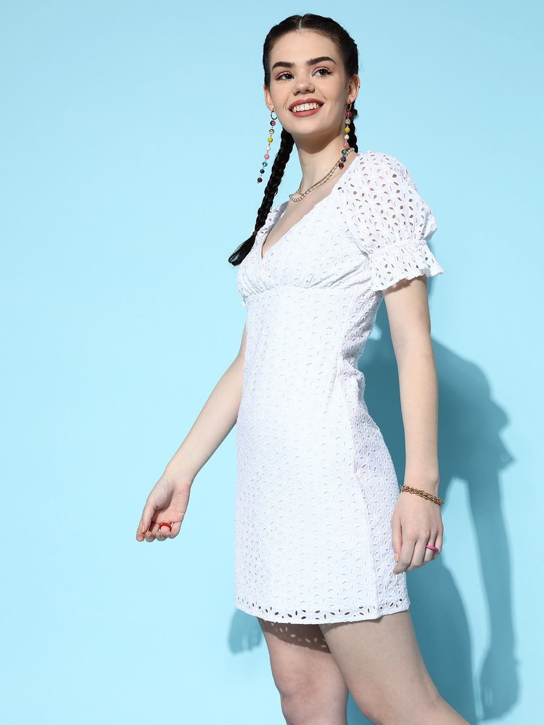 Seeking an equally elegant and chic statement piece then you can stop your search here with this beautiful Solid White Sweetheart Neck Schiffli Cotton Straight Hem Bodycon Mini Dress from Berrylush. Styled in mini length to keep this dress up-to-date with the latest trend and give your legs an enchanting appeal. White shade and schiffli pattern add a dose of femininity and eye-catching detail to this dress. Comes with concealed zip closure to offer easy, quick, and secure fastening along with a refined sheen. Enjoy an outdoor party with friends and family with a jaw-dropping look by wearing this mini dress with matching wedges, a contrasting handbag, and cool sunglasses.